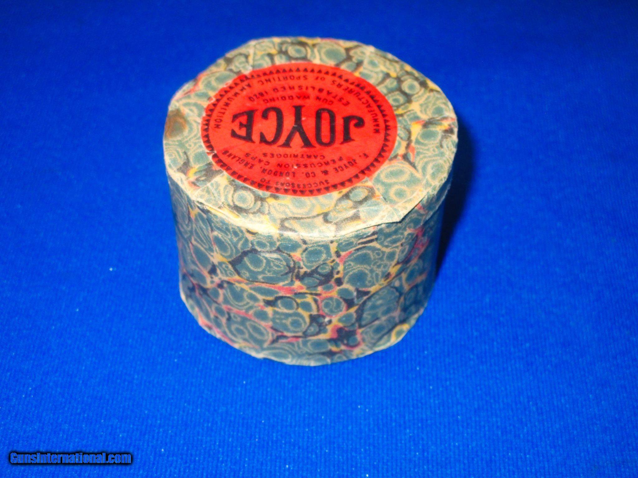 Description: A Very Scarce "Joyce" Paper Wrapped & Sealed 500 Count Foil Covered Percussion Cap Tin In Mint Untouched Condition. All original & complete. The mint tin has perfect "JOYCE" Labels on both the top and side as shown. The outer paper camo color covering the tin is also in perfect condition. The tin measures 2 1/4 inches in diameter. This Is A Wonderful & Very Hard To Find Mint Example Of A "JOYCE" Paper Wrapped 500 Count Percussion Cap Tin. It would be used in a large frame percussion revolver set. This Rare Percussion Revolver Cap Tin Would Be Nearly Impossible To Beat In Condition! We do not sell or ship any Antique Guns or Antique Ammo to anywhere in New York State. SOLD |
