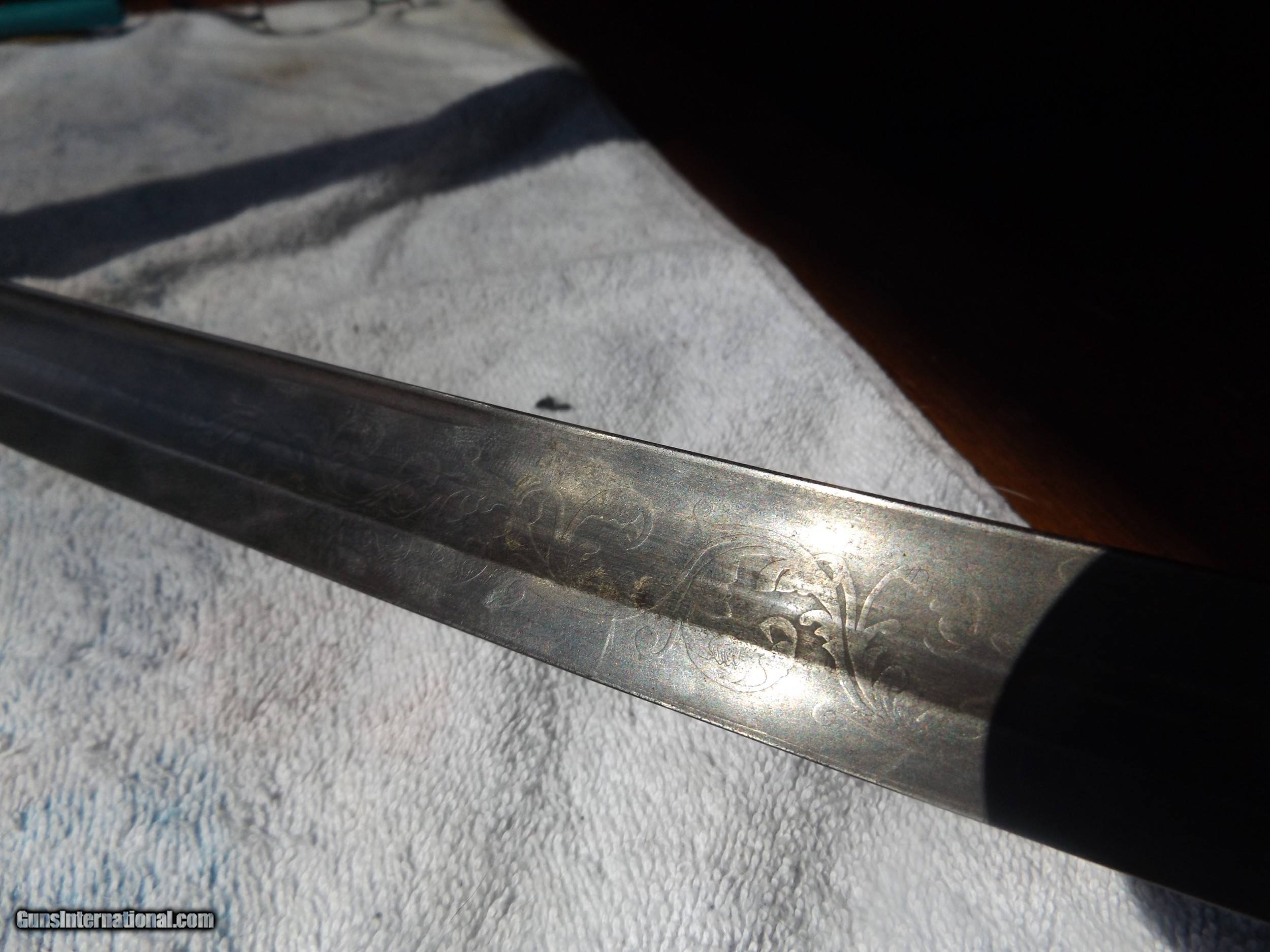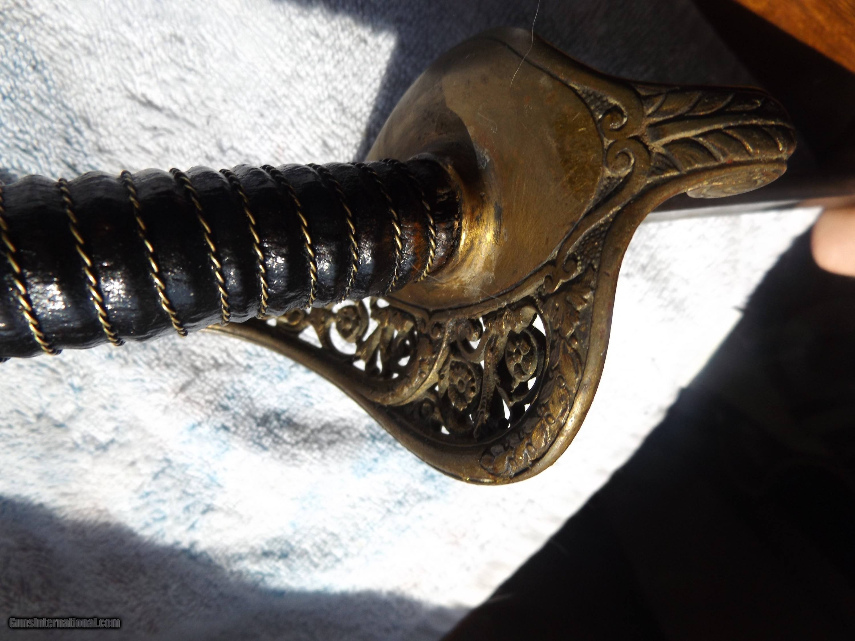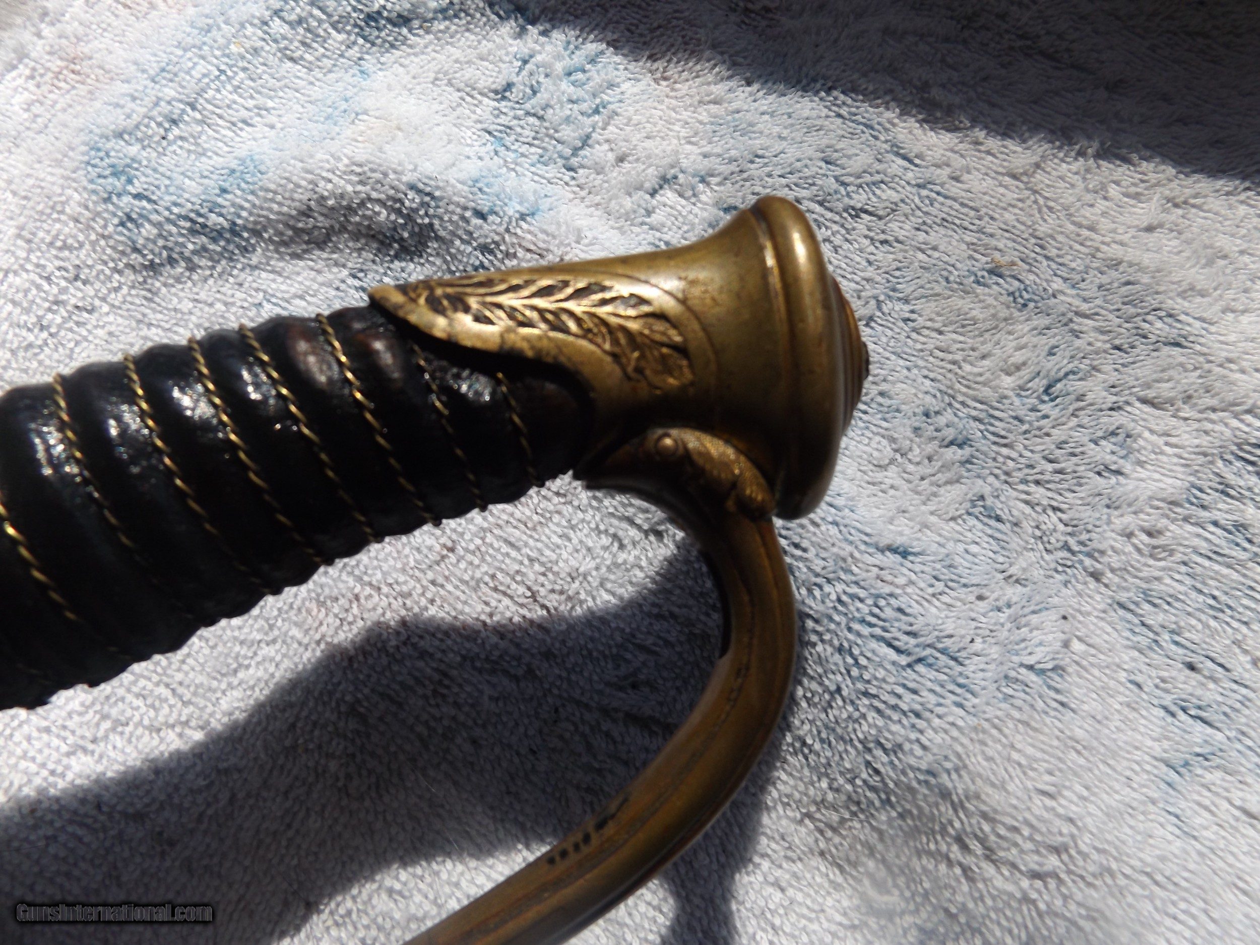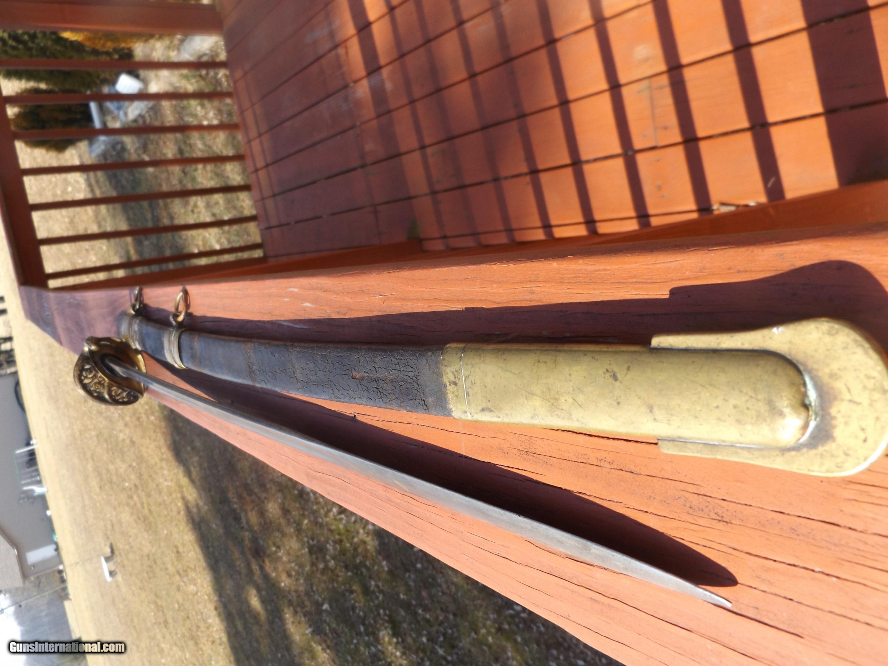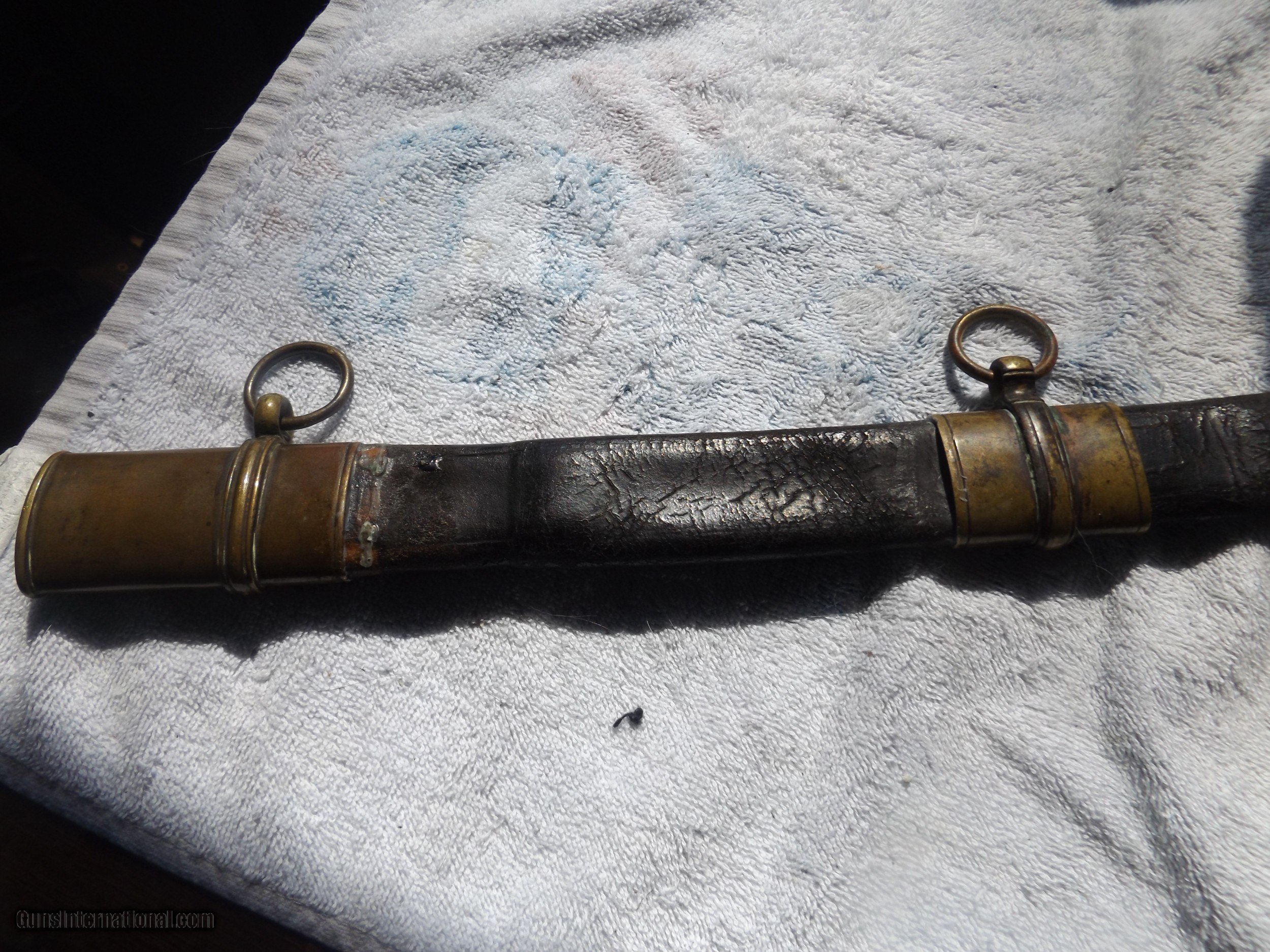 Description: This is an original model 1850 Foot Officers sword and leather scabbard. I think the scabbard is not an Ames scabbard as there are no stamps on the top of the throat. But it is a Period original. The sword retains all of the etching on the blade but some of it is weak. The blades ricasso is etched with Ames Mfg., Chicopee Mass.The U.S. is shown in the photos All of the Rayskin on the grip has worn away but the twisted brass wire is complete. The length of the blade has a few nicks that I show in the photo's Shipping is $20.00 and includes a tracking number. SOLD |