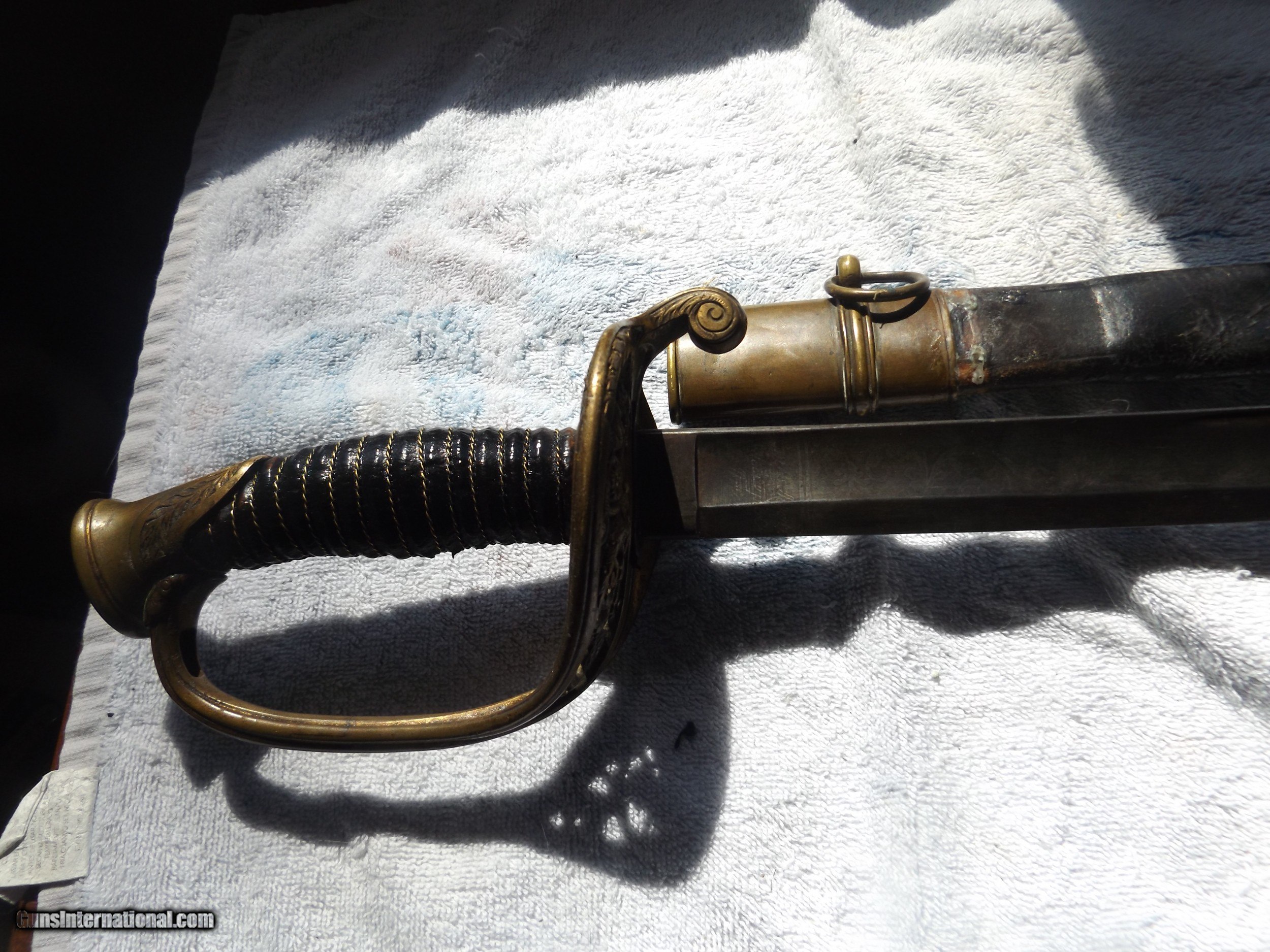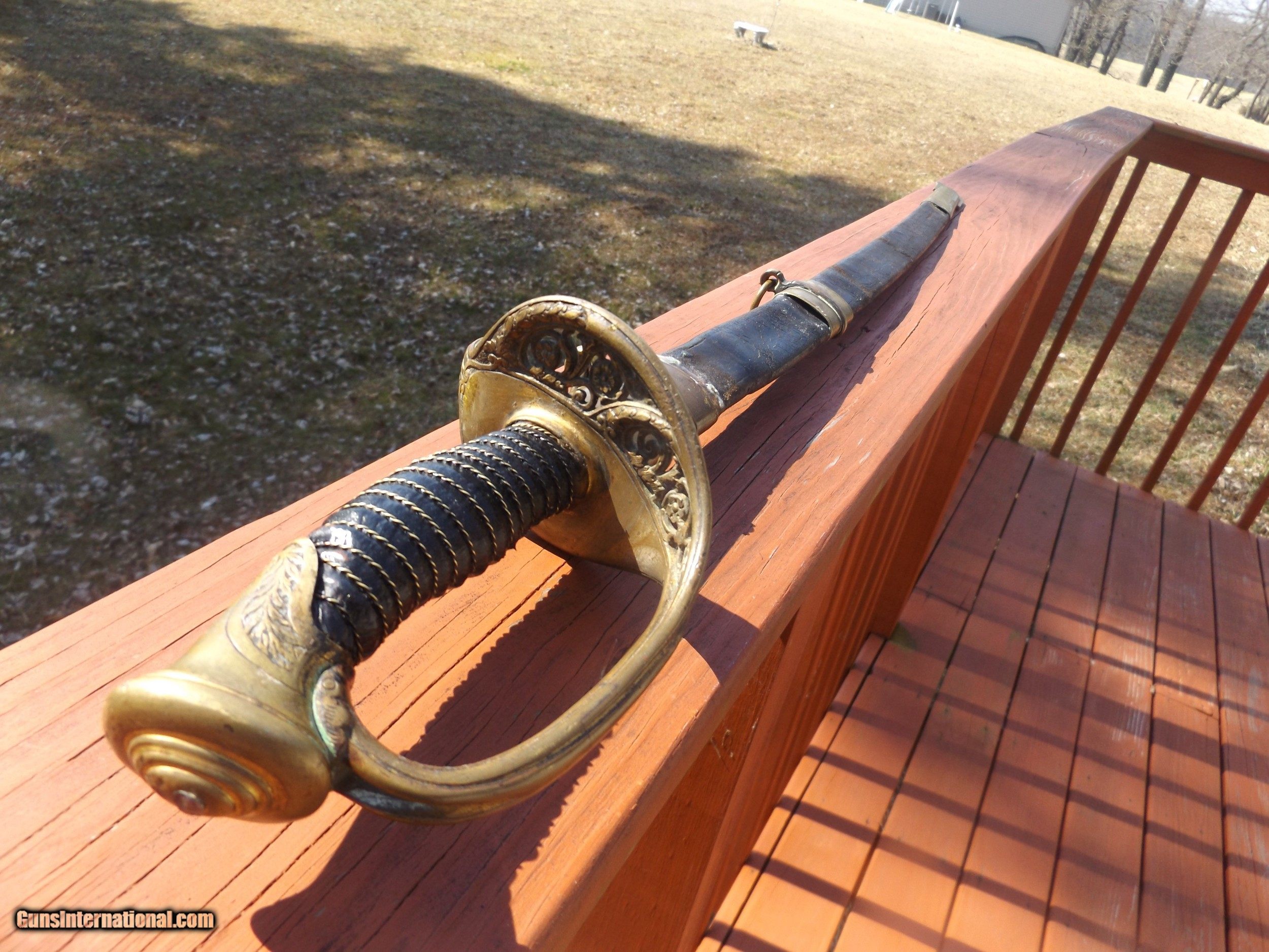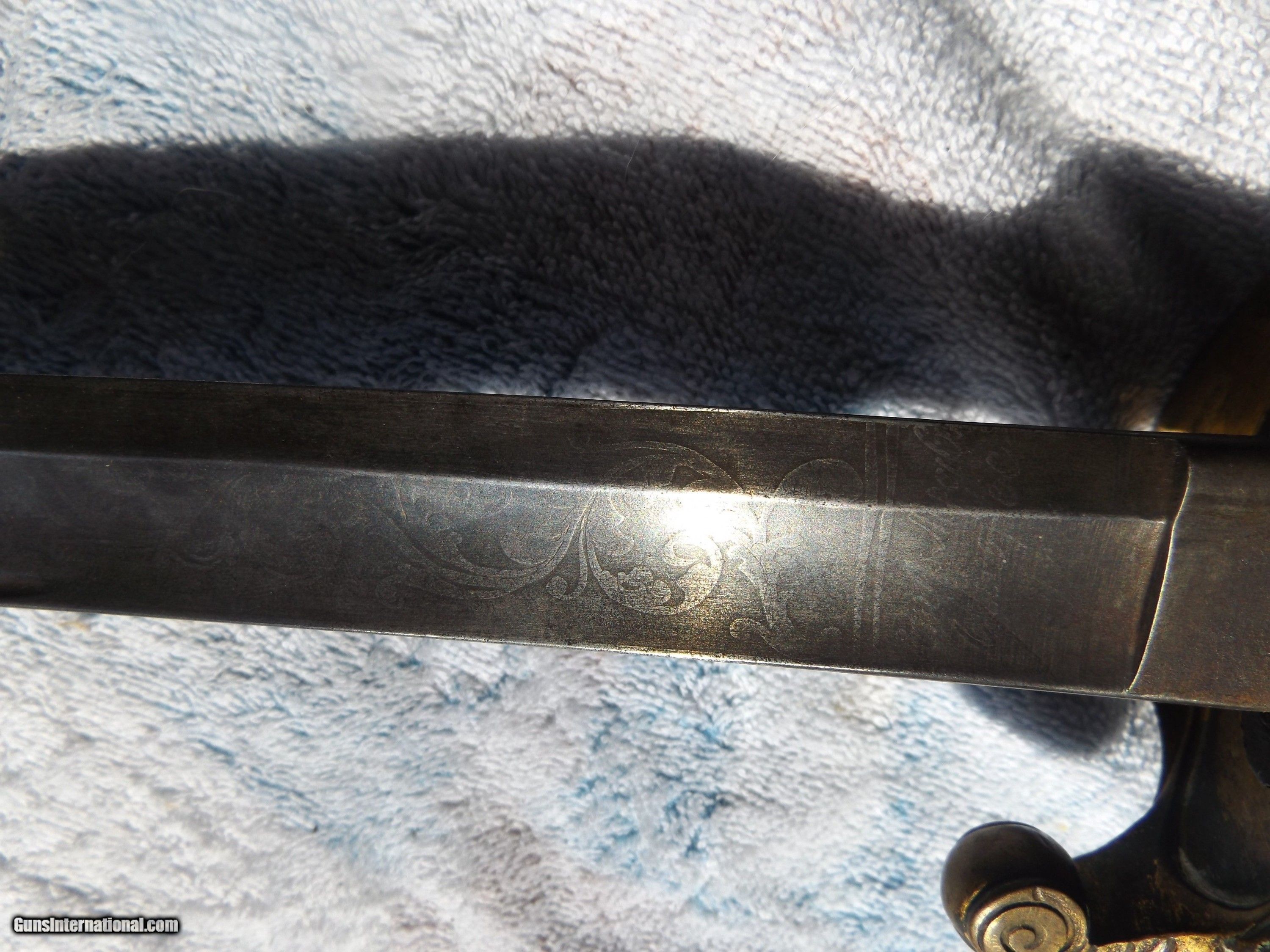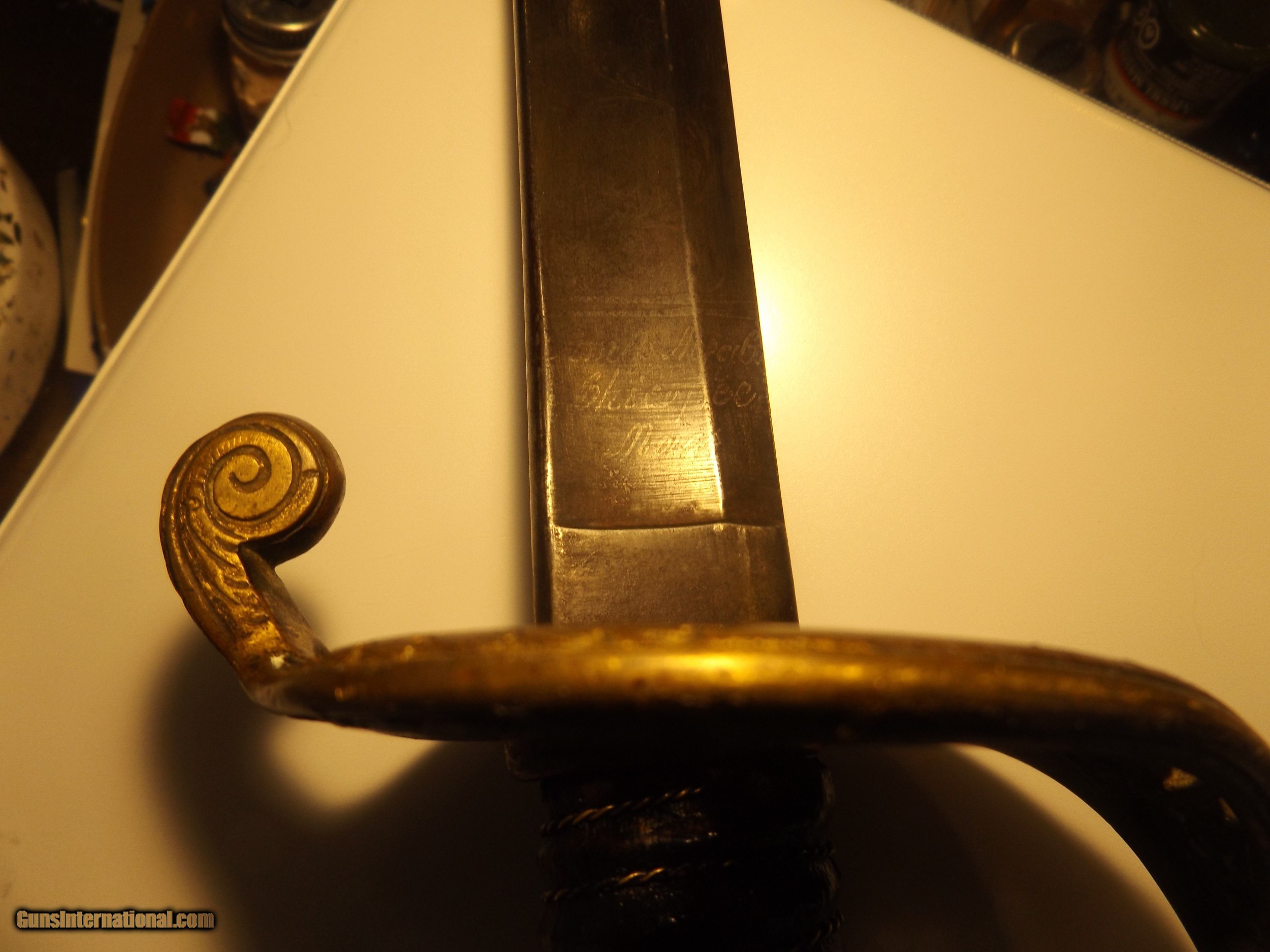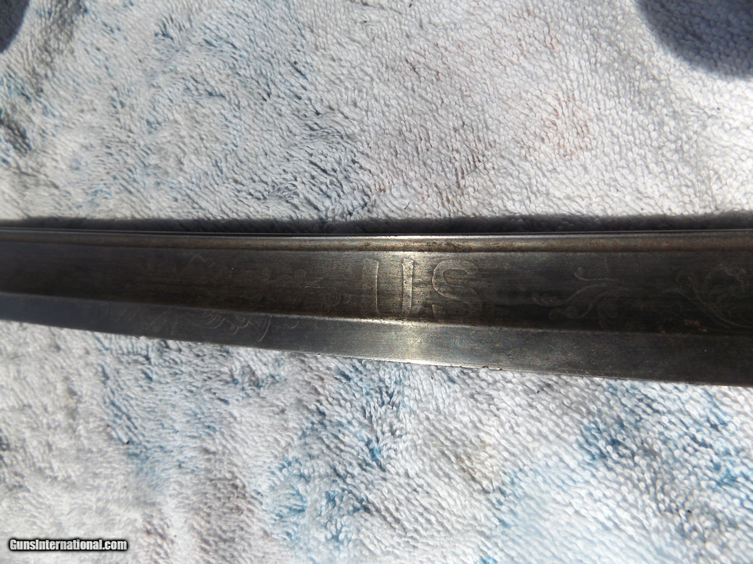 Description: This is an original model 1850 Foot Officers sword and leather scabbard. I think the scabbard is not an Ames scabbard as there are no stamps on the top of the throat. But it is a Period original. The sword retains all of the etching on the blade but some of it is weak. The blades ricasso is etched with Ames Mfg., Chicopee Mass.The U.S. is shown in the photos All of the Rayskin on the grip has worn away but the twisted brass wire is complete. The length of the blade has a few nicks that I show in the photo's Shipping is $20.00 and includes a tracking number. SOLD |