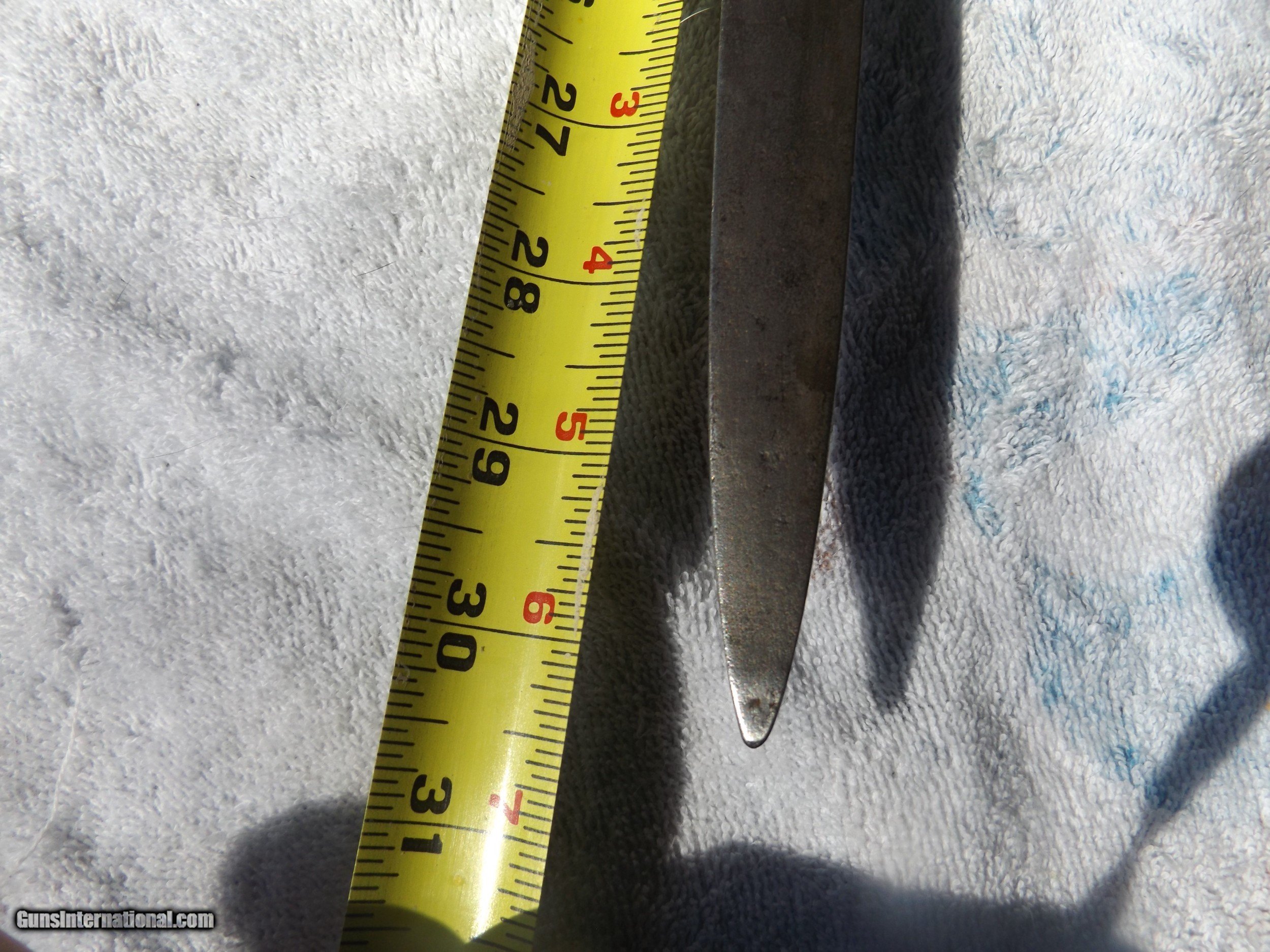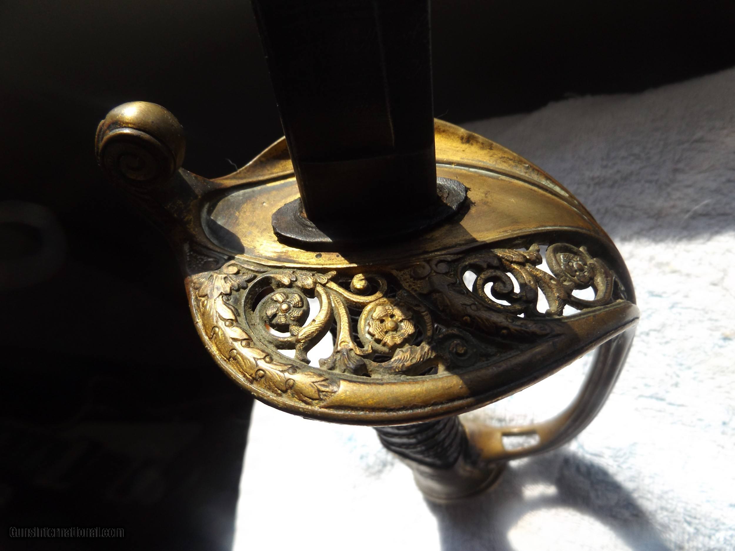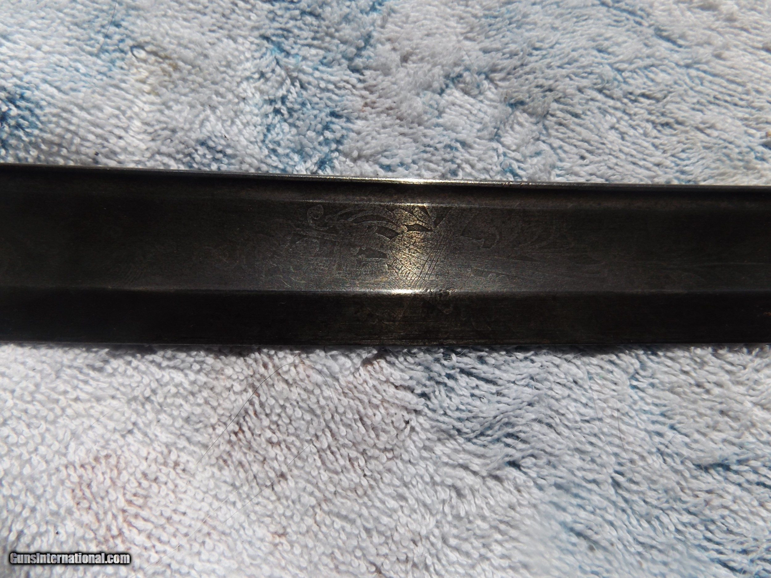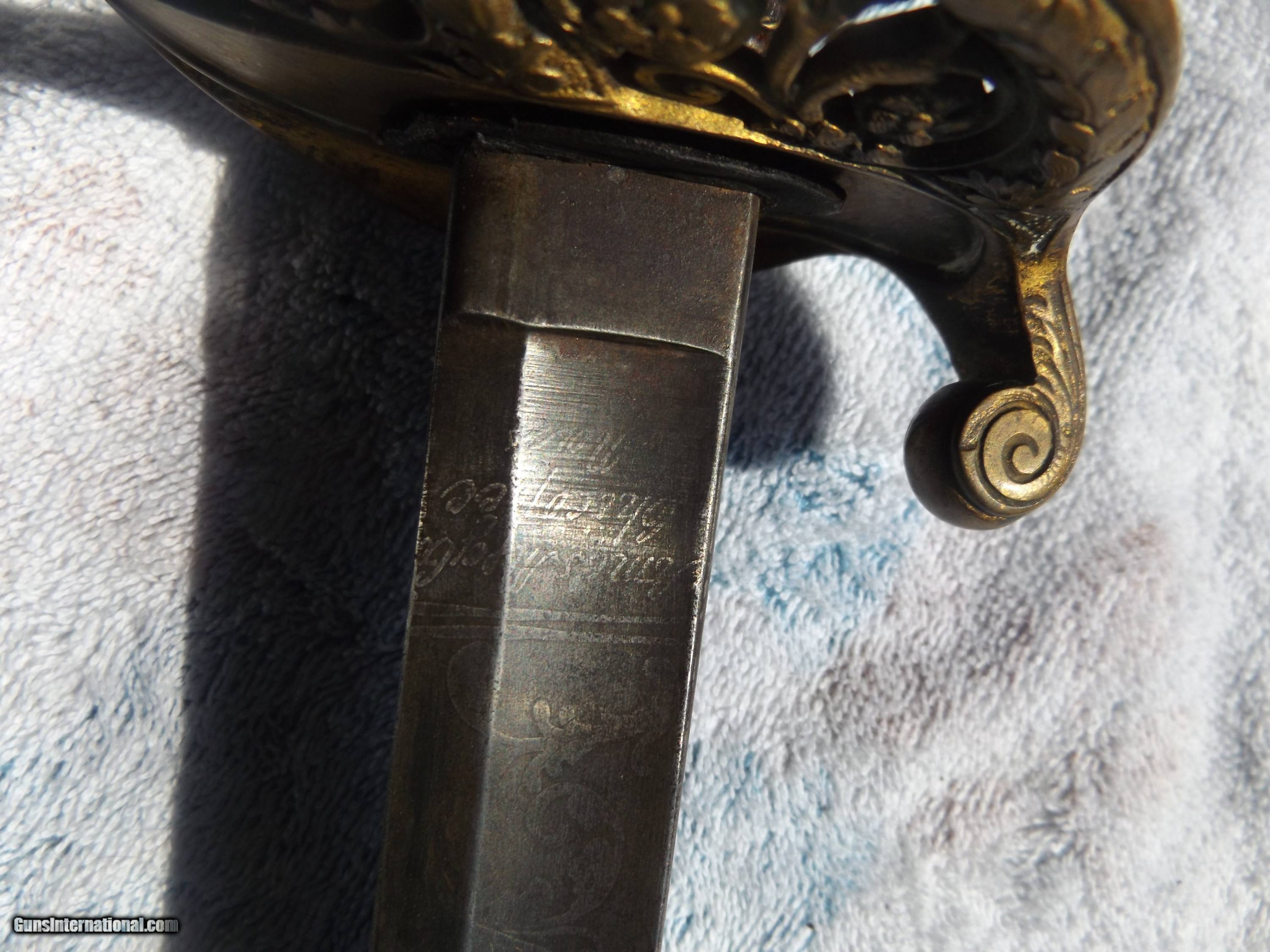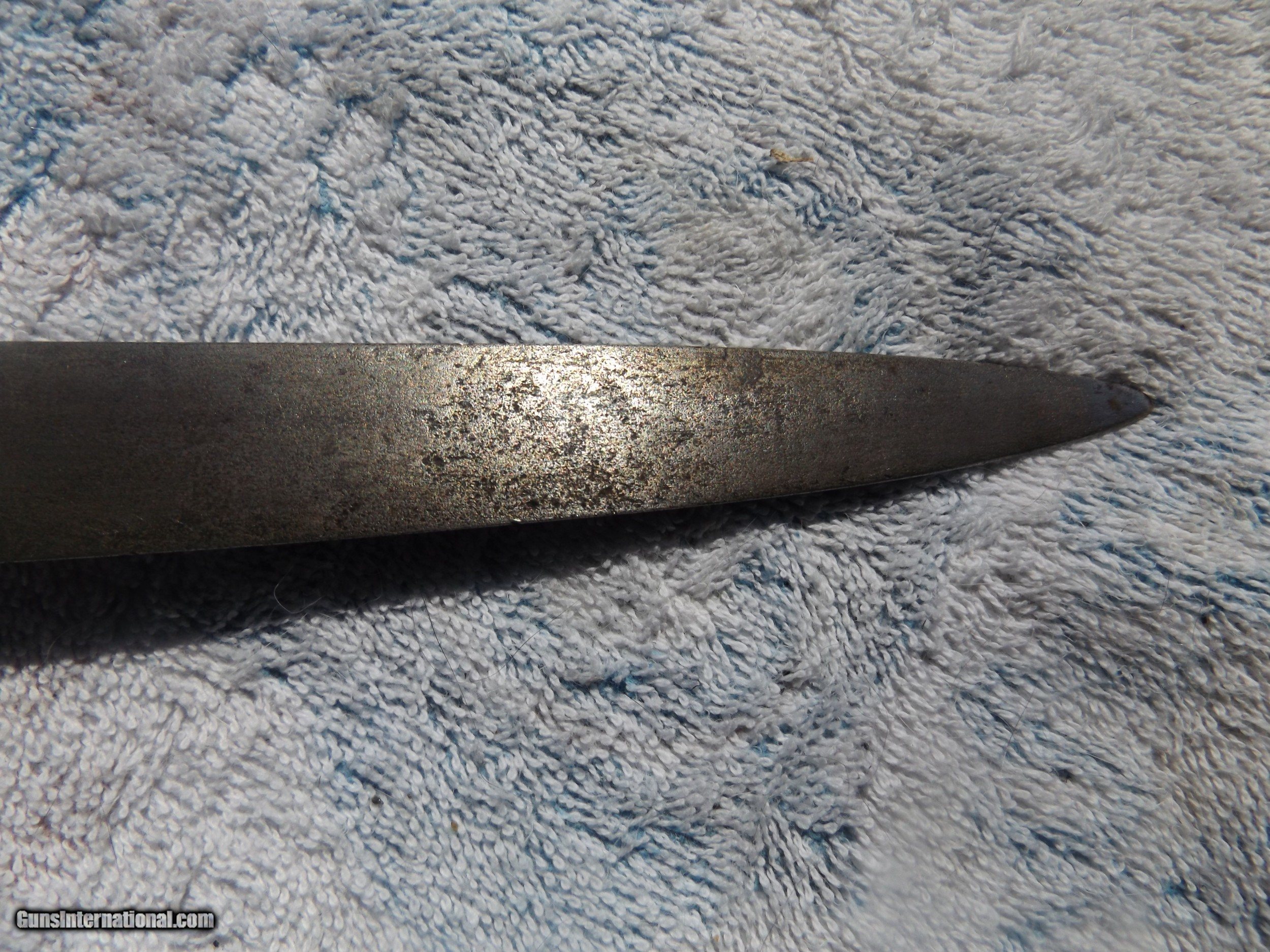 Description: This is an original model 1850 Foot Officers sword and leather scabbard. I think the scabbard is not an Ames scabbard as there are no stamps on the top of the throat. But it is a Period original. The sword retains all of the etching on the blade but some of it is weak. The blades ricasso is etched with Ames Mfg., Chicopee Mass.The U.S. is shown in the photos All of the Rayskin on the grip has worn away but the twisted brass wire is complete. The length of the blade has a few nicks that I show in the photo's Shipping is $20.00 and includes a tracking number. SOLD |
