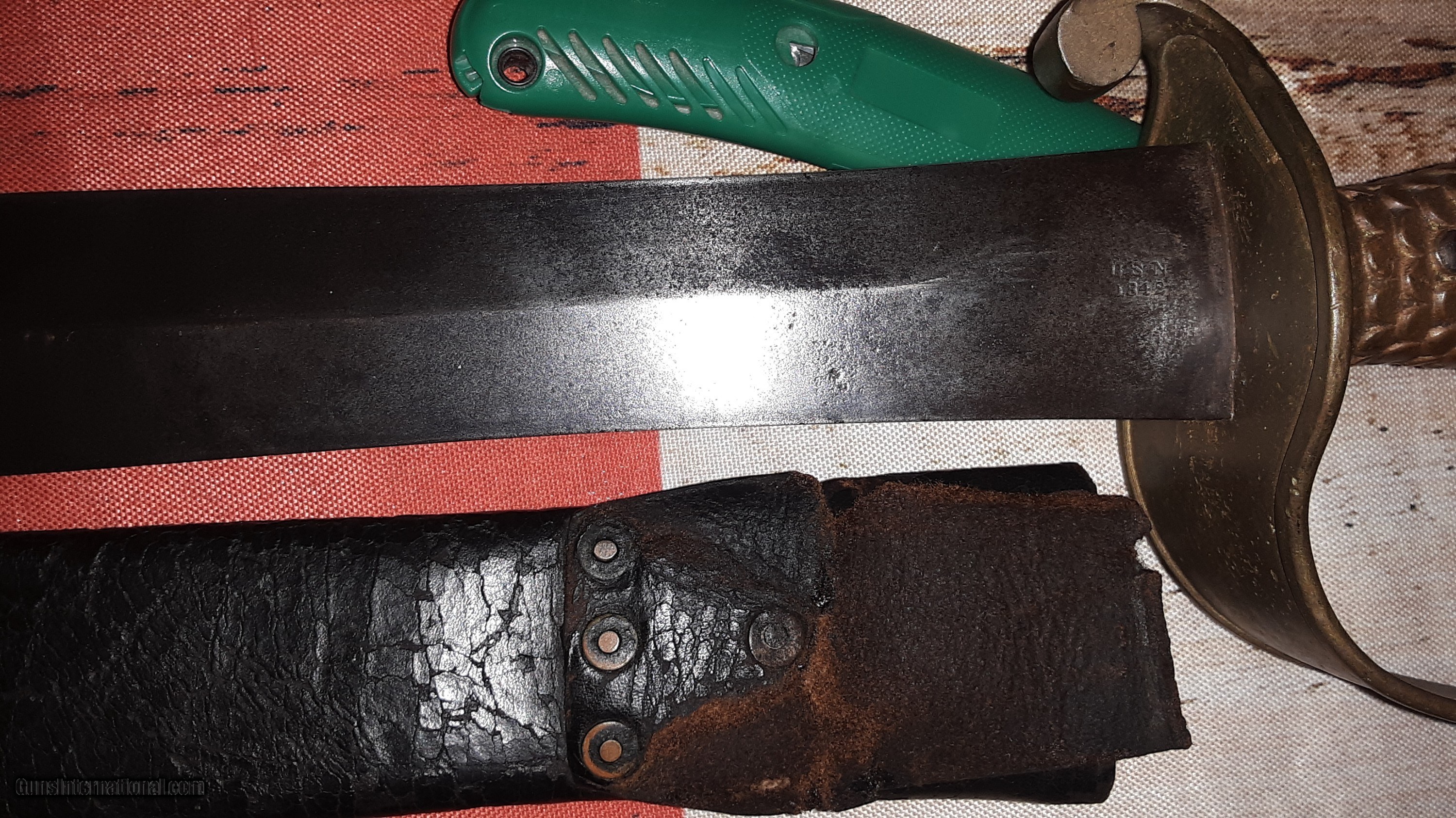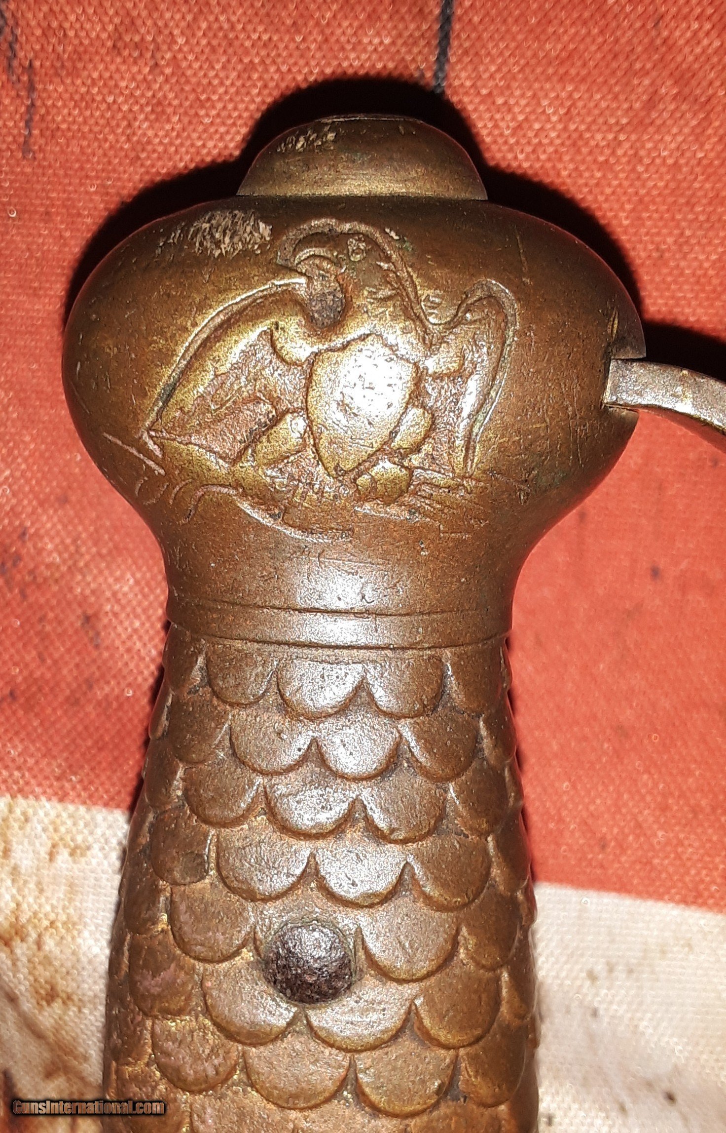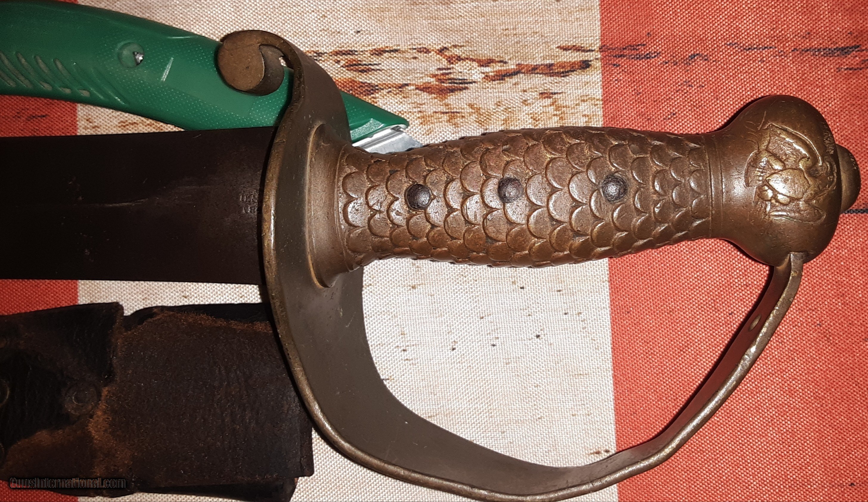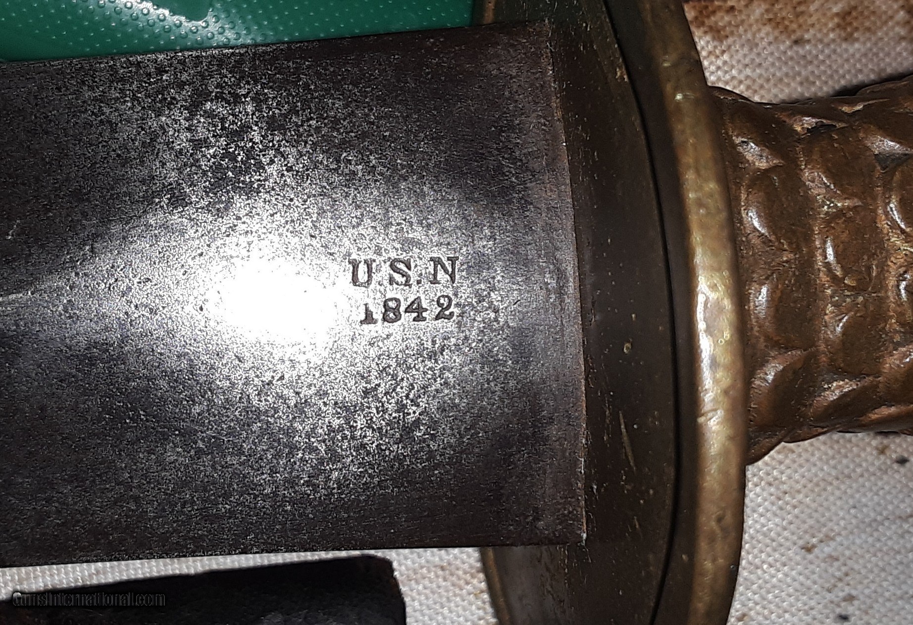 Description: Offered here is a nice-looking Model 1841 Naval Cutlass with Scabbard made by Ames in the first year of production. The first contract for these cutlasses was signed in late 1841, and the first swords were produced in 1842. The cutlass is patterned after the Model 1832 Foot Artillery Sword, having the same brass fish scale style grip with eagles on each side of the pommel, but with a large “D” guard for extra hand protection. The cutlass has a relatively short blade to allow for fighting in close quarters as may be found on the deck of a ship. These cutlasses are relatively rare as only 6600 of them were made by the time production ceased in 1847, and they are particularly difficult to find with an original riveted style scabbard. One side of the blade is clearly stamped “N. P. AMES/CABOTVILLE/MASS” and the other side has “U.S.N./1842”. When found it appeared to have been untouched and neglected for years. I cleaned off the light coat of active surface rust that was covering the blade with a non-scratch pad and gun oil. The blade remains somewhat dark and gray, and the brass hilt retains its dark aged patina. The rare scabbard remains relatively strong and despite missing the belt loop and the very tip at the end, presents very well. Please take a look at all the photos as they provide the best description of condition. Shipping to the lower 48 contiguous states. Shipping charge $35 towards cost of Priority Mail with full insurance. Three day return privilege, buyer pays return shipping. SOLD |