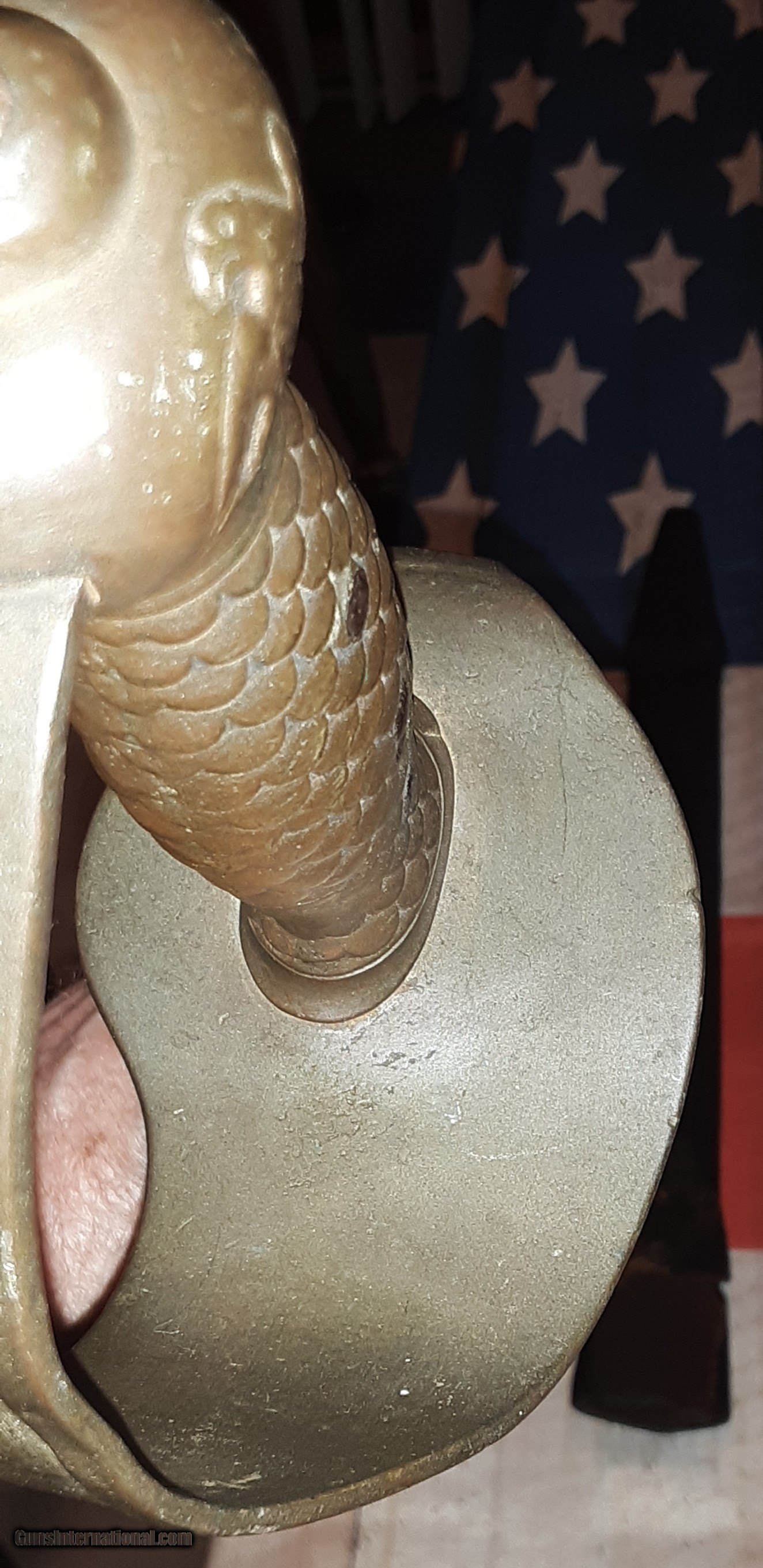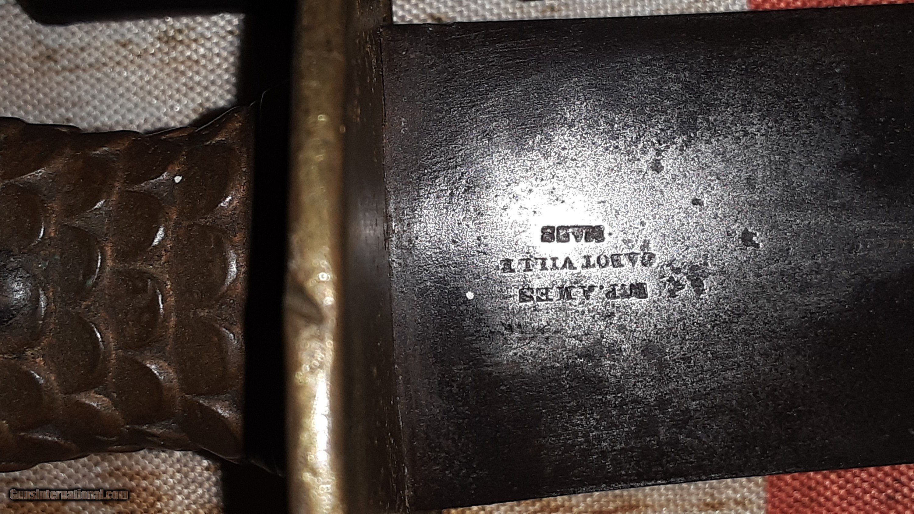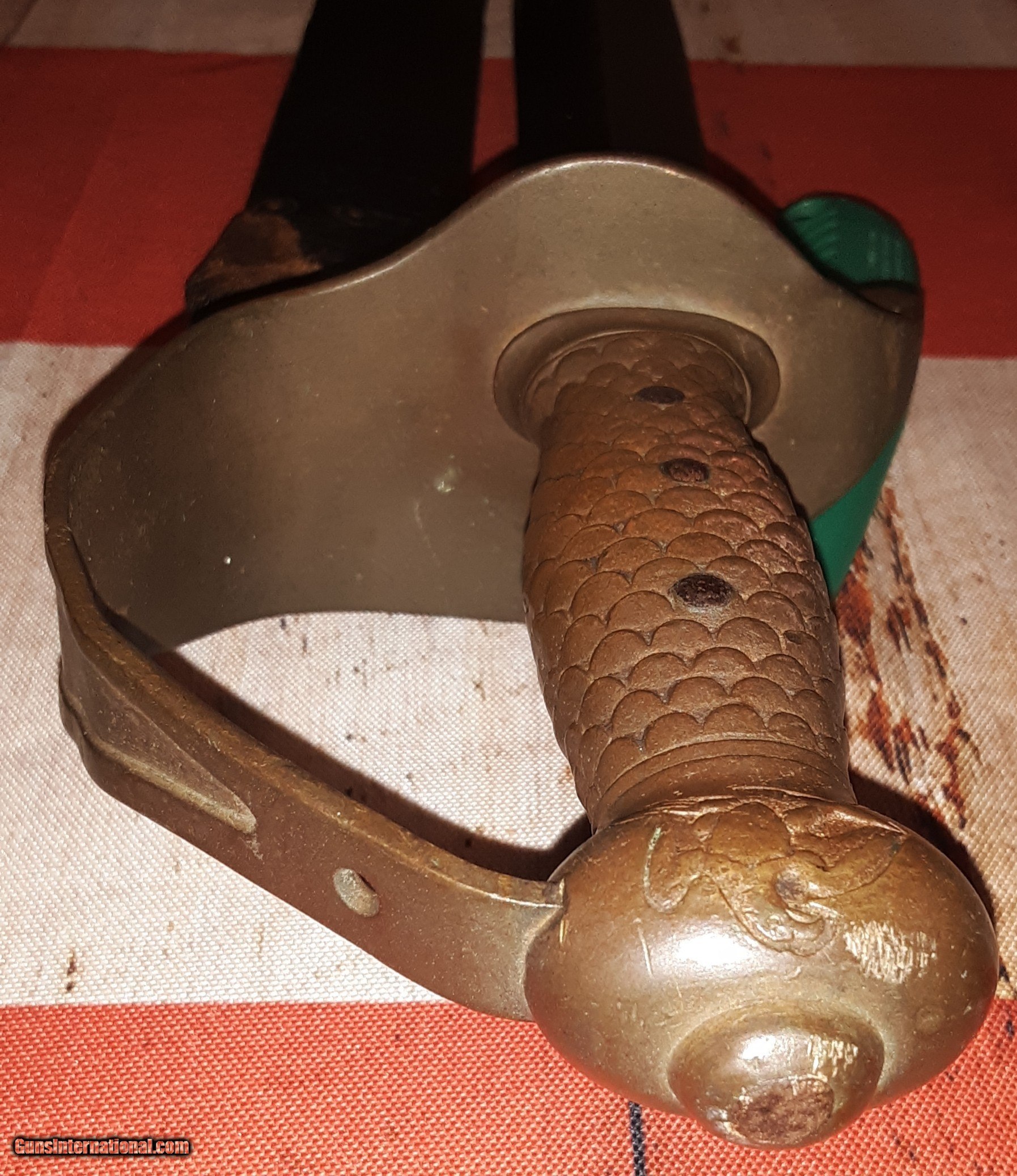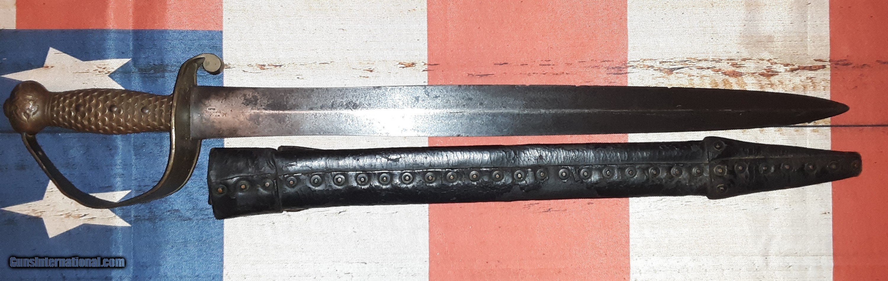 Description: Offered here is a nice-looking Model 1841 Naval Cutlass with Scabbard made by Ames in the first year of production. The first contract for these cutlasses was signed in late 1841, and the first swords were produced in 1842. The cutlass is patterned after the Model 1832 Foot Artillery Sword, having the same brass fish scale style grip with eagles on each side of the pommel, but with a large “D” guard for extra hand protection. The cutlass has a relatively short blade to allow for fighting in close quarters as may be found on the deck of a ship. These cutlasses are relatively rare as only 6600 of them were made by the time production ceased in 1847, and they are particularly difficult to find with an original riveted style scabbard. One side of the blade is clearly stamped “N. P. AMES/CABOTVILLE/MASS” and the other side has “U.S.N./1842”. When found it appeared to have been untouched and neglected for years. I cleaned off the light coat of active surface rust that was covering the blade with a non-scratch pad and gun oil. The blade remains somewhat dark and gray, and the brass hilt retains its dark aged patina. The rare scabbard remains relatively strong and despite missing the belt loop and the very tip at the end, presents very well. Please take a look at all the photos as they provide the best description of condition. Shipping to the lower 48 contiguous states. Shipping charge $35 towards cost of Priority Mail with full insurance. Three day return privilege, buyer pays return shipping. SOLD |