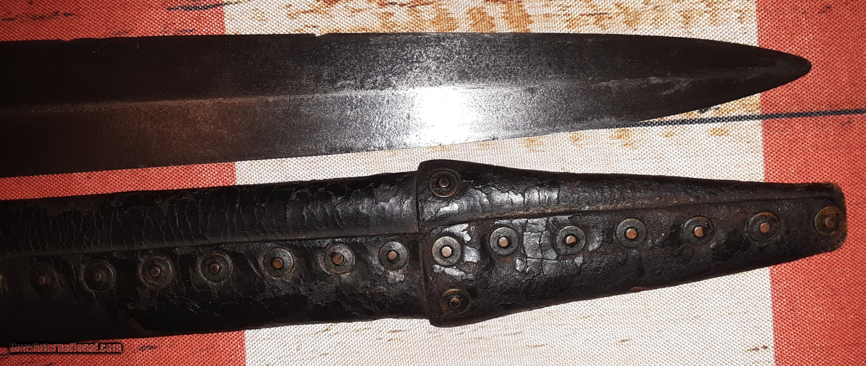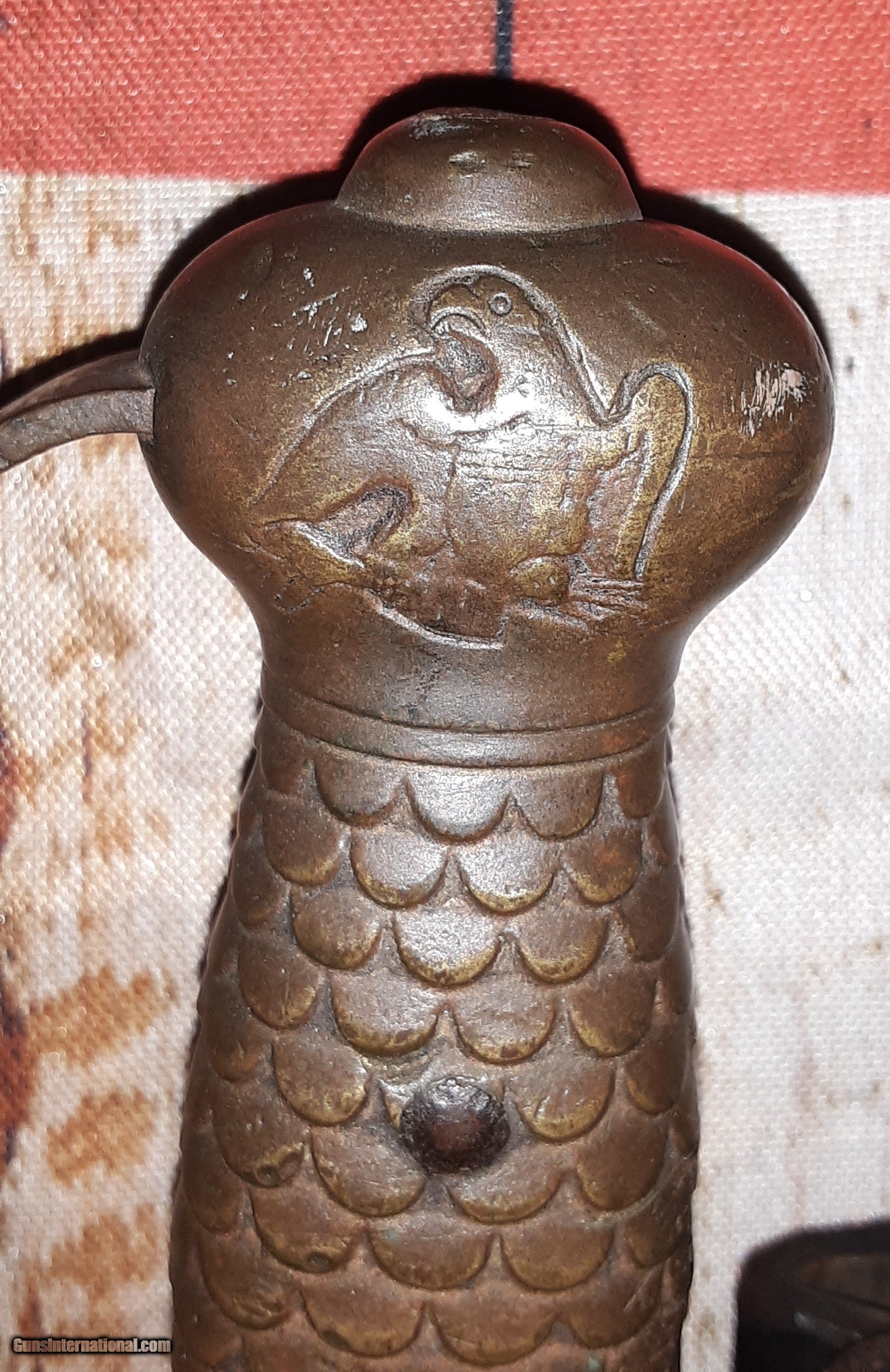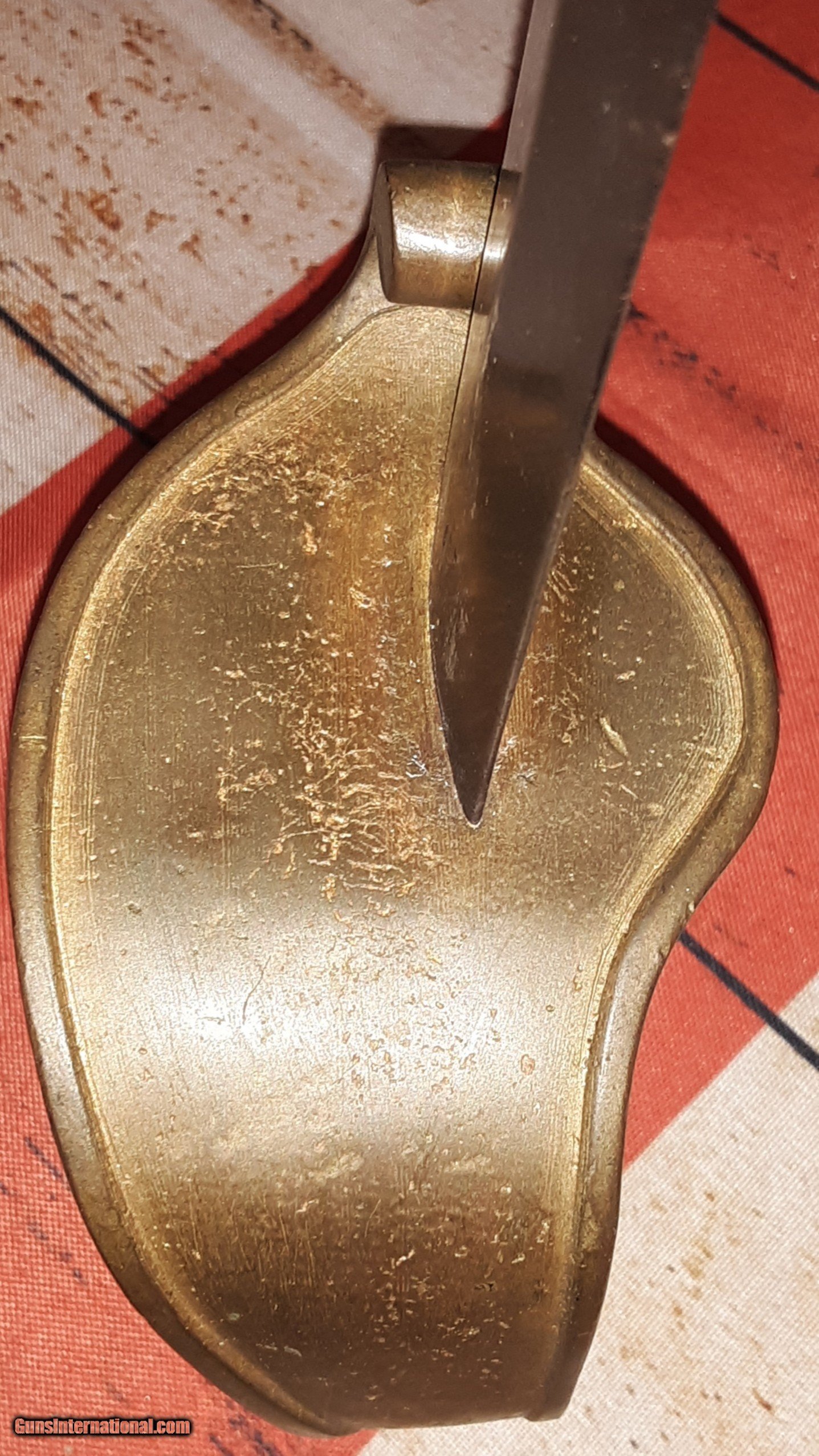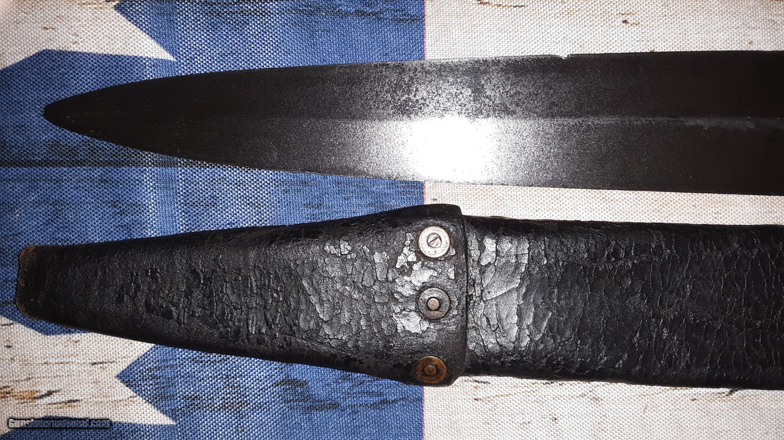 Description: Offered here is a nice-looking Model 1841 Naval Cutlass with Scabbard made by Ames in the first year of production. The first contract for these cutlasses was signed in late 1841, and the first swords were produced in 1842. The cutlass is patterned after the Model 1832 Foot Artillery Sword, having the same brass fish scale style grip with eagles on each side of the pommel, but with a large “D” guard for extra hand protection. The cutlass has a relatively short blade to allow for fighting in close quarters as may be found on the deck of a ship. These cutlasses are relatively rare as only 6600 of them were made by the time production ceased in 1847, and they are particularly difficult to find with an original riveted style scabbard. One side of the blade is clearly stamped “N. P. AMES/CABOTVILLE/MASS” and the other side has “U.S.N./1842”. When found it appeared to have been untouched and neglected for years. I cleaned off the light coat of active surface rust that was covering the blade with a non-scratch pad and gun oil. The blade remains somewhat dark and gray, and the brass hilt retains its dark aged patina. The rare scabbard remains relatively strong and despite missing the belt loop and the very tip at the end, presents very well. Please take a look at all the photos as they provide the best description of condition. Shipping to the lower 48 contiguous states. Shipping charge $35 towards cost of Priority Mail with full insurance. Three day return privilege, buyer pays return shipping. SOLD |