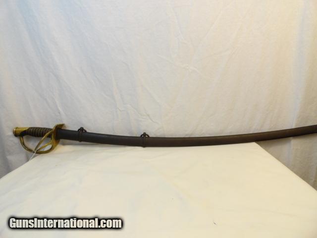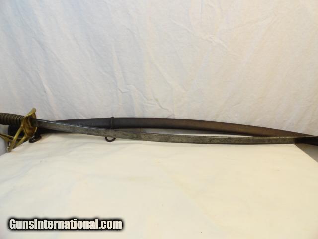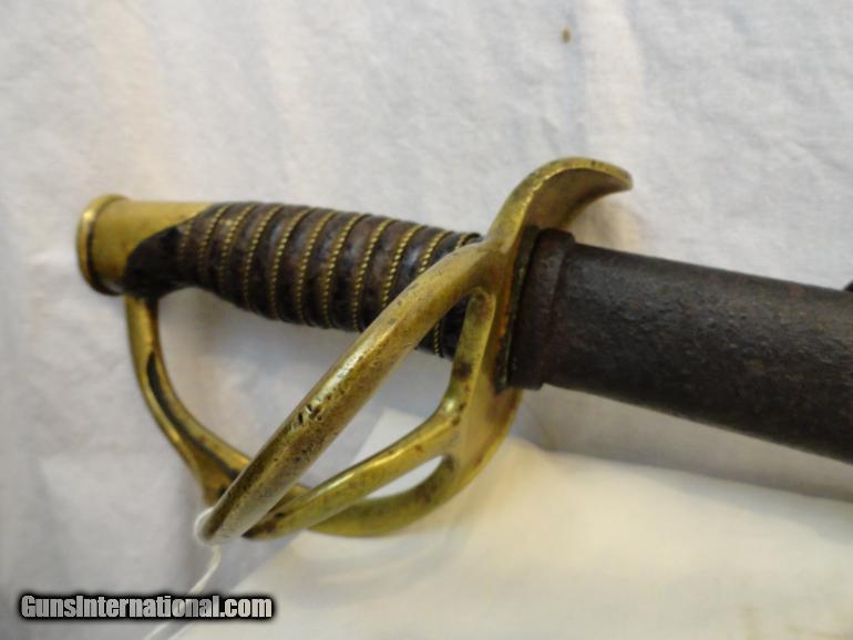Pretty standard Civil War weapon. Hilt is stamped Ames , Chicoppe MA 1862 and inspector marks. Blade has perfect tip, is a nice overall patina and does not appear to have ever been sharpened. The leather wrapped handle still has all the gold braid. Brass hand guard is lovely uncleaned patina. Scabbard is basically a bumpy dark brown.