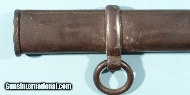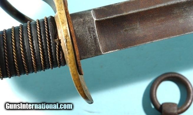 Description: AMES U.S. MODEL 1840 HEAVY CAVALRY SWORD DATED 1848 AND SCABBARD. Used in both the Mexican War and the Civil War. 42” o/a with 35” blade. Ricasso inspected “US/WD” and “N.P. AMES/CABOTVILLE/1848”. All original and excellent with the original dark patina. Original grip wrap and retaining wire. Really nice example. SOLD |