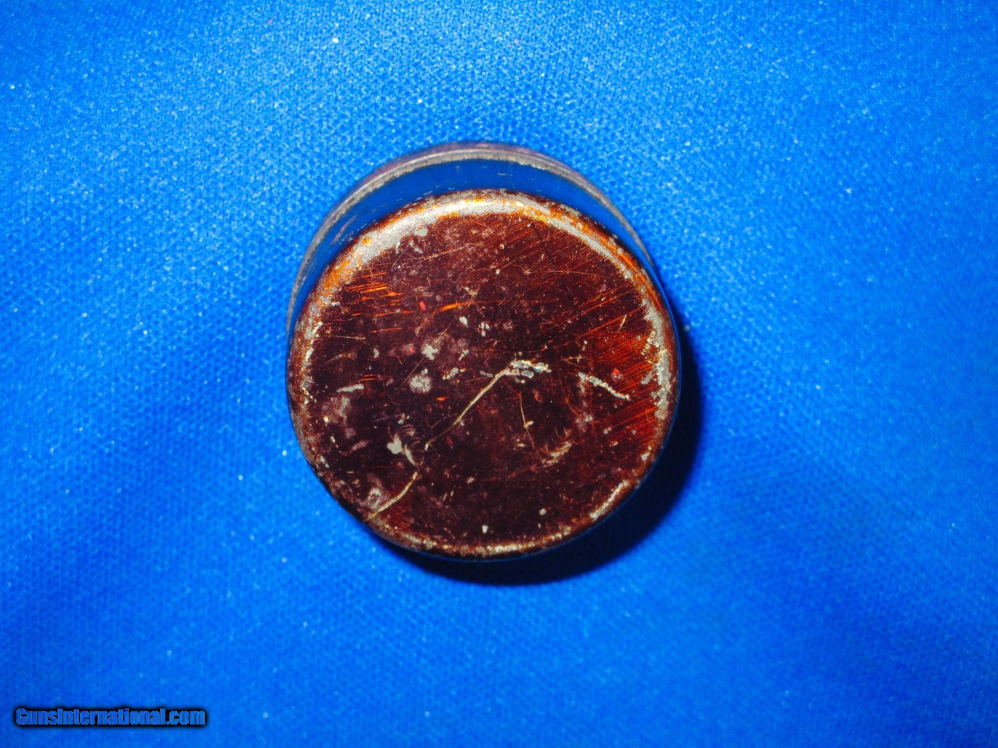 Description: An Early Civil War "Colt's Patent" Marked "Eley Bros." 100 Count Cap Tin In Fine Untouched Condition. All original and complete. The tin has an excellent label as shown in the photos. It Reads, "ELEY BROS. LD., MANUFACTURES, LONDON, 100 METAL-LINED CAPS' COLT'S PT, BELT & POCKET PISTOLS". These caps were for an "1849 Pocket" or "1851 Navy Revolver". The tin still retains most of its original brown lacquer on it. This Is A Fine & Untouched Example Of An Early Colt's Patent Marked 100 Count Cap Tin That Is Definitely Good Enough For A Fine Cased Colt 1849 Pocket Or 1851 Navy Revolver! SOLD |