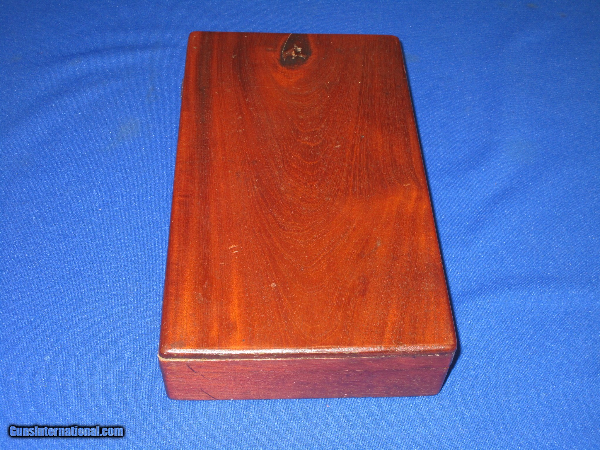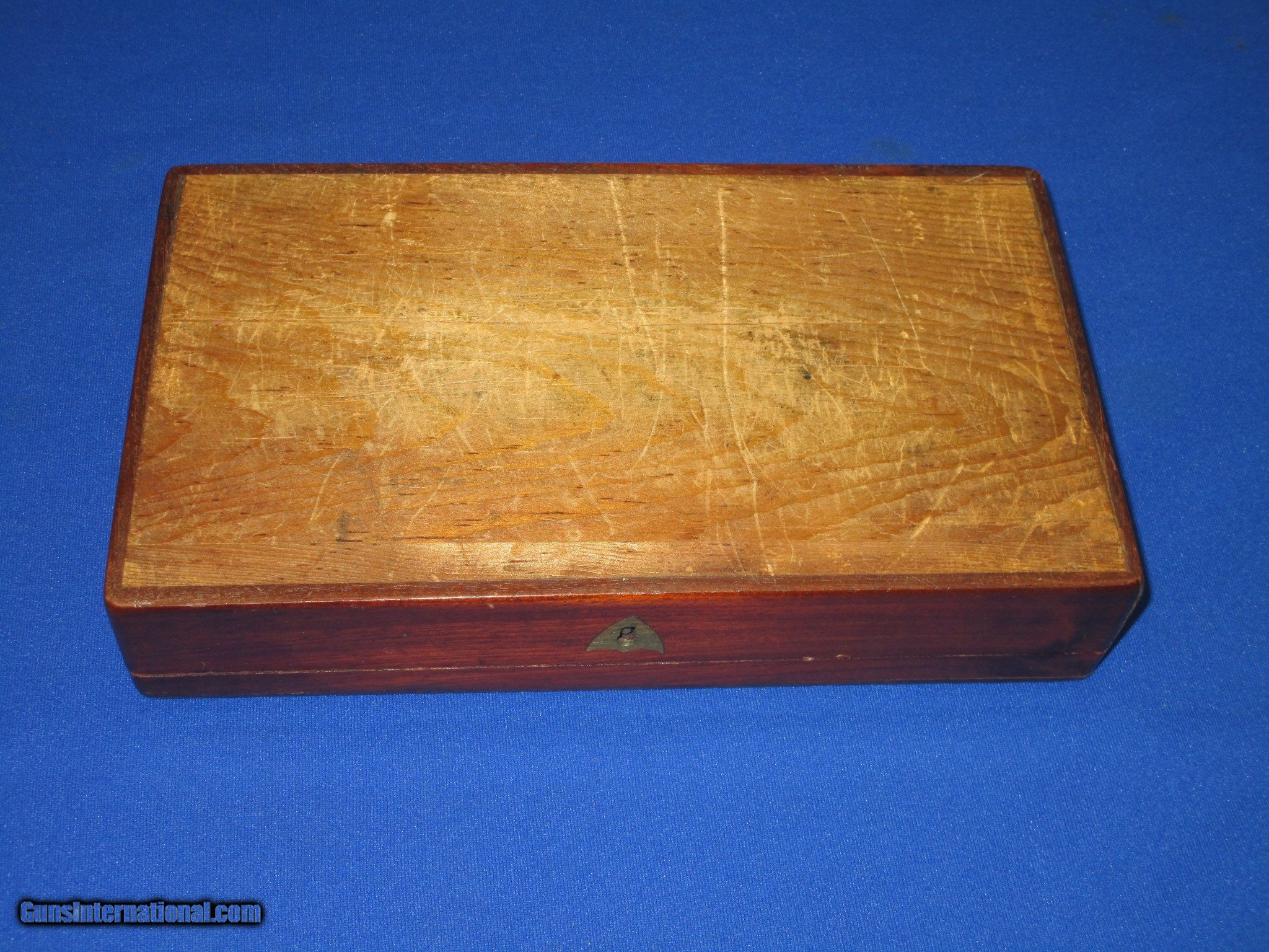 Description: AN EARLY AND ORIGINAL COLT FACTORY CASE FOR A COLT PERCUSSION MODEL 1849 POCKET REVOLVER WITH A 4 INCH BARREL IN FINE UNTOUCHED CONDITION. THE CASE IS ALL ORIGINAL & COMPLETE THROUGHOUT. IT HAS A FINE ORIGINAL BURGUNDY LINING WITH A COUPLE OF LIGHT FADING SPOTS AS SHOWN IN THE PHOTOS. ALL PARTITIONS ARE ORIGINAL. THE OUTSIDE OF THE BOX IS EXCELLENT THROUGHOUT WITH A WONDERFUL GRAIN TO IT. THERE IS A SMALL REPAIR IN THE WOOD AROUND THE LEFT HINGE ON THE INSIDE. THIS IS A VERY FINE EXAMPLE OF A COLT MODEL 1849 4 INCH POCKET CASE THAT IS DEFINITELY GOOD ENOUGH FOR A HIGH CONDITION COLT POCKET REVOLVER! SOLD |