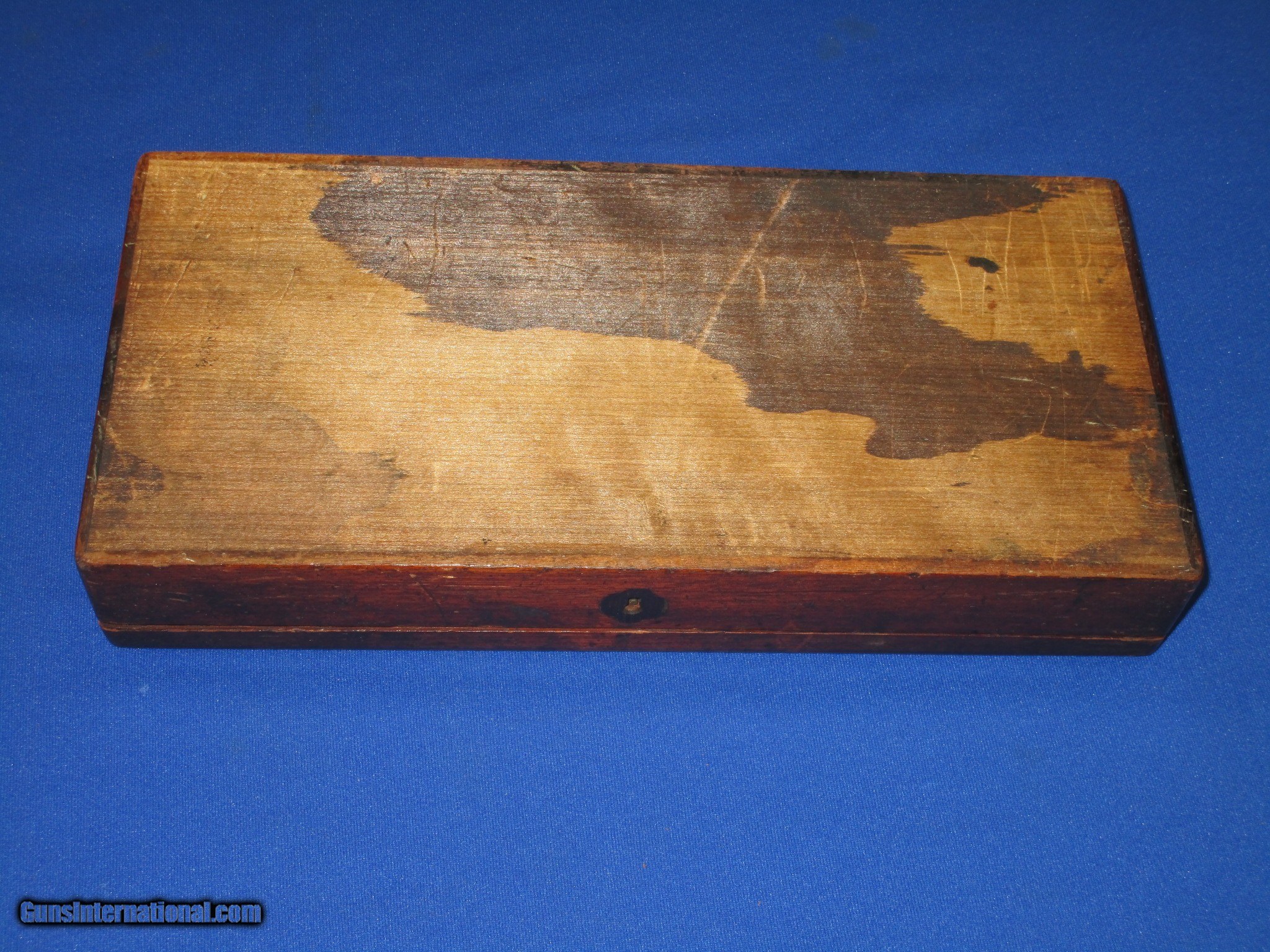 Description: AN EARLY AND ORIGINAL COLT FACTORY CASE FOR A COLT PERCUSSION MODEL 1849 POCKET REVOLVER WITH A 6 INCH BARREL IN FINE UNTOUCHED CONDITION. THE CASE IS ALL ORIGINAL & COMPLETE THROUGHOUT. IT HAS A FINE ORIGINAL BURGUNDY LINING WITH A COUPLE OF FADING SPOTS AS SHOWN IN THE PHOTOS. ALL PARTITIONS ARE ALSO ORIGINAL. THE OUTSIDE OF THE BOX IS FINE THROUGHOUT WITH A NICE GRAIN TO IT. THIS IS A VERY FINE EXAMPLE OF A COLT MODEL 1849 6 INCH POCKET CASE THAT IS DEFINITELY GOOD ENOUGH FOR A HIGH CONDITION COLT POCKET REVOLVER! SOLD |