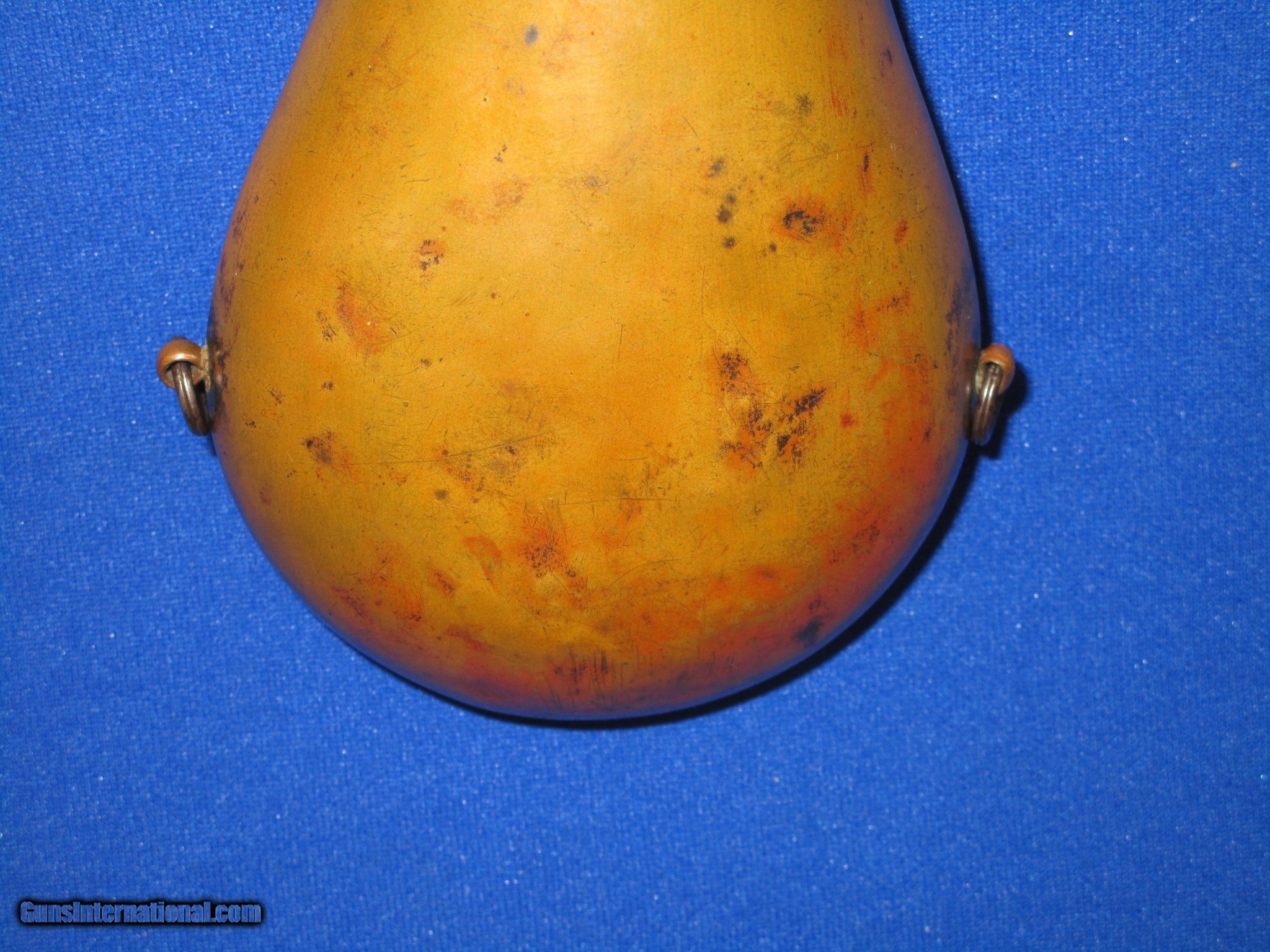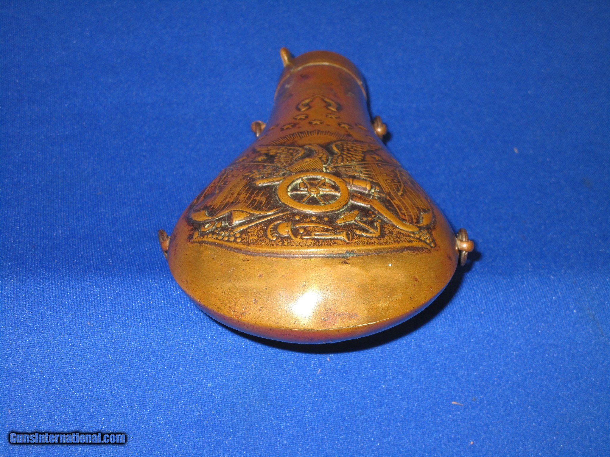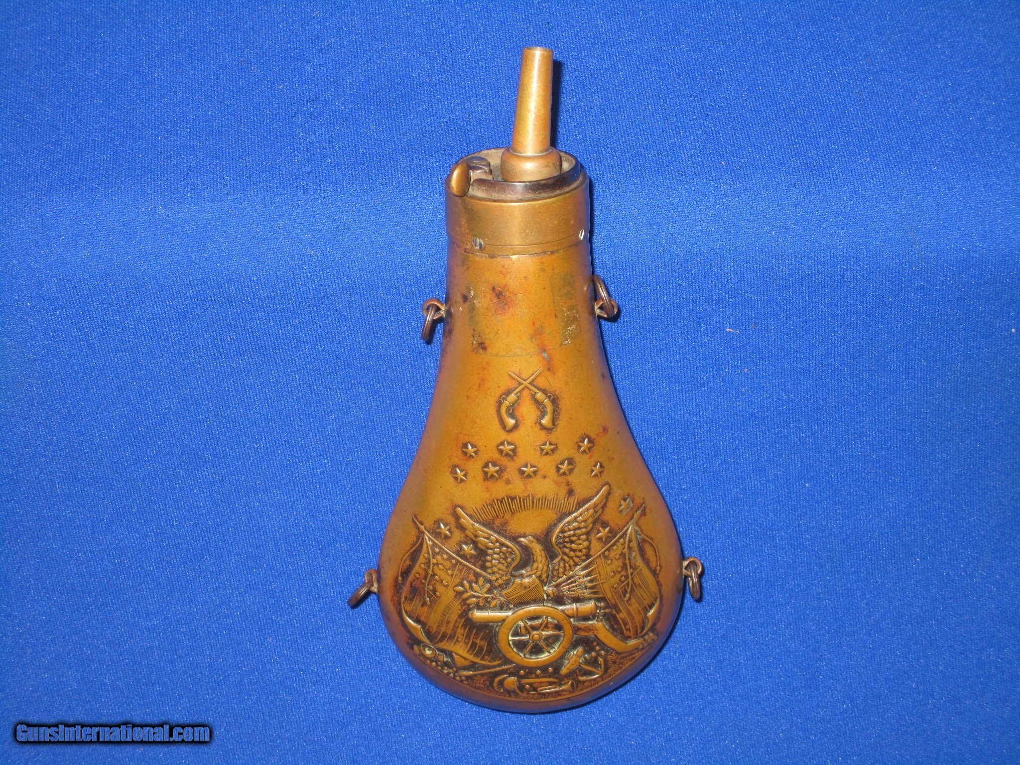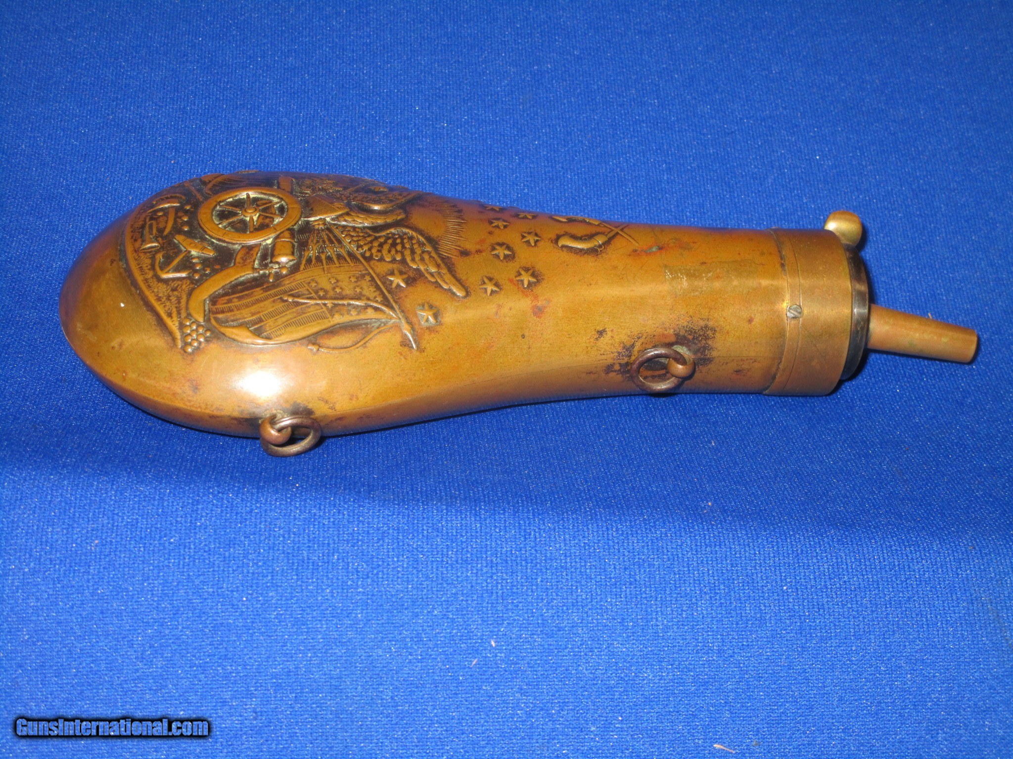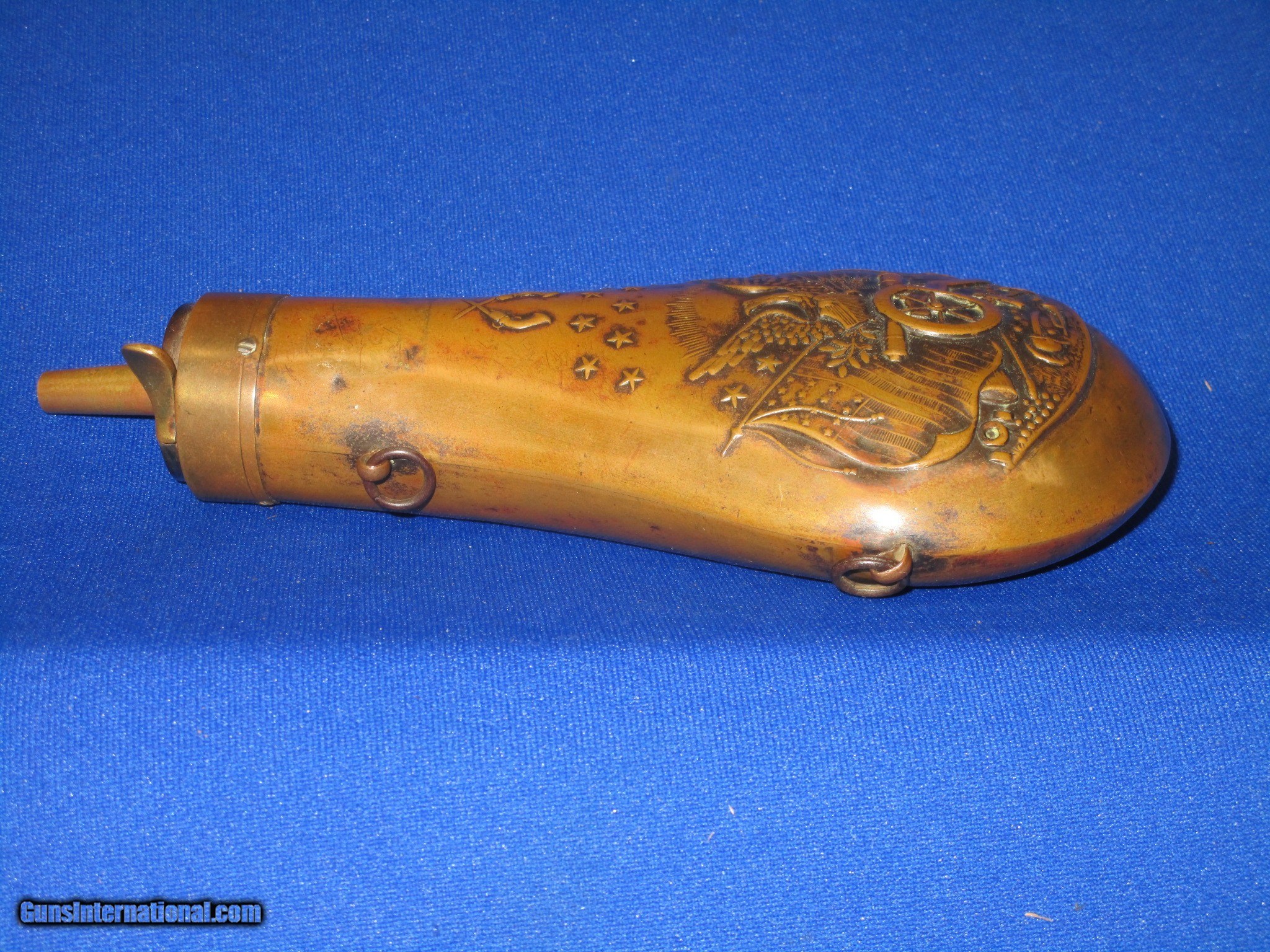 Description: AN EARLY & VERY SCARCE U.S. CIVIL WAR POWDER FLASK FOR A .36 CALIBER COLT FIRST MODEL 1855 REVOLVING RIFLE, 1855 REVOLVING CARBINE, OR A COLT CUT FOR STOCK MODEL 1851 NAVY WITH SHOULDER STOCK IN VERY NICE UNTOUCHED CONDITION. ALL ORIGINAL AND COMPLETE. THE FLASK HAS A FINE BODY WITH TIGHT SEAMS. THERE ARE A COUPLE OF SMALL DINGS IN IT. IT HAS CLEAR U.S. MILITARY MOTIFS ON ONE SIDE WHICH INCLUDE AN AMERICAN EAGLE WITH SHIELD, A CANNON, FLAGS, STARS, CROSSED PISTOLS, AN ANCHOR ETC. THE ENTIRE FLASK HAS AN EVEN & NATURAL DARKENED PATINA THROUGHOUT IT. ALL FOUR CARRY RINGS ARE & THE SLOPING .36 CALIBER NAVY CHARGER AT THE TOP ARE ORIGINAL. THE FLASK OPERATES PERFECTLY. THIS IS A VERY DIFFICULT U.S. CIVIL WAR COLT 1855 RIFLE, 1855 CARBINE, OR 1851 SHOULDER STOCKED NAVY FLASK TO FIND IT WOULD LOOK GREAT NEXT TO ONE OF THESE FINE COLTS! SOLD |