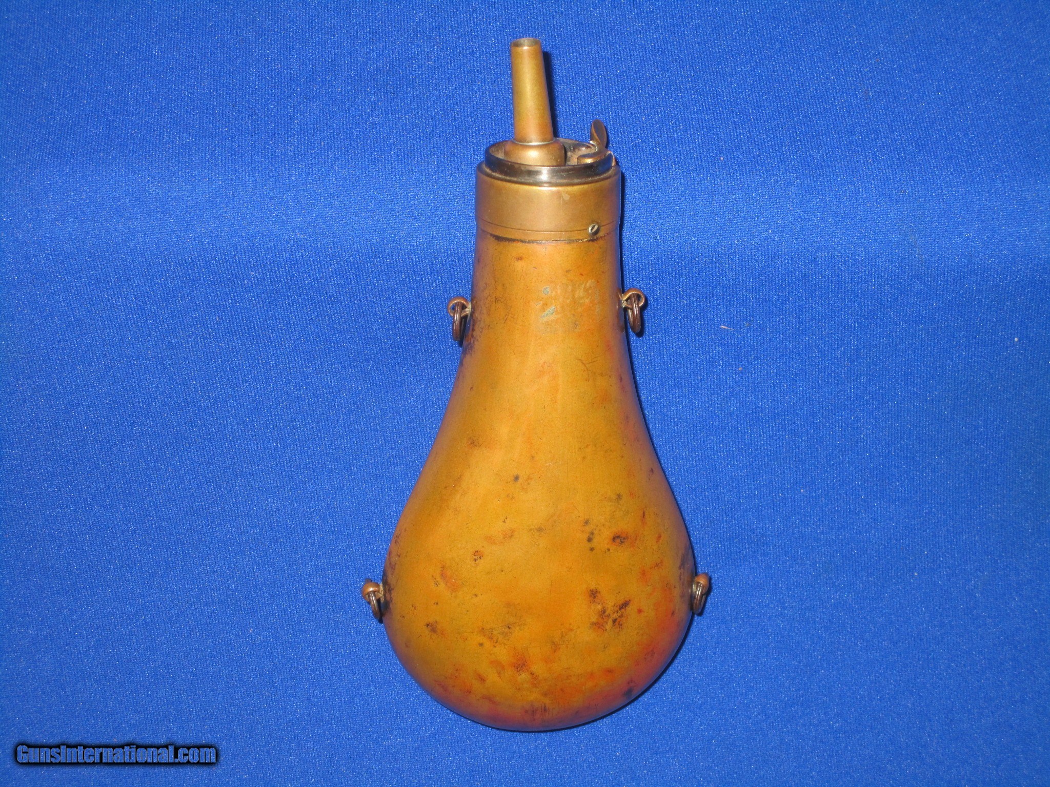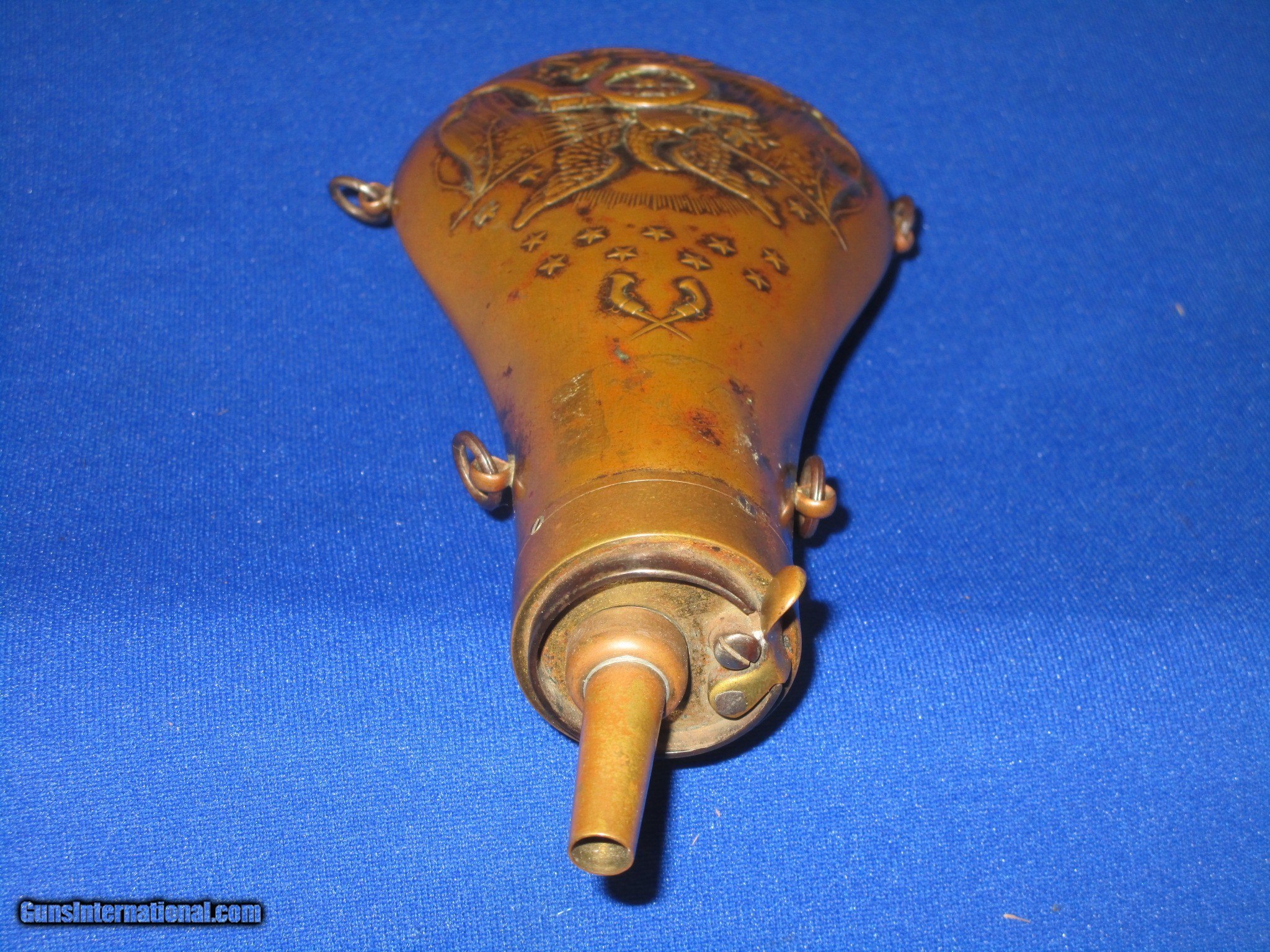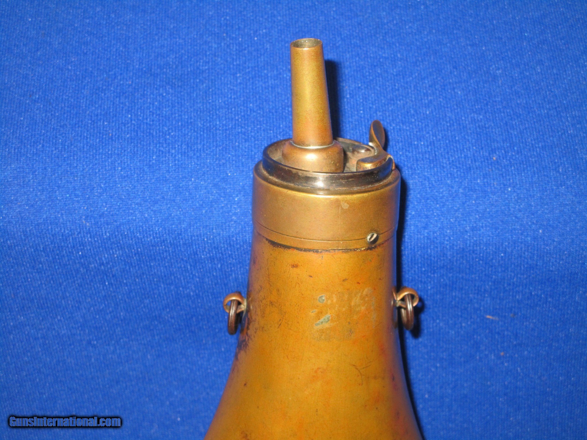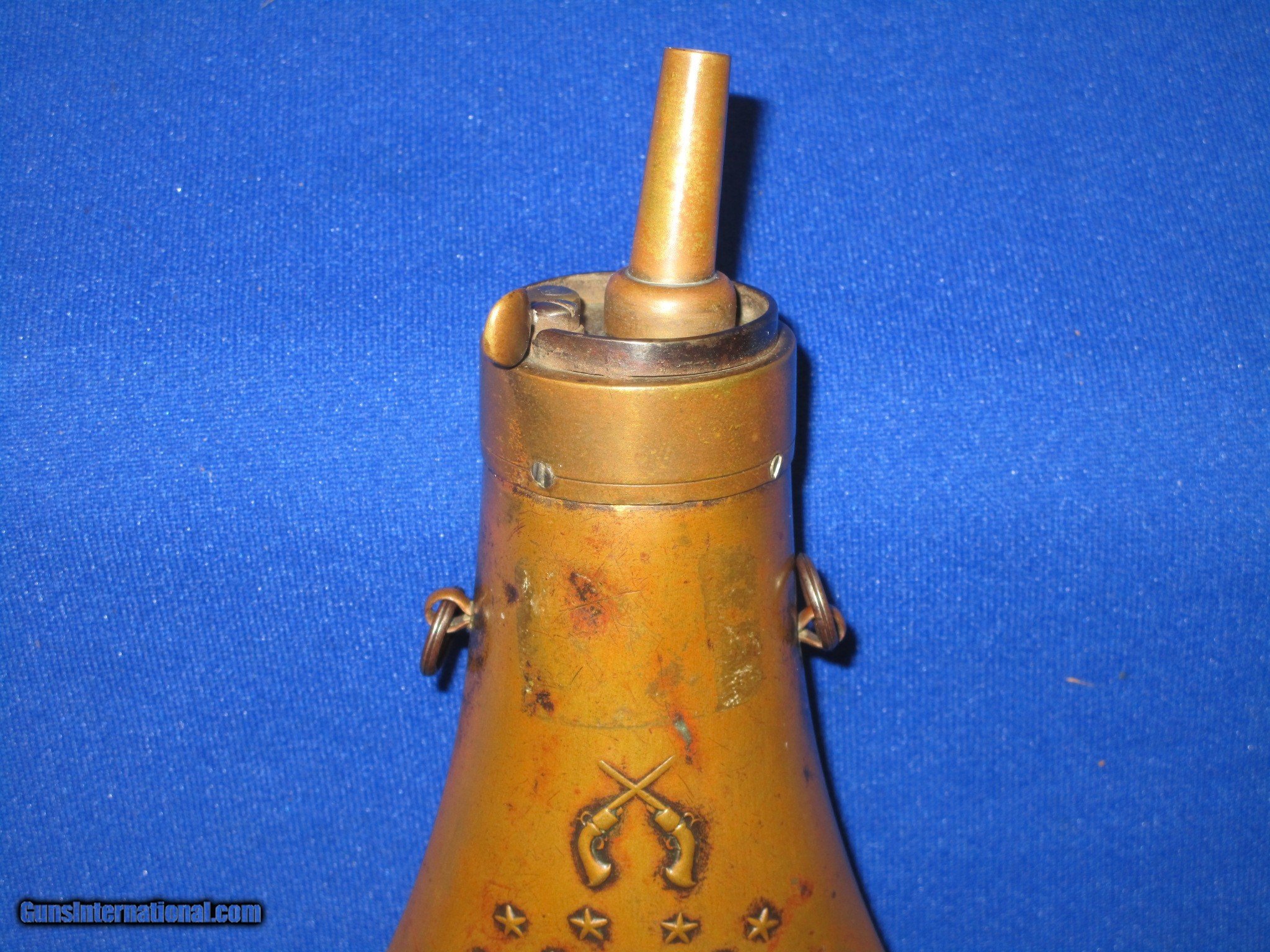 AN EARLY & VERY SCARCE U.S. CIVIL WAR POWDER FLASK FOR A .36 CALIBER COLT FIRST MODEL 1855 REVOLVING RIFLE, 1855 REVOLVING CARBINE, OR A COLT CUT FOR