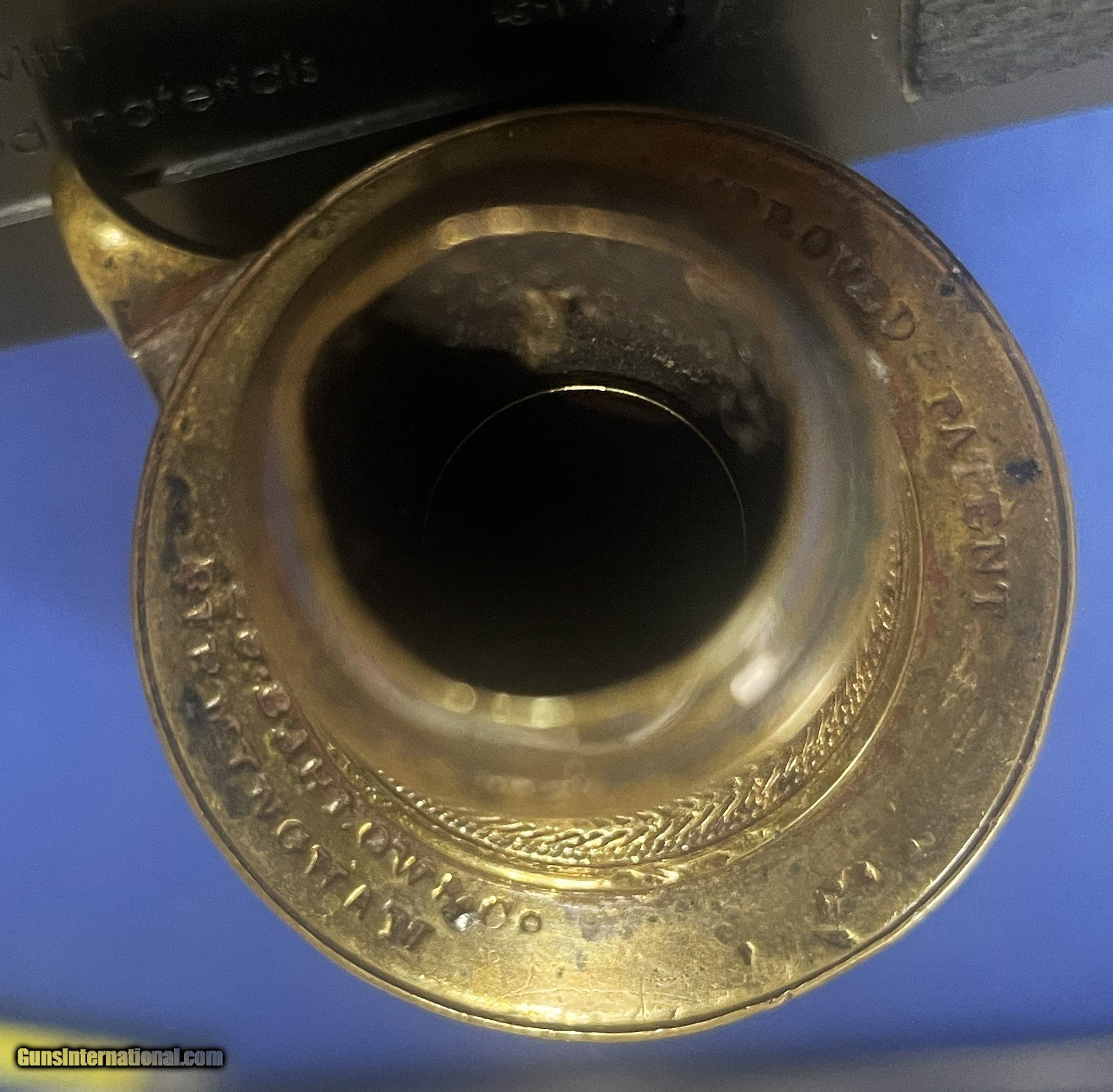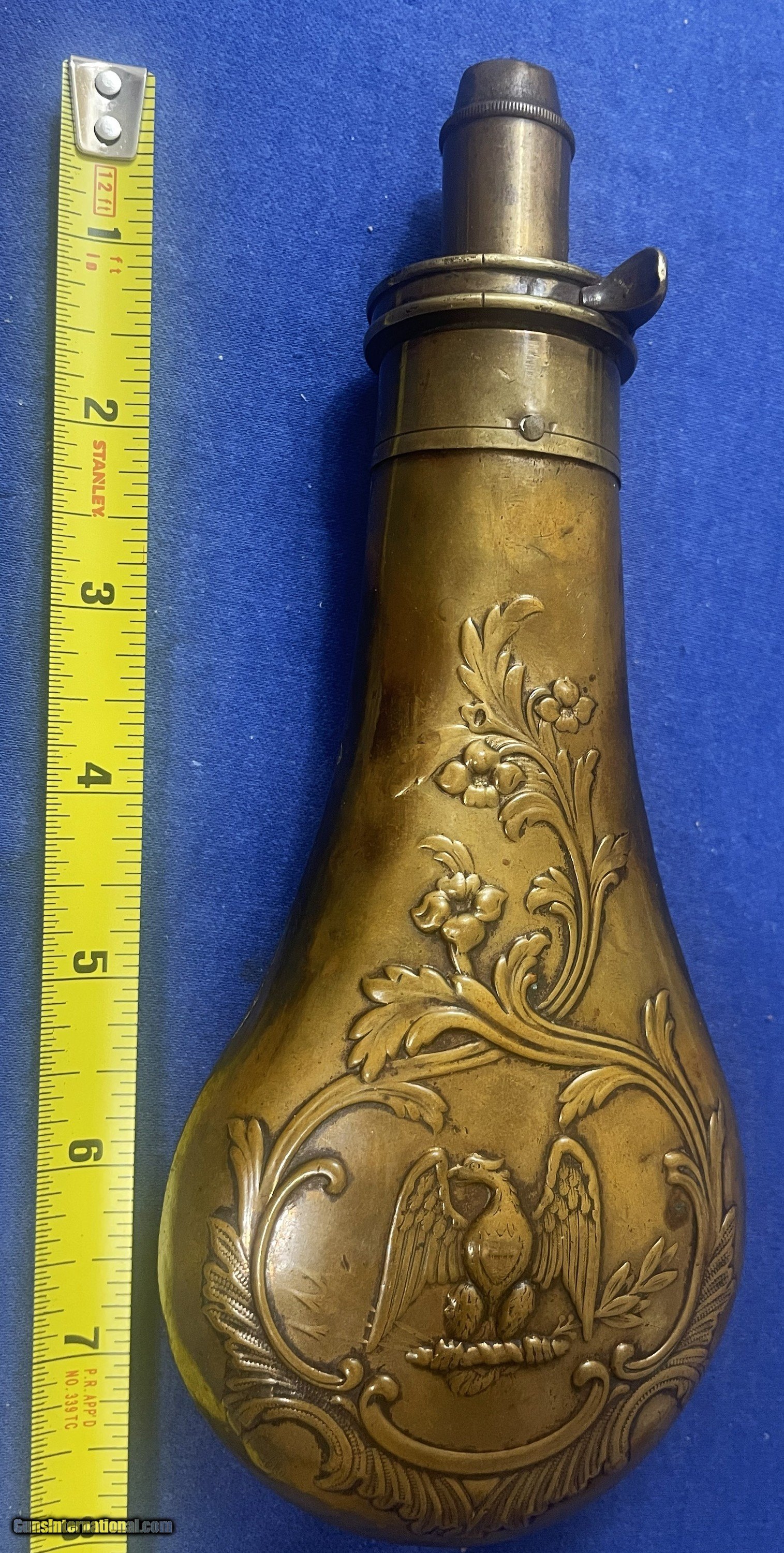 Antique CIVIL WAR ERA POWDER FLASK EAGLE IN VINE MAKER MARKED 8
