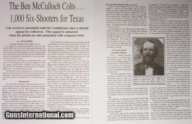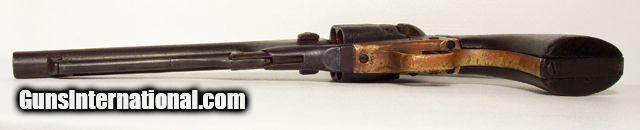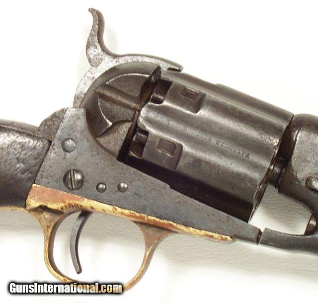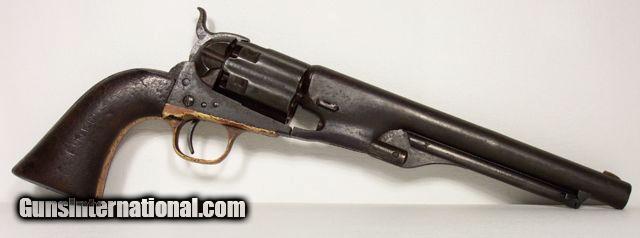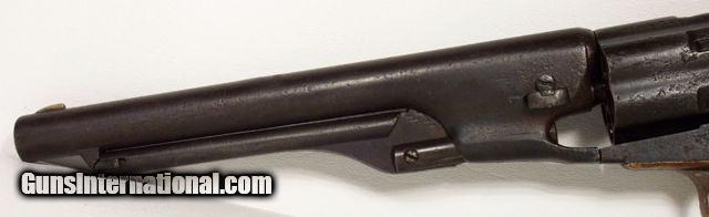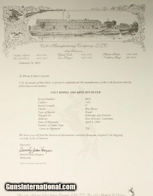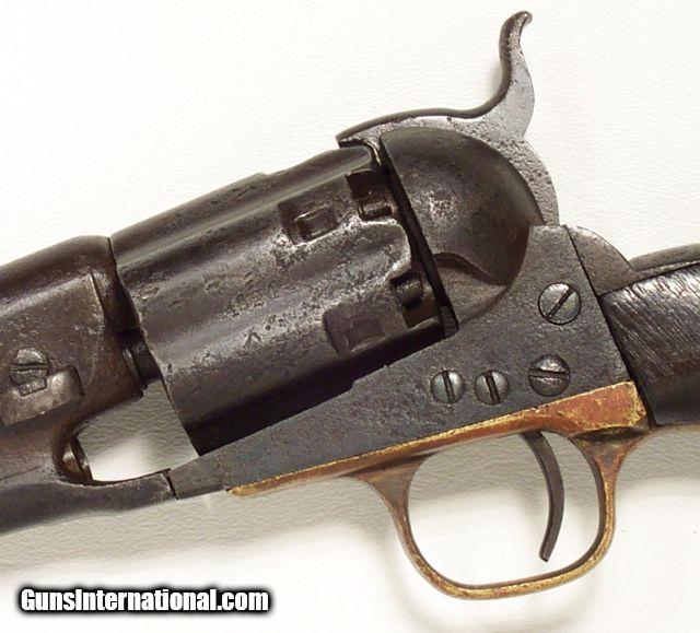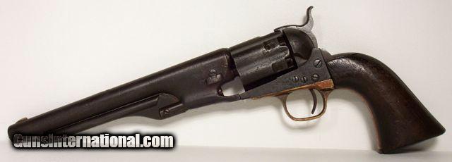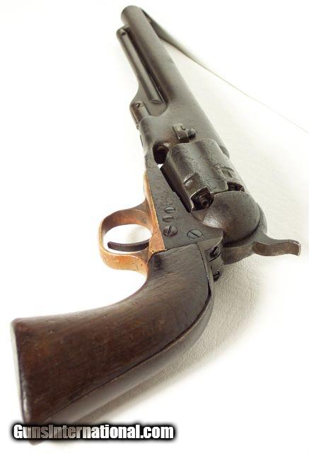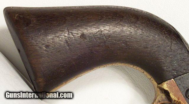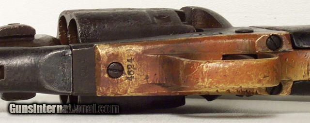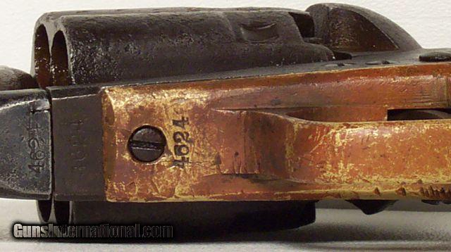 Description: VERY RARE COLT Model 1860; fluted cylinder Army SN4624; one of 750 guns shipped to Kitteridge and Folsum, New Orleans, La. on April 9, 1861; these were ordered by Ben McCulloch, Indian fighter, Texas Ranger, U.S. Marshal and Brigadier General in the Confederate Army; these guns (1000 in 2 shipments) were ordered for Texas Frontier Fighters after Union Troops abandoned Texas Frontier Forts at beginning of Civil War; they were used by Texas Rangers and Later Confederate forces; this one is all matching and original condition, which is rough as expected, when subject to Texas Frontier use; 100% documented and VERY RARE; very good action; antique, no FFL/C&R required for shipping;All items shipped fully insured Priority Mail- -Hand guns $30 --Long guns $45; (Texas residents please add 6.75% sales tax); return policy: three days inspection from the date the item is received; full refund of shipping both ways ONLY IF THE ITEM IS MISREPRESENTED. Note: No International sales under any circumstances. Will ship C&R eligible items to C&R license. Antiques shipped without license to anyone EXCEPT New Jersey and City of New York where a FFL is required. SOLD |
