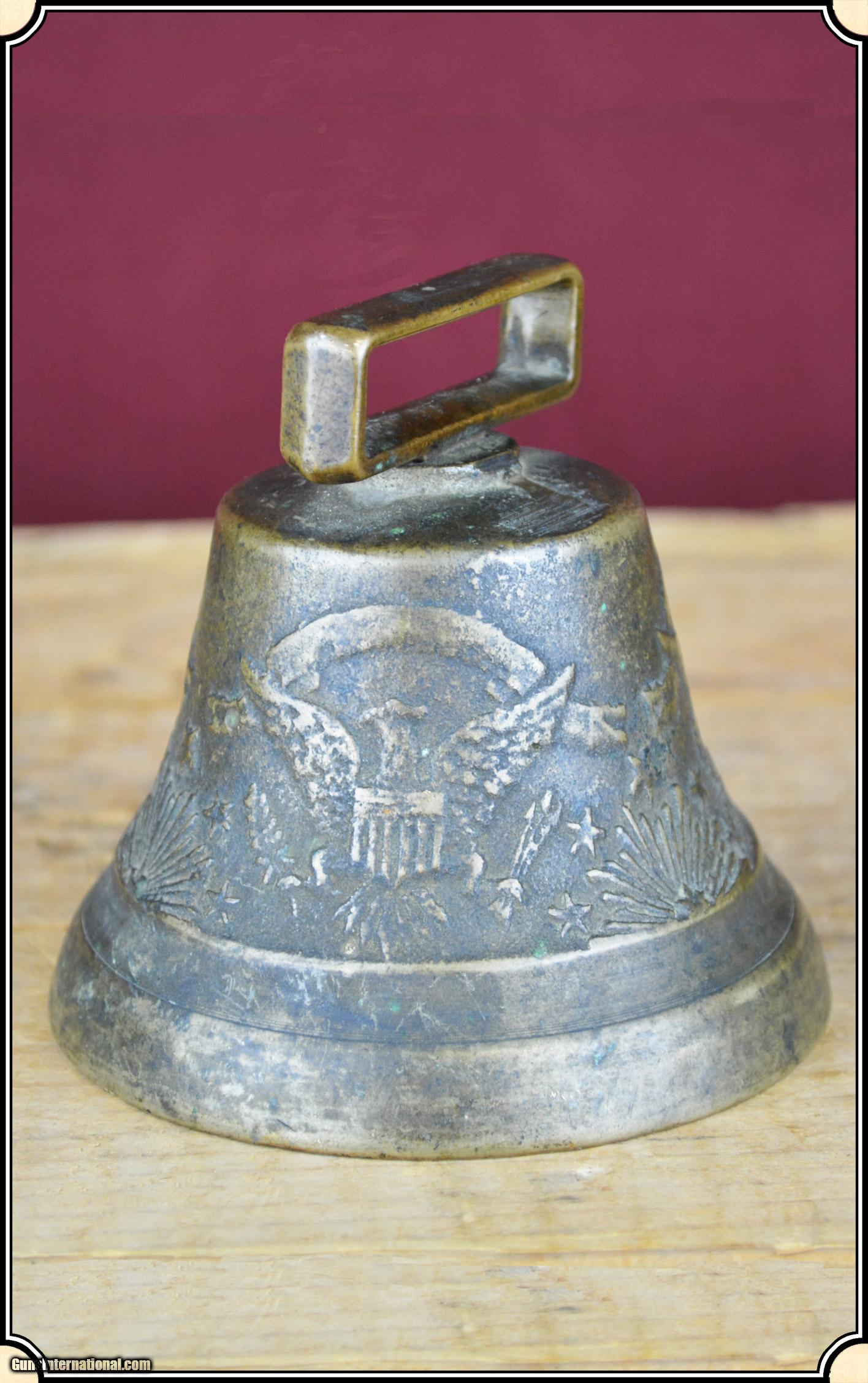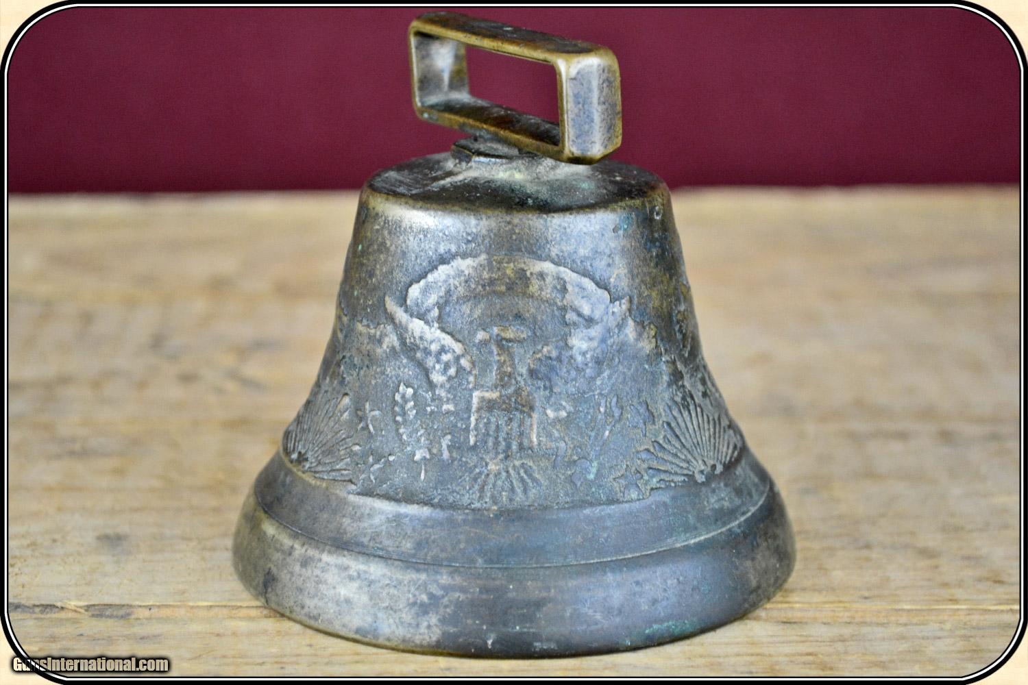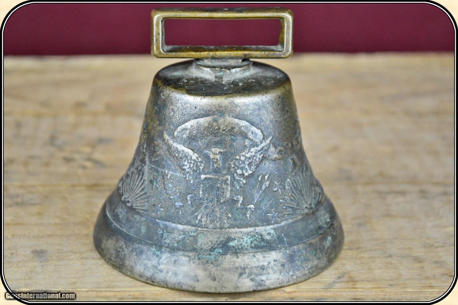 Description: This is a very rare, original US Army-issued camel bell. These bells were used during the little-known Camel Corps experiment from 1855 to 1866, when 71 Egyptian camels were purchased to patrol the deserts of the Southwest, and to haul supplies, between Texas and California. The brass bell is in excellent+ condition, has a mellow patina, measures 3 3/4" wide at the base, and is about 3 1/2" tall, including the brass strap loop. The original clapper is intact. There are raised designs of three Federal eagles, stars, sunbursts, etc. around the exterior. It has a clear, long resonating ring, like no bell I have heard before. This bell is identical to one in the Fort Tejon Museum, in Southern California, where camels were posted. Original camel barns are still standing at Benicia Army Barracks, near San Francisco. This is an Army Transportation Museum which shows a photo of a camel bell and gives a history of the camel experiment. The use of camels was suggested by Secretary of the Army, Jefferson Davis. The Civil War helped kill the idea. I guarantee that it is original, and as described. Payment Cash, postal money order, cashiers check, personal & business checks. Can be ordered with a credit card or paypal at wxx.riverjunction,cxx just type in the number 4398 in the search box. SOLD |