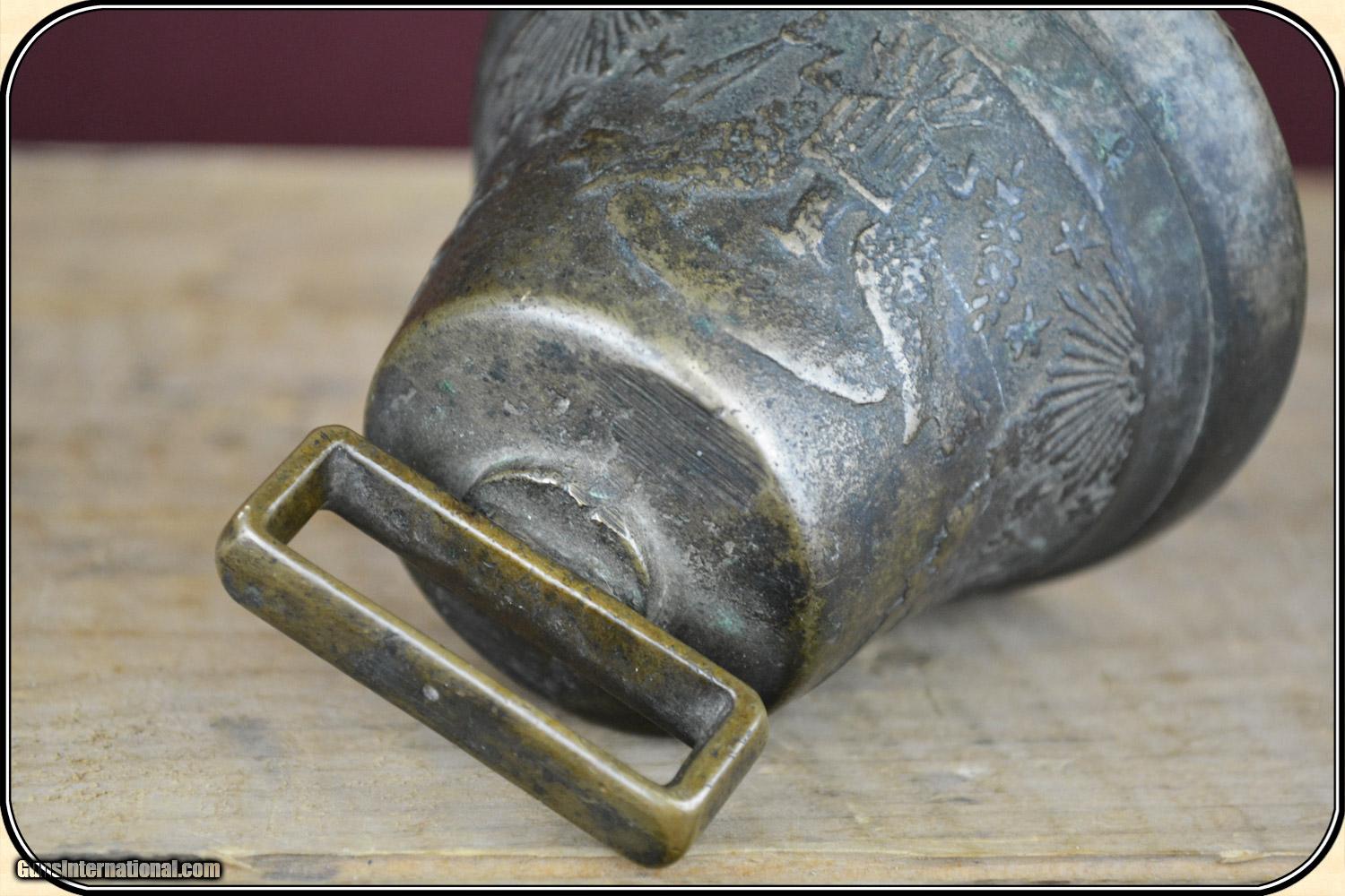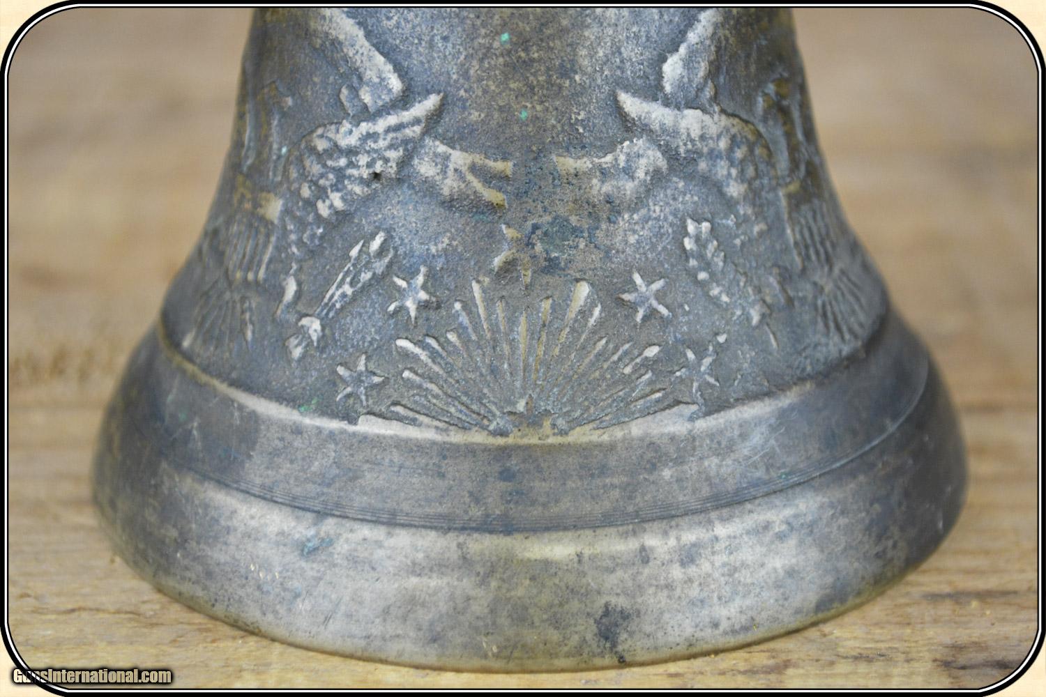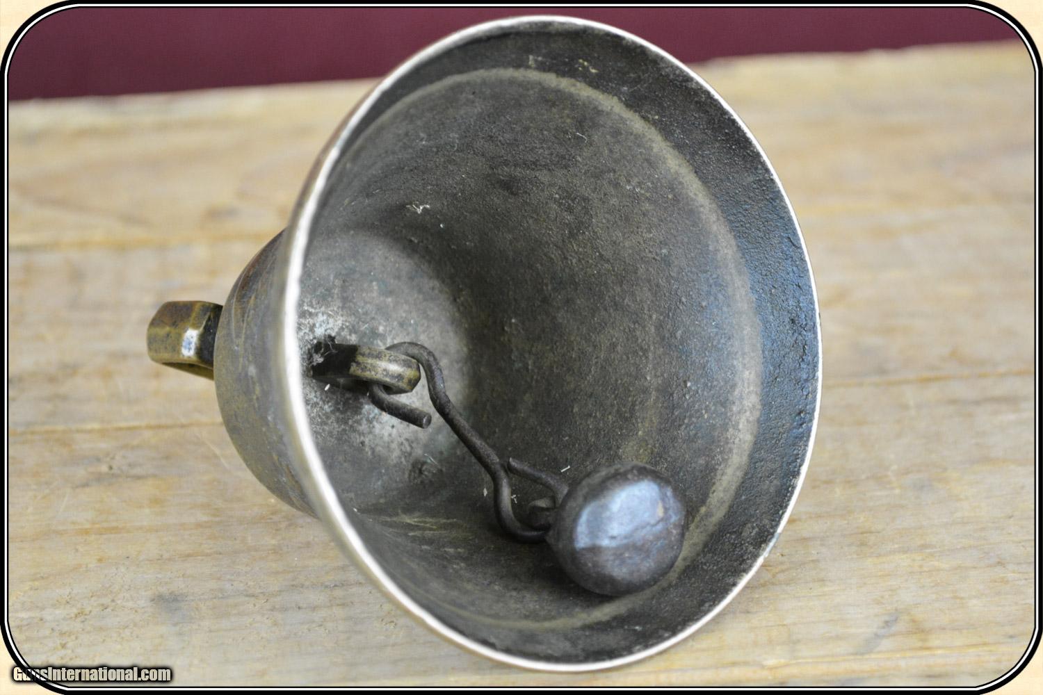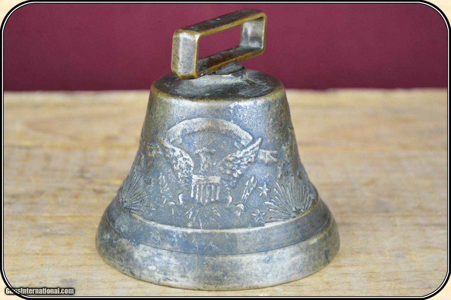 Description: This is a very rare, original US Army-issued camel bell. These bells were used during the little-known Camel Corps experiment from 1855 to 1866, when 71 Egyptian camels were purchased to patrol the deserts of the Southwest, and to haul supplies, between Texas and California. The brass bell is in excellent+ condition, has a mellow patina, measures 3 3/4" wide at the base, and is about 3 1/2" tall, including the brass strap loop. The original clapper is intact. There are raised designs of three Federal eagles, stars, sunbursts, etc. around the exterior. It has a clear, long resonating ring, like no bell I have heard before. This bell is identical to one in the Fort Tejon Museum, in Southern California, where camels were posted. Original camel barns are still standing at Benicia Army Barracks, near San Francisco. This is an Army Transportation Museum which shows a photo of a camel bell and gives a history of the camel experiment. The use of camels was suggested by Secretary of the Army, Jefferson Davis. The Civil War helped kill the idea. I guarantee that it is original, and as described. Payment Cash, postal money order, cashiers check, personal & business checks. Can be ordered with a credit card or paypal at wxx.riverjunction,cxx just type in the number 4398 in the search box. SOLD |
