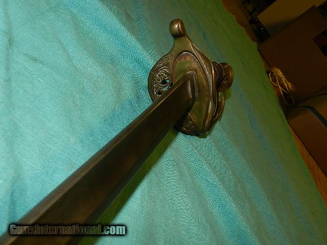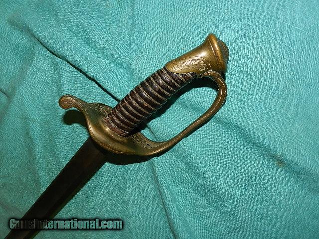 Description: A very good staff officers 1850 sword with very clean original blade , not sharpened, and has a nice grey age patina. No name on the blade, so it must have been an imported blade, possibly from France. The brown leather grip is very good as the wire wrap also. The hilt in brass with foliate piercing and has a mellow patina. there is no scabbard with this Civil War sword. Above average condition , this sword came from a New England attic. We don’t have asite .I prefer money orders or a check. Item ships when funds come in. If you can only pay with a card let me know. I hope you like my wide selection of unusual guns, knives and gun parts. Shipping price determined by zip code. I try to keep the prices affordable, which means I make less money than most dealers. You won’t get altitude sickness with my prices! I consistently have the best selection of older guns If you BUY IT NOW you must still contact us for details buy it now doesn't end the sale, it just sends an email telling us you want to buy this gun. A phone call won’t secure a sale! Not home many times, the first buyer by email buys the gun !Thissite doesnot close down a sale when you do a BUY IT NOW like Ebay!I can get six buy it nows in an hour, first buyer to email gets the guns, others are in second place! Best to send another email . Sometimes not home to get calls. Some guns are required shipment to a gun dealer near you for a transfer to you when it arrives. With the widest selection of older guns at great prices, We don’t have a store, and sell on the internet only. SOLD |