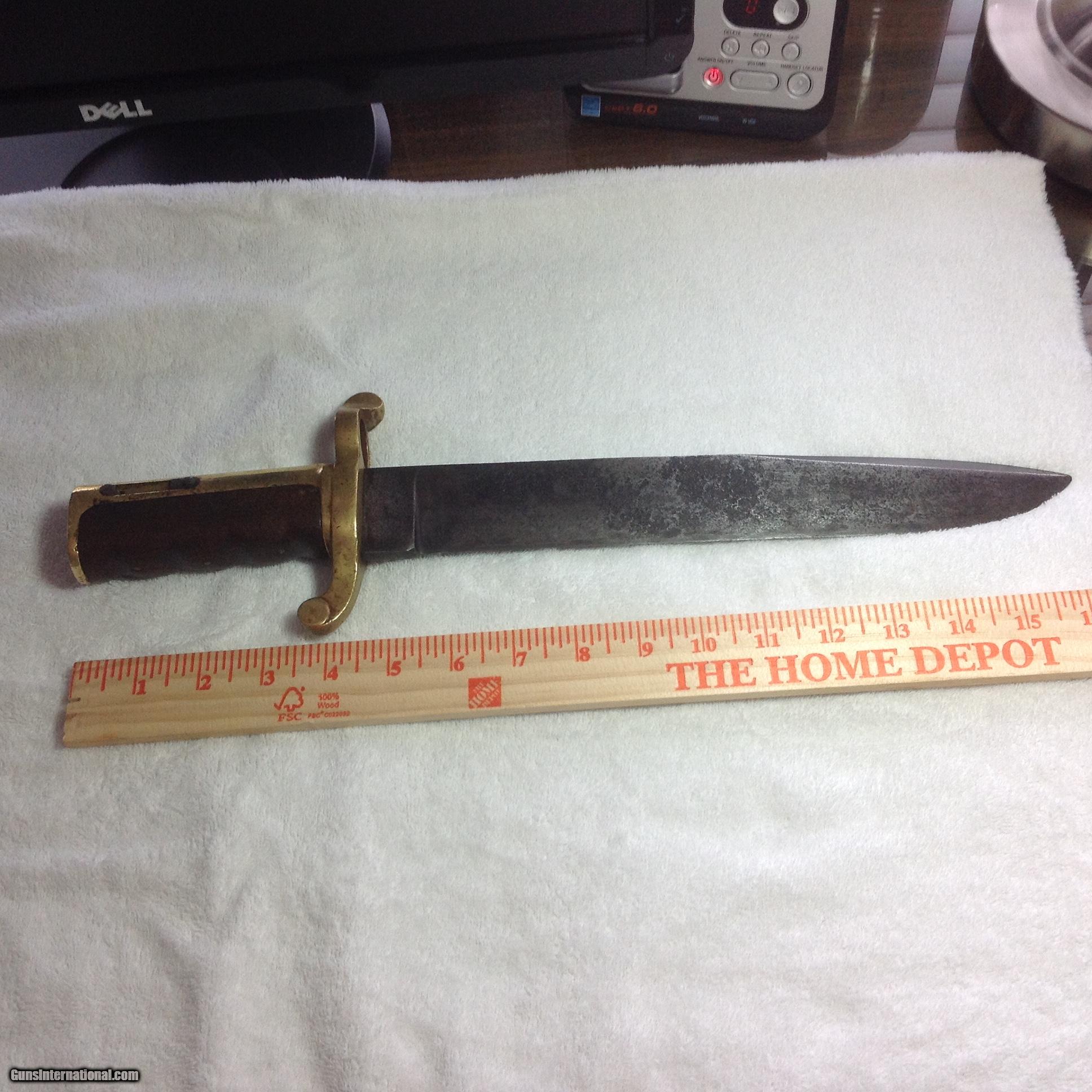 Description: Final Reduction! This will be off the market when this add expires 20 August. Very good condition Civil War authentic 1861 Marked Dahlgren Federal Bowie Bayonet. Just at 16.5 inches. Real deal Dahlgren. Clearly marked 1861. Can barely make out Mass and US on other side. Nice dark patina. Light pitting. Period sharpened razor sharp. Excellent price for condition. Compare and save. SOLD |