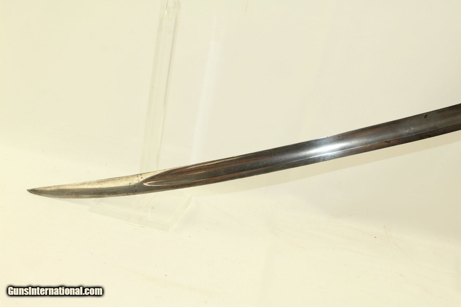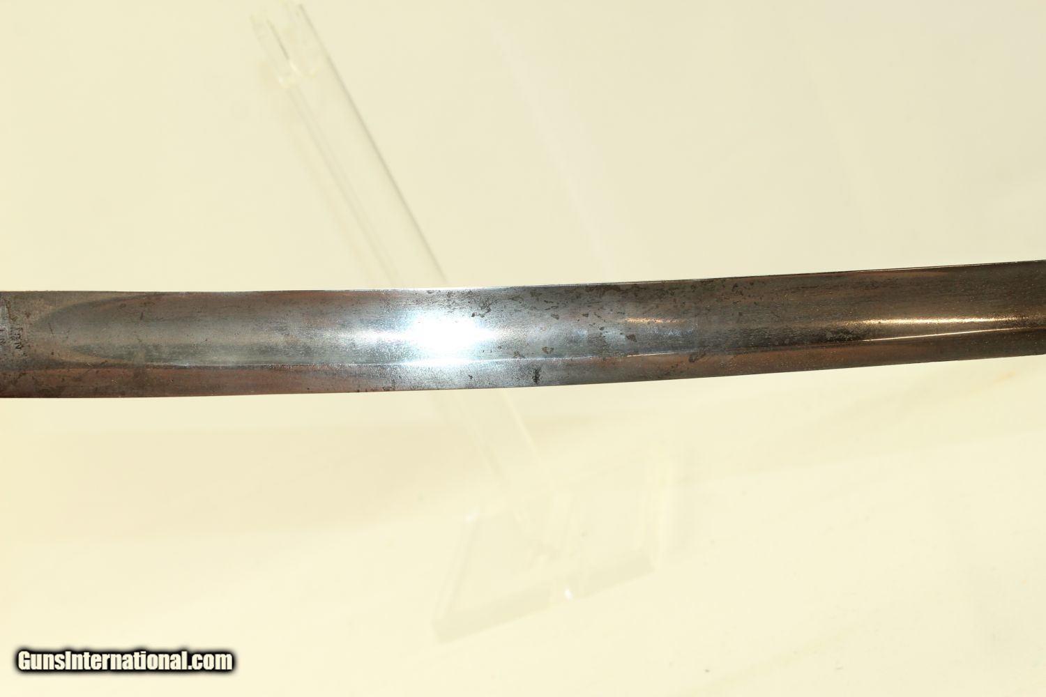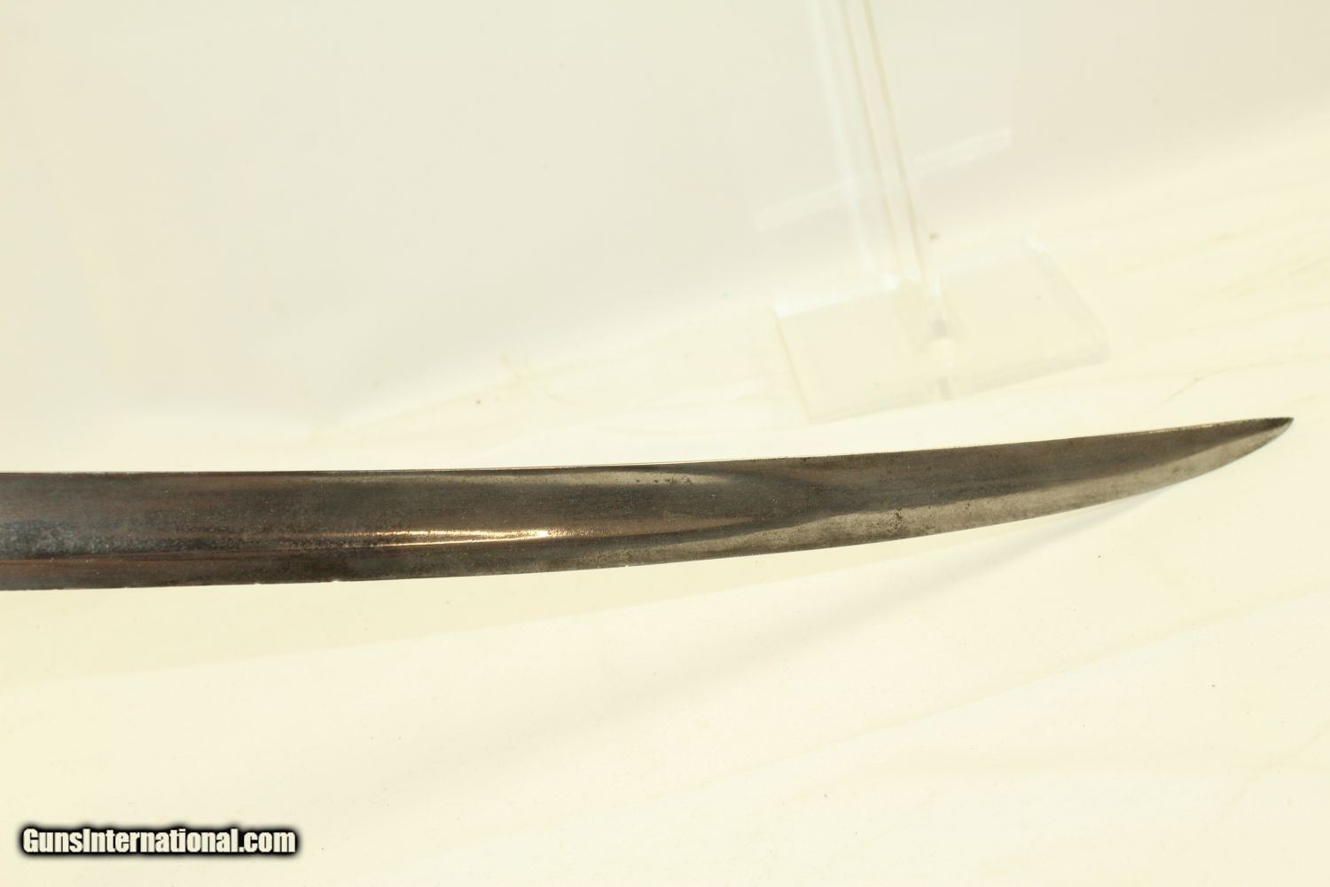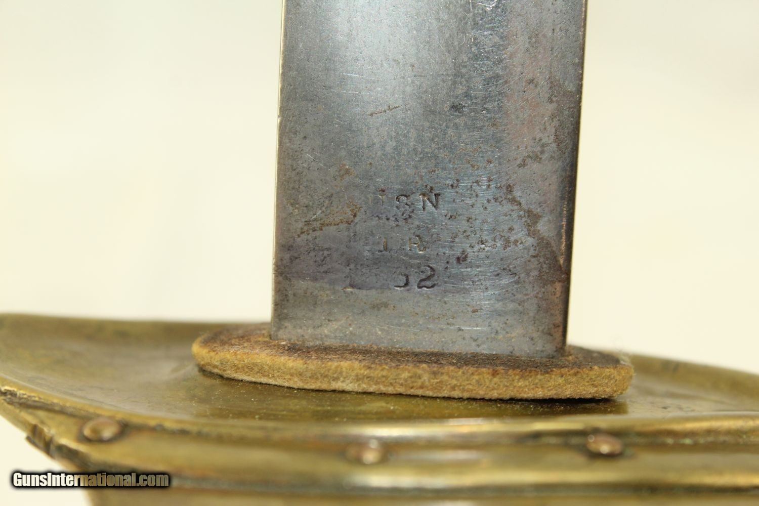 Description: CIVIL WAR Antique U.S. AMES M1860 NAVY Cutlass Dated 1862 With LEATHER SCABBARD Here we present an antique U.S. Ames Model 1860 Naval Cutlass, made in 1862, in Chicopee Falls, Massachusetts. The M1860 was a fantastic vessel boarding weapon in its time and served well in its role in the U.S. Navy during the American Civil War. Only an estimated 25,000 of these were produced during the war, compared to 300,000 of the M1860 Light Cavalry Sword. This specimen bears the standard markings of a M1860, but also has the number “24M” and “915” stamped into the quillion. These are likely denoting the naval unit or ship rack number that used this particular piece. The ricasso faintly bears the “USN”, “1862” and an ordnance inspector’s marking on the left. The overall length is 31-3/4 inches with the blade measuring 25-3/4 inches. It sports a brass hilt, a wire-wrapped leather grip, and a leather scabbard. The overall condition is Near Fine. The twisted wire and leather wrapping the handle are intact, although the wire has slightly loosened. The hand guard is solid with the scabbard retaining its strength. This sword is what most people imagine a pirate, or a navy man at sea wielding, making it a strong display piece for any collection. Own the original! This is a legitimate antique and not a reproduction. Overall condition as seen in photos. Very Fast. Very Safe. FREE SHIPPING WORLDWIDE. Delivered directly to your door by express mail! Guaranteed AUTHENTIC & Includes CERTIFICATE OF AUTHENTICITY. ancestryguns $1200 #191067 SOLD Antique: Yes |