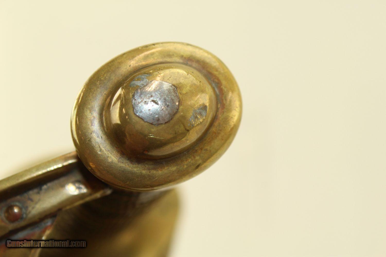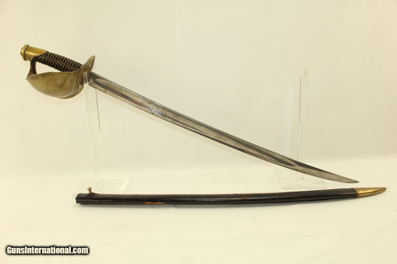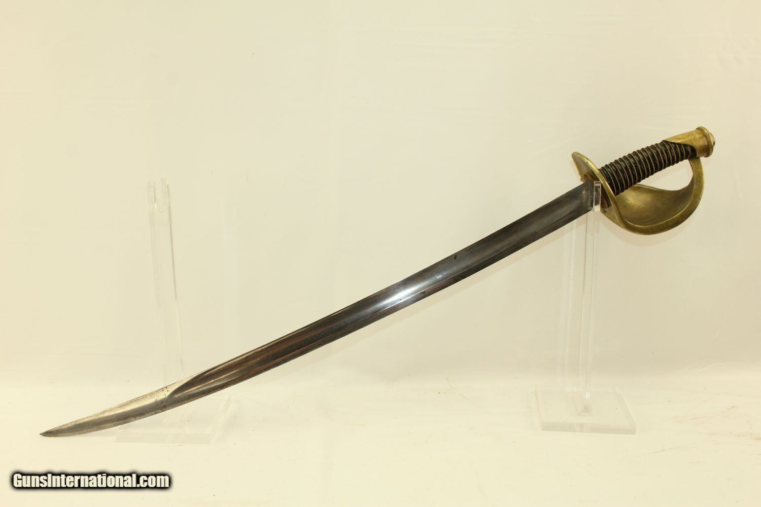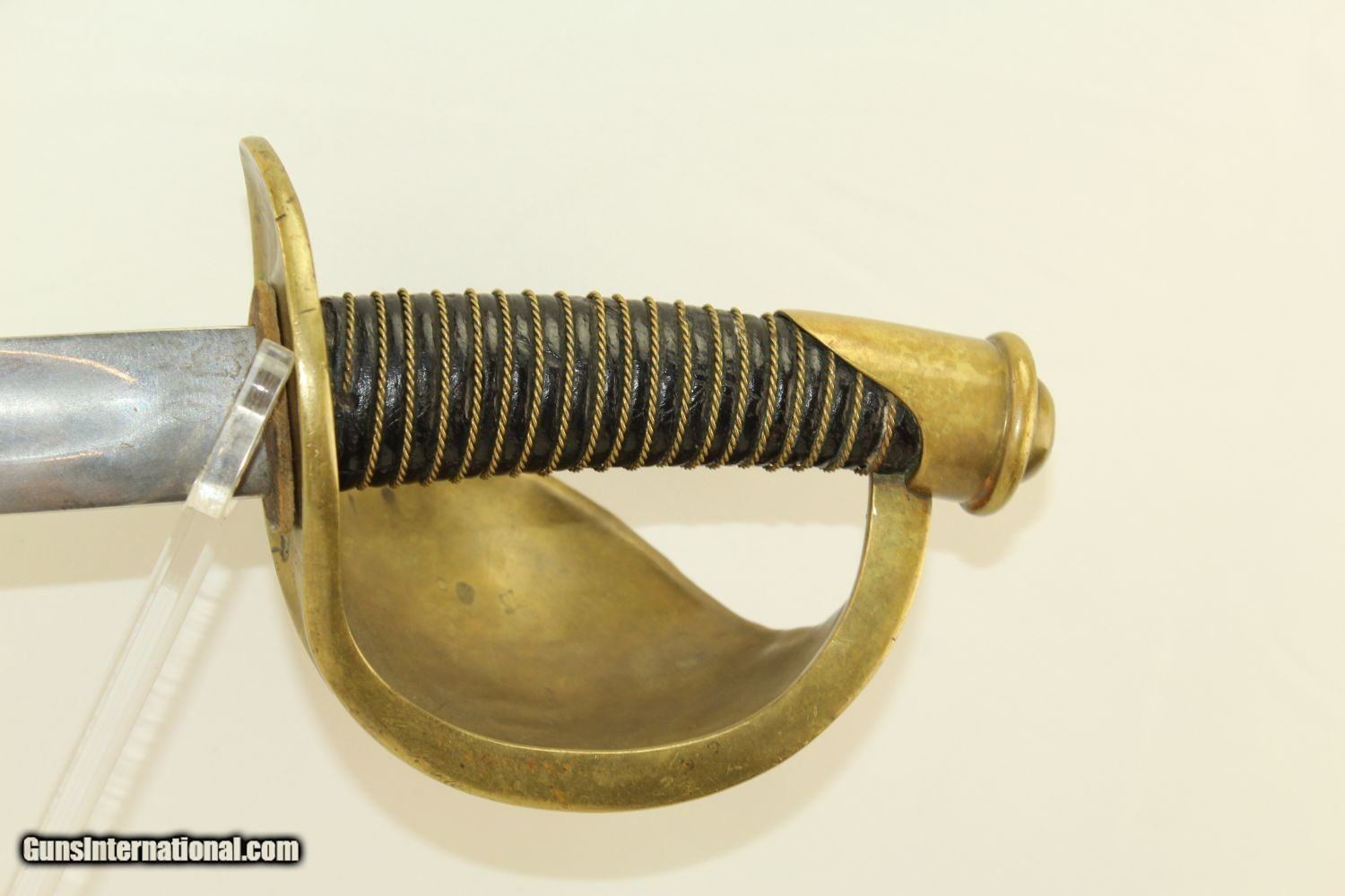 Description: CIVIL WAR Antique U.S. AMES M1860 NAVY Cutlass Dated 1862 With LEATHER SCABBARD Here we present an antique U.S. Ames Model 1860 Naval Cutlass, made in 1862, in Chicopee Falls, Massachusetts. The M1860 was a fantastic vessel boarding weapon in its time and served well in its role in the U.S. Navy during the American Civil War. Only an estimated 25,000 of these were produced during the war, compared to 300,000 of the M1860 Light Cavalry Sword. This specimen bears the standard markings of a M1860, but also has the number “24M” and “915” stamped into the quillion. These are likely denoting the naval unit or ship rack number that used this particular piece. The ricasso faintly bears the “USN”, “1862” and an ordnance inspector’s marking on the left. The overall length is 31-3/4 inches with the blade measuring 25-3/4 inches. It sports a brass hilt, a wire-wrapped leather grip, and a leather scabbard. The overall condition is Near Fine. The twisted wire and leather wrapping the handle are intact, although the wire has slightly loosened. The hand guard is solid with the scabbard retaining its strength. This sword is what most people imagine a pirate, or a navy man at sea wielding, making it a strong display piece for any collection. Own the original! This is a legitimate antique and not a reproduction. Overall condition as seen in photos. Very Fast. Very Safe. FREE SHIPPING WORLDWIDE. Delivered directly to your door by express mail! Guaranteed AUTHENTIC & Includes CERTIFICATE OF AUTHENTICITY. ancestryguns $1200 #191067 SOLD Antique: Yes |