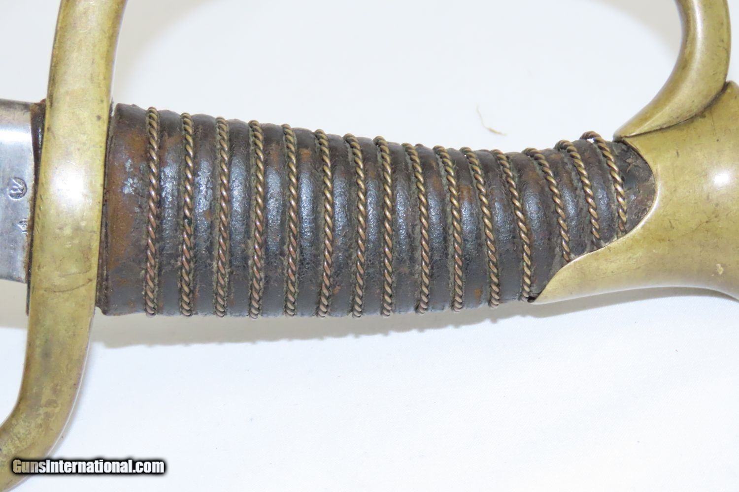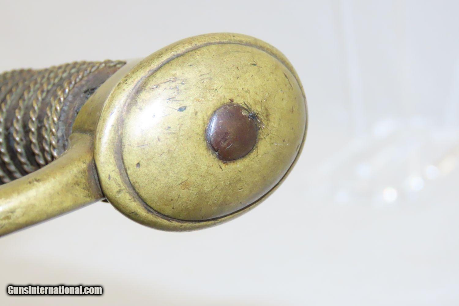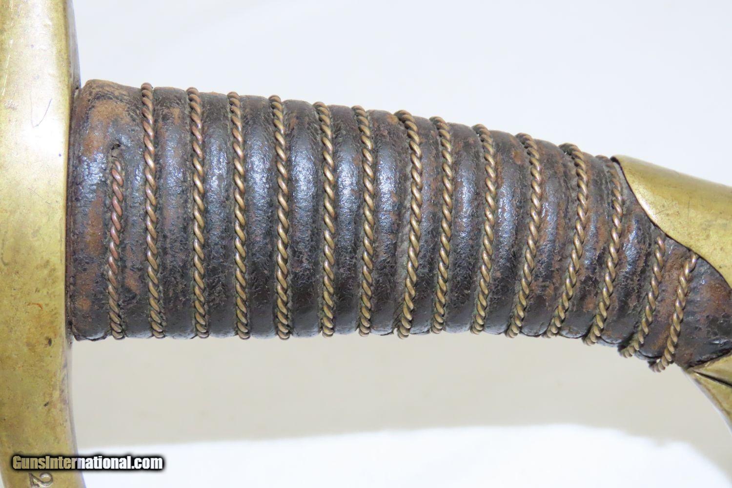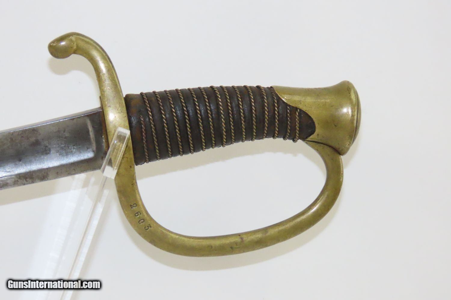 Description: CIVIL WAR Antique U.S. Model 1840 LIGHT ARTILLERY Saber North South Horse Artillery Sidearm Here we present an antique U.S. Model of 1840 Light Artillery Saber, made circa the 1840s through the 1860s. These were based upon a French design and were carried by light or “horse” artillery soldiers on both sides of the conflict—these units would ride into battle with their smaller artillery pieces, not the sort of giant pieces that are associated with siege warfare. The Model 1840 features a beautifully curved blade with a single brass knucklebow instead of a basket hilt. The grip is wrapped in leather and braided wire. There is a “W” within a circle stamp on the left side of the ricasso. The overall length is 37 inches. This saber would have been used in the American Civil War by Union Artillery Troops. The overall condition is very good. The blade is bright. The hilt is solid and in good shape. The finish on the scabbard has matured to a brown patina and remains in good condition. “2603 is stamped on both the left side of the hand guard and the scabbard. “410” and “688” are marked on the right side of the hand guard. Here is a great Civil War Light Artillery Saber to display in your collection! Own the original! This is a legitimate antique and not a reproduction. Overall condition as seen in photos. Very Fast. Very Safe. FREE SHIPPING WORLDWIDE. Delivered directly to your door by express mail! Guaranteed AUTHENTIC & Includes CERTIFICATE OF AUTHENTICITY. ancestryguns $1055 #200812 SOLD Antique: Yes |