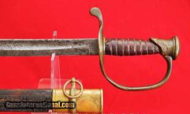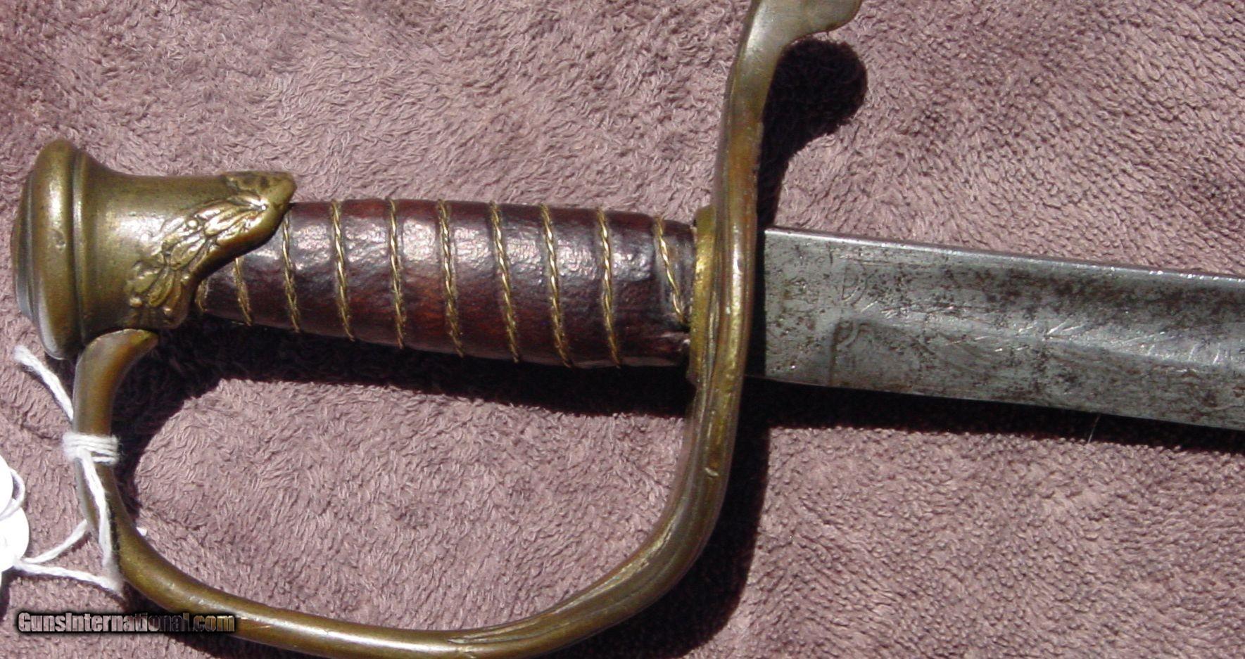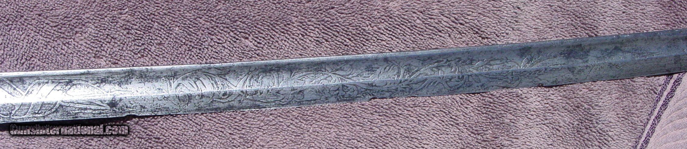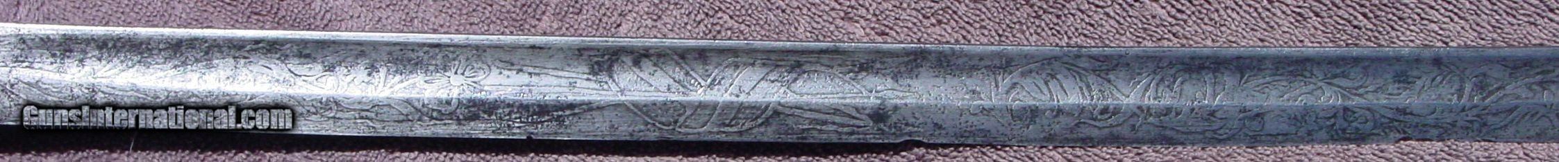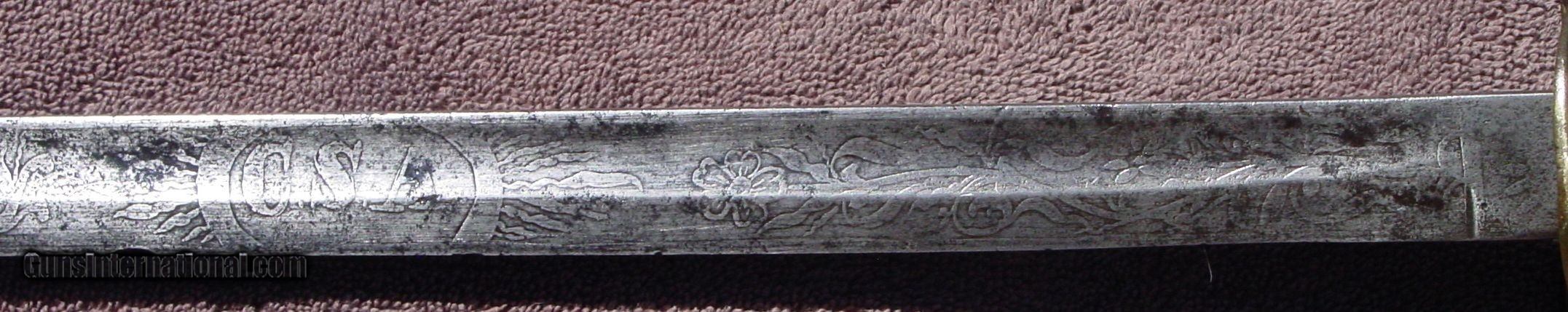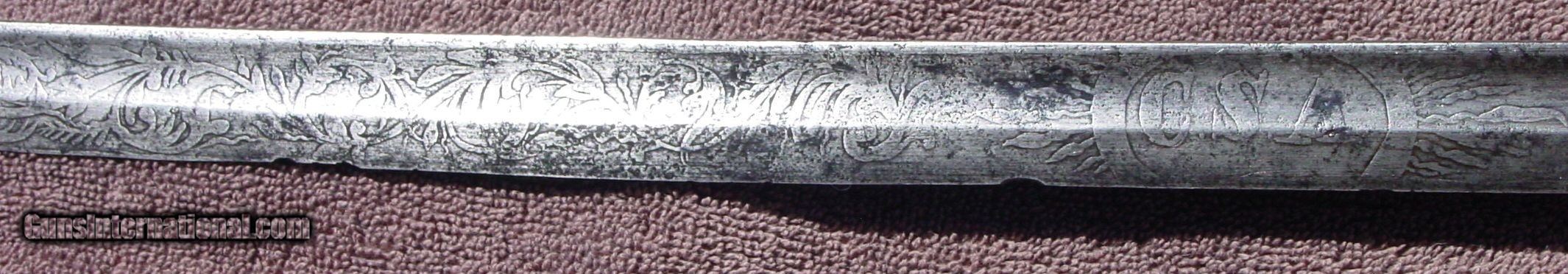 Description: Rare college Hill Confederate College Hill sword made for ga officer, having the most beautiful etched blade i have ever seen on a conf sword-pommel and blade having depictions of Ga. state flower along with a wonderful 1st model furreled conf flag on one side of the blade and a great CSA within a sunburst and amongst the florals.. leather scabbard is an import i believe is original to the piece, there is a repair to the leather just above the drag. grip leather and wire are original and perfect. if you want a unique conf sword this is it--the blade etching is deep- SOLD |