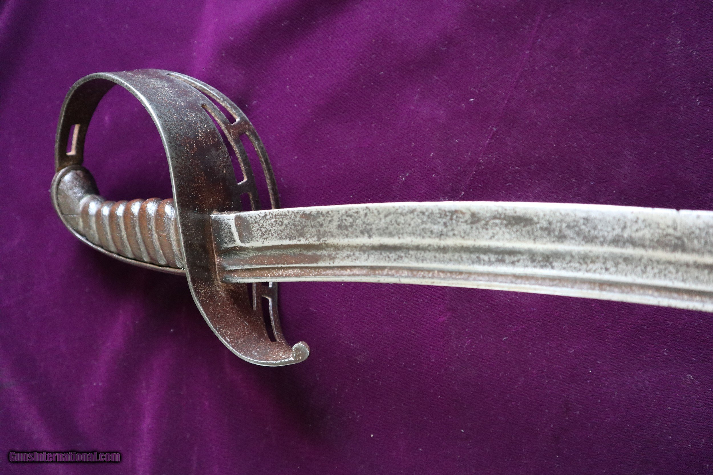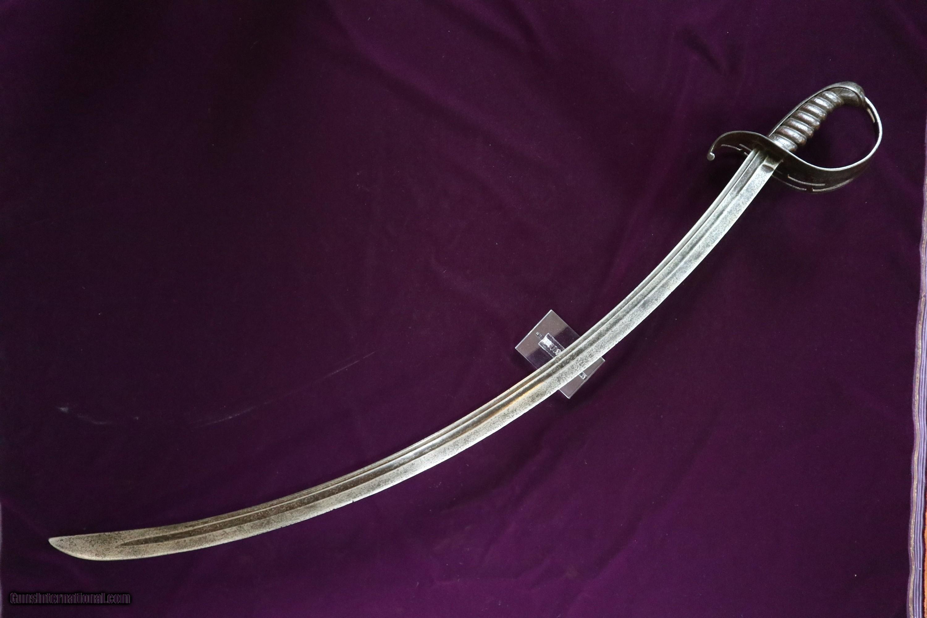 Description: PRESERVING HISTORY CIVIL WAR CONFEDERATE 2ND MODEL RARE VIRGINIA MANUFACTORY VIRGINIA CAVALRY SABER SWORD MARKED WITH THE N 2 AND AN X ON RICASSO FULL LENGHT BLADE NOT CUT DOWN. SOME OF THESE SWORD WERE CUT DOWN THIS ONE WAS NOT. VERY SCARCE AND DESIRABLE . MEASURES 44 INCHES WITH A 39 1/2 INCH BLADE. WHEN YOU BUY THE BEST YOU WILL NEVER HAVE TO MAKE EXCUSES LATER. This is a scarce and very desirable example of a Confederate 2ND Model Virginia Manufactory Cavalry Saber. The full lenght blade measures 39 1/4 inches. The iron bird’s head hilt has the usual half-basket sheet iron guard, which is perforated with 7 slots in its face, arranged in two rows, four on the outer edge and three on the interior. The sword knot slot remains in place at the rear of the knuckle guard as well. The guard extends 2 inches above the spine of the saber, with a gently forward swept quillon that terminates in a slightly bird’s head shaped flat quillon. The original leather grip is gone and the 7-groove wood grip has a nice patina. The blade is marked “2” and an X, and has a few nicks on the blade battle related . I have another shorter one listed see photo N3 shown in the photo only for comparison in size. SOLD |