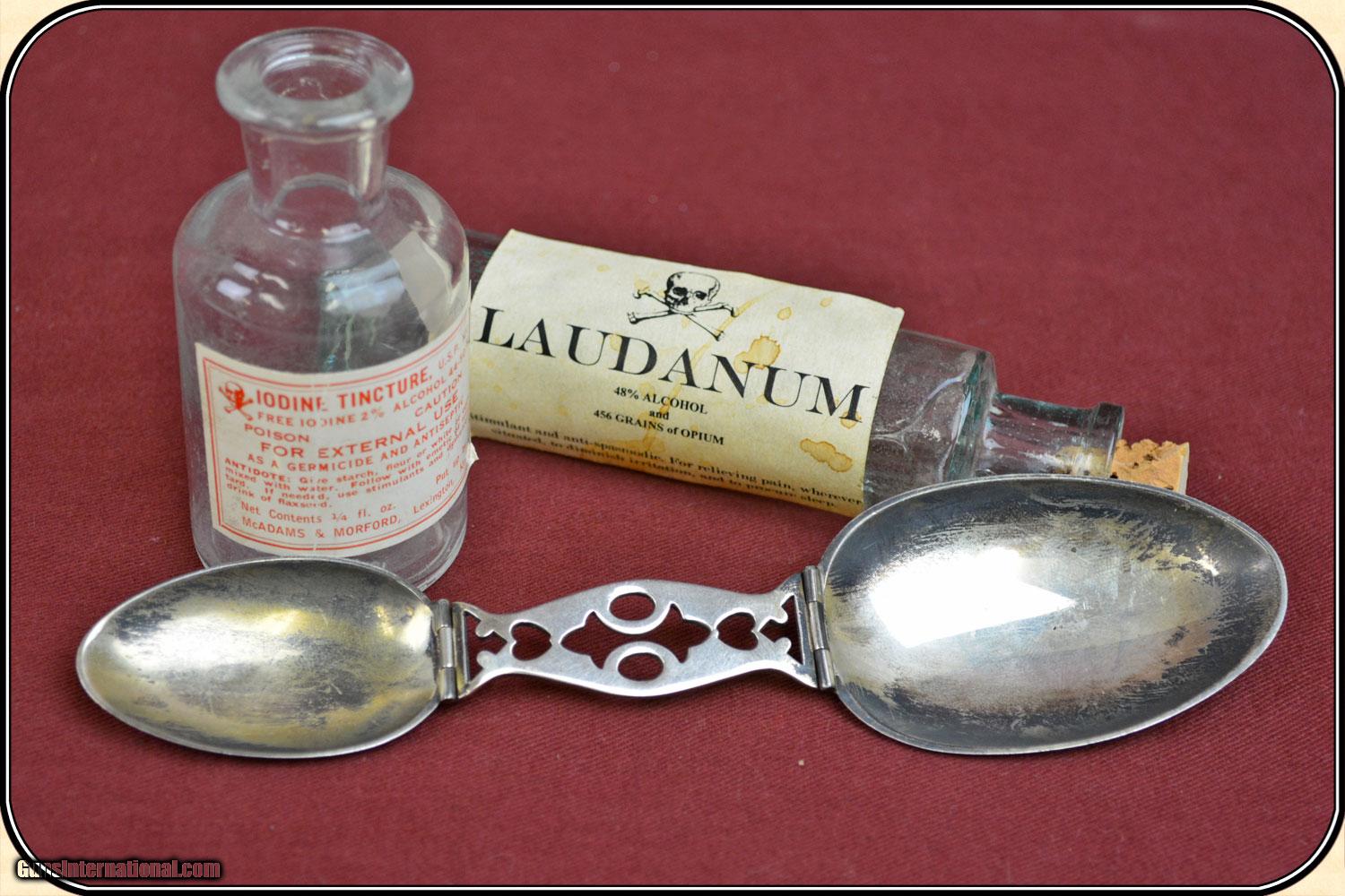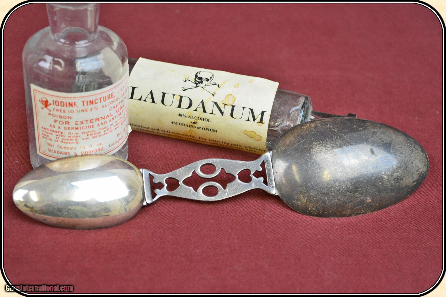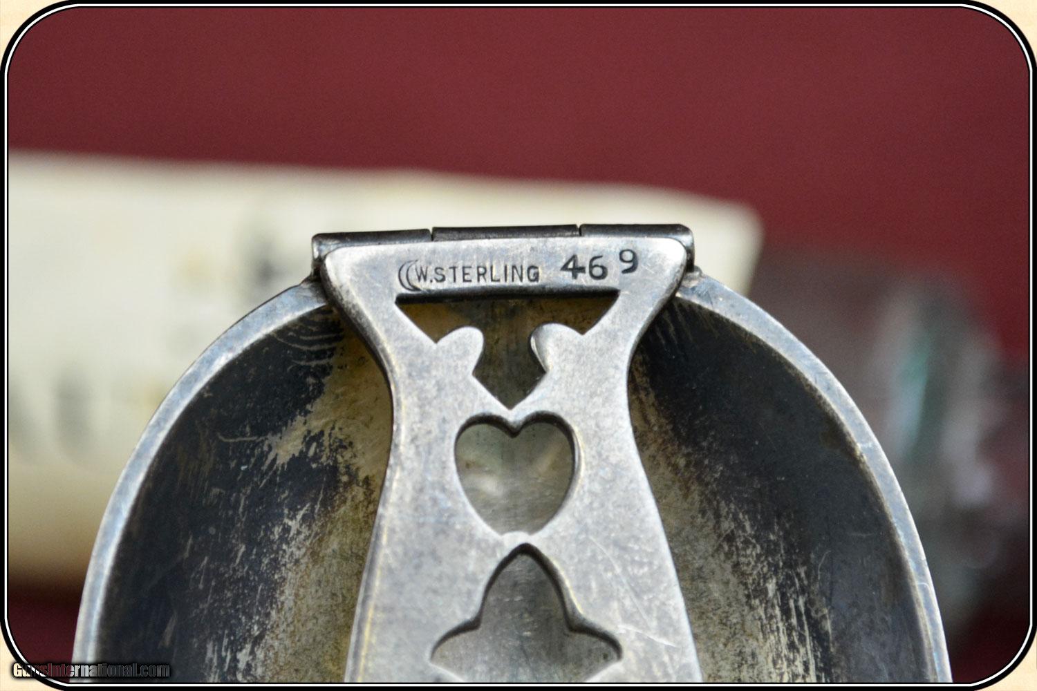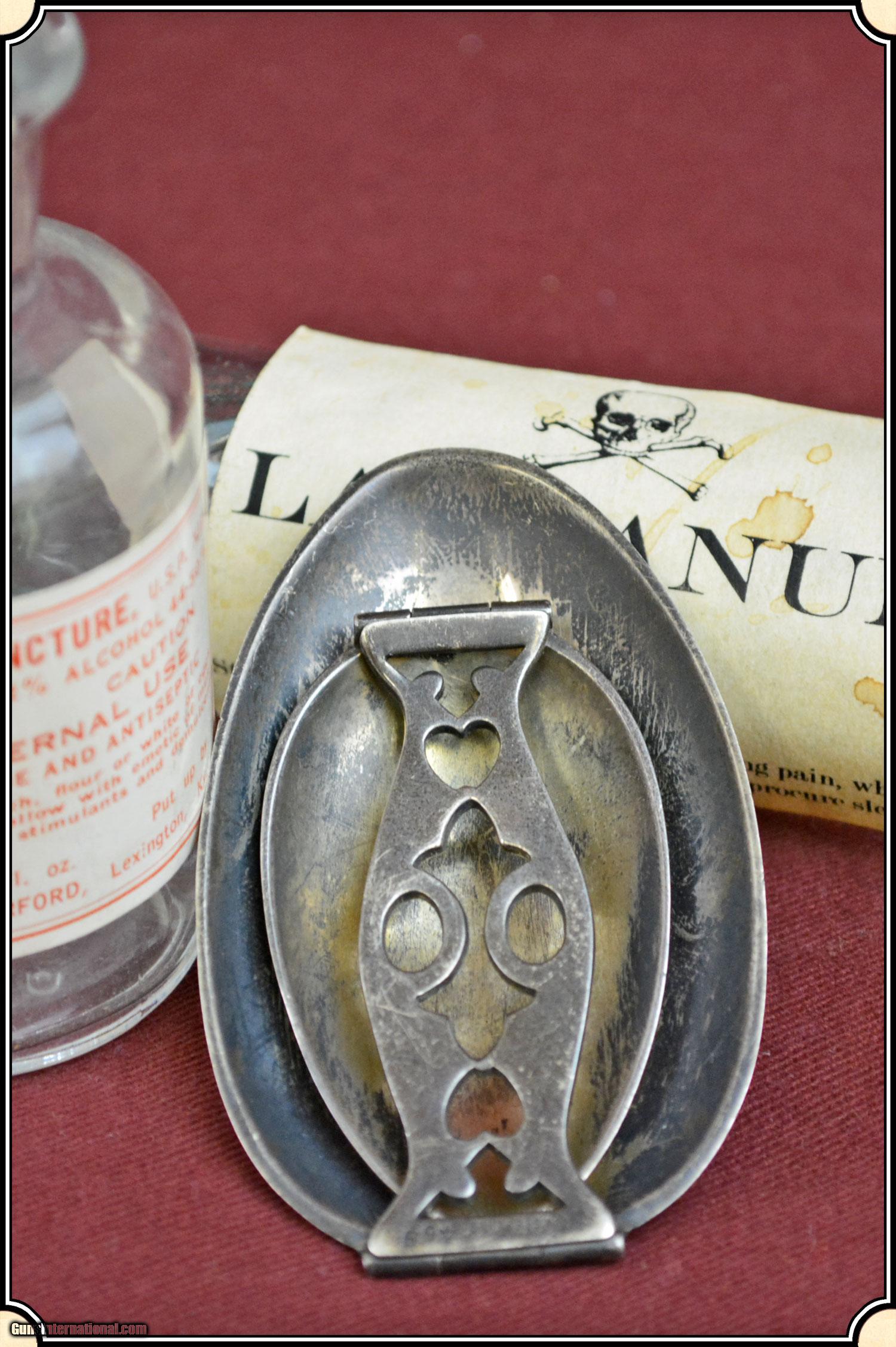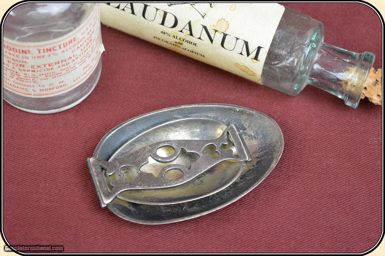 Description: A Sterling Silver Doctor's Medicine Spoon, ca. 1860s 7" open. Hinged sterling silver folding spoon with one larger bowl and one smaller joined by a pierced ornamental band, marked on the back with a crescent W. Sterling 469. weighs, 1.21 toz. From the time when medicine was administered by the spoon full. It is in very good shape. The hinges are in perfect condition. Show plenty of dark tarnish as sterling is want to do. From the collection of : Doneldon M. Dennis PAYMENT Cash, postal money order, cashiers check, personal & business checks. May order at riverjucntion on-line with credit card. SOLD |