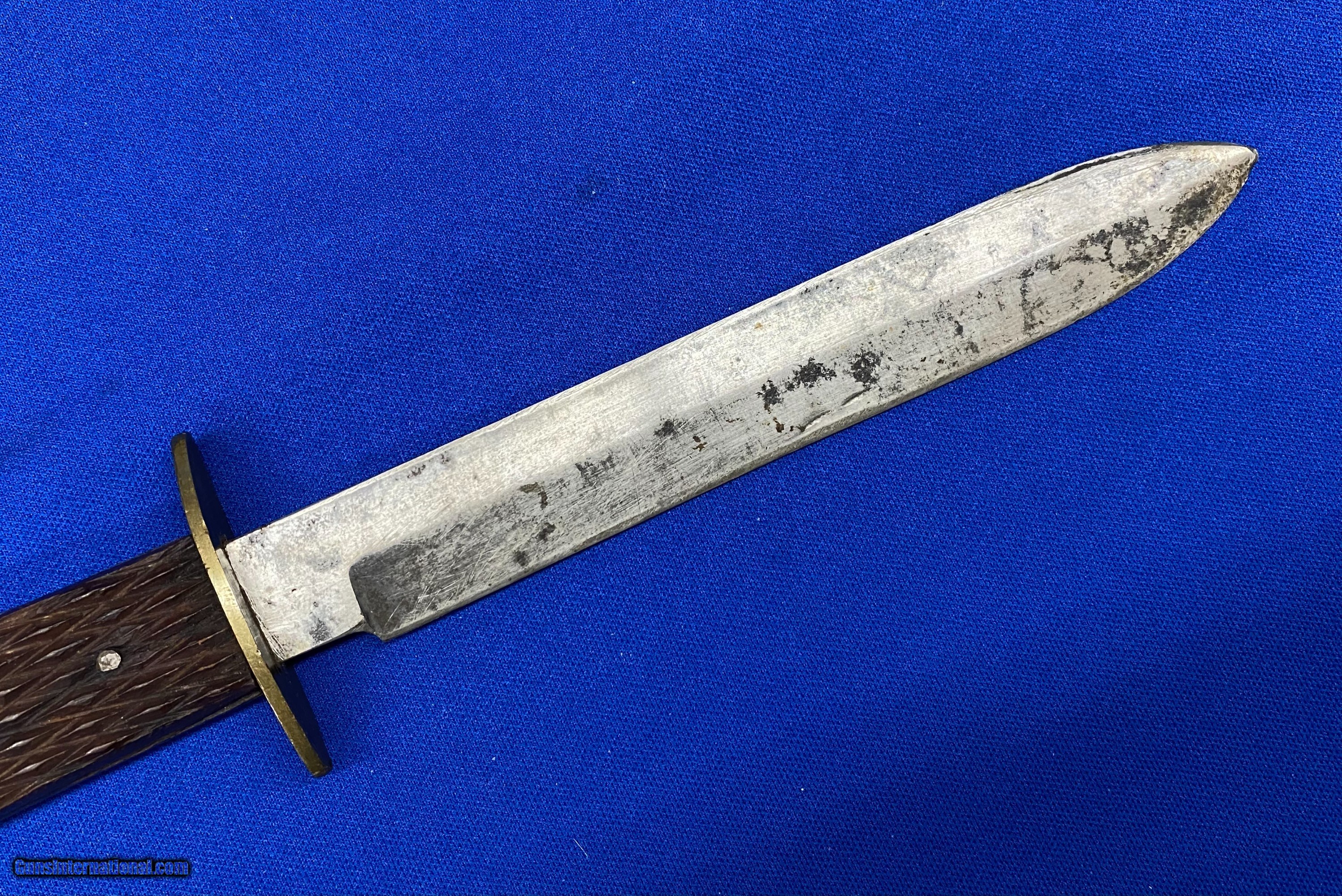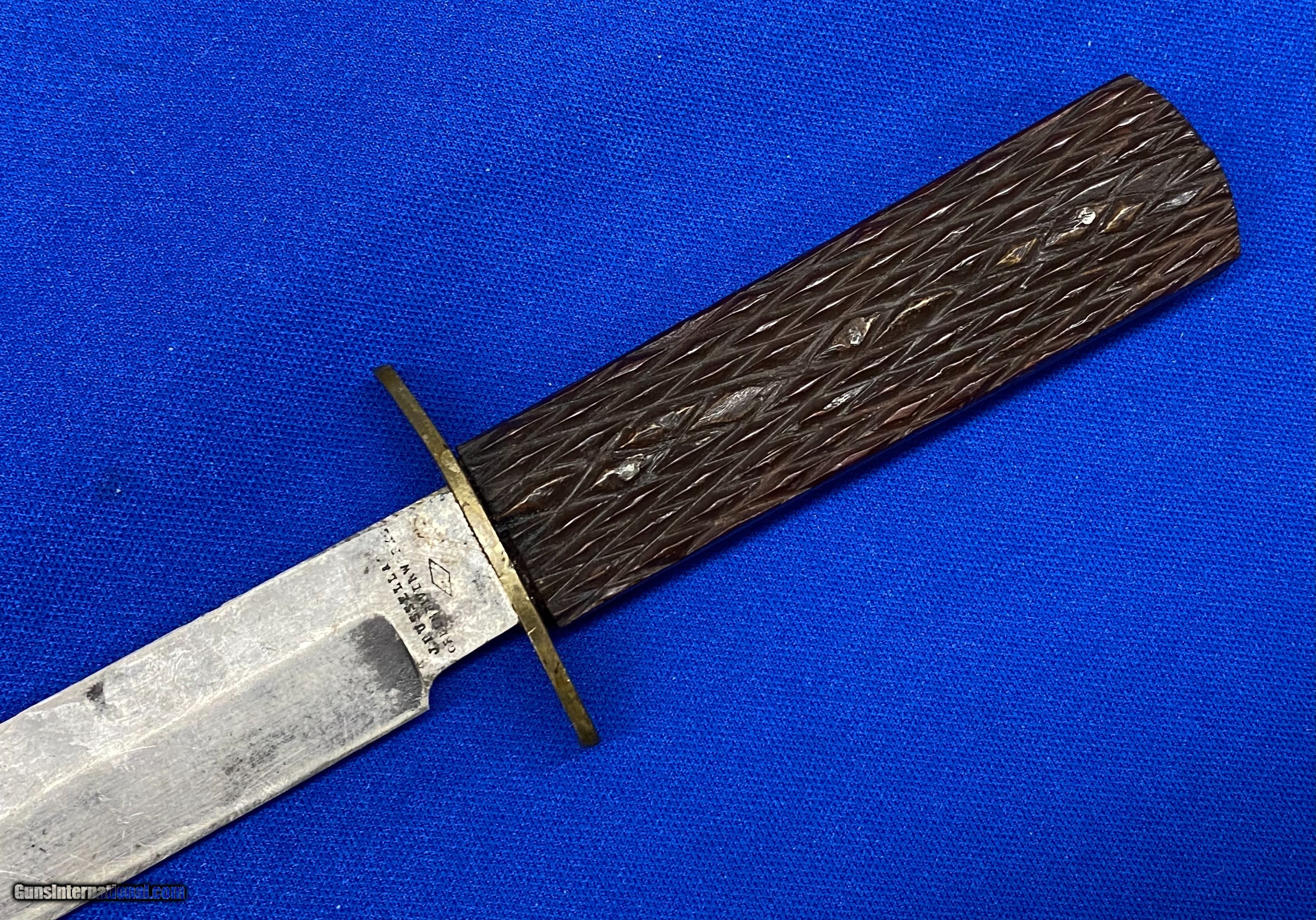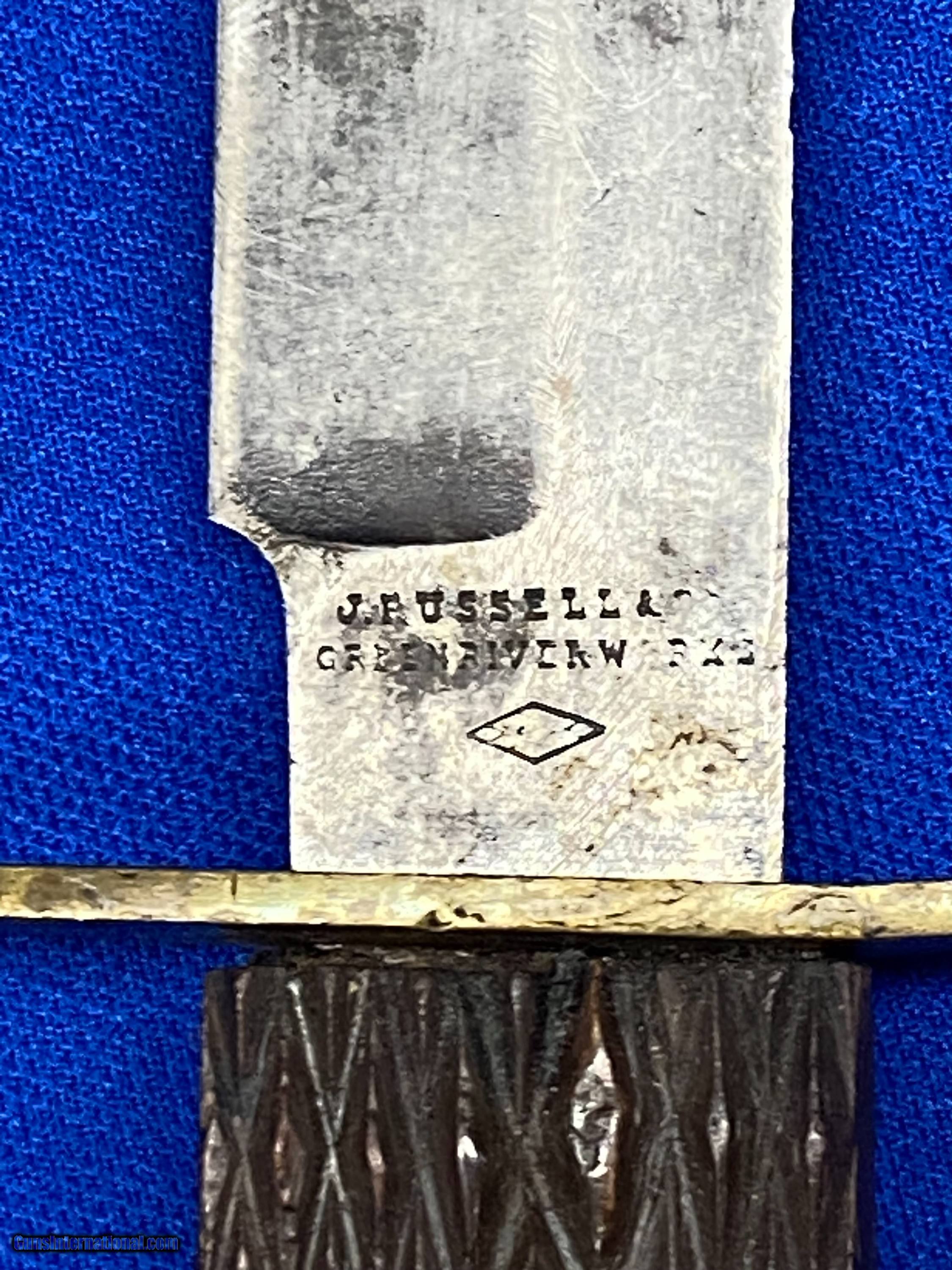 Description: This is an original Civil War era J. Russell & Co. Bowie style knife in very nice untouched condition. The knife measures 102-1/2” overall with a 7-5/8” carbon steel blade. The blade has toned to a silvery gray patina. The obverse ricasso has two-line J. Russell & Co. Green River Works with the diamond maker mark. The oval guard is made if brass and has a pleasing soft patina, and the two piece stag handles remain in excellent and each fastened by three bright brass pins. SOLD |