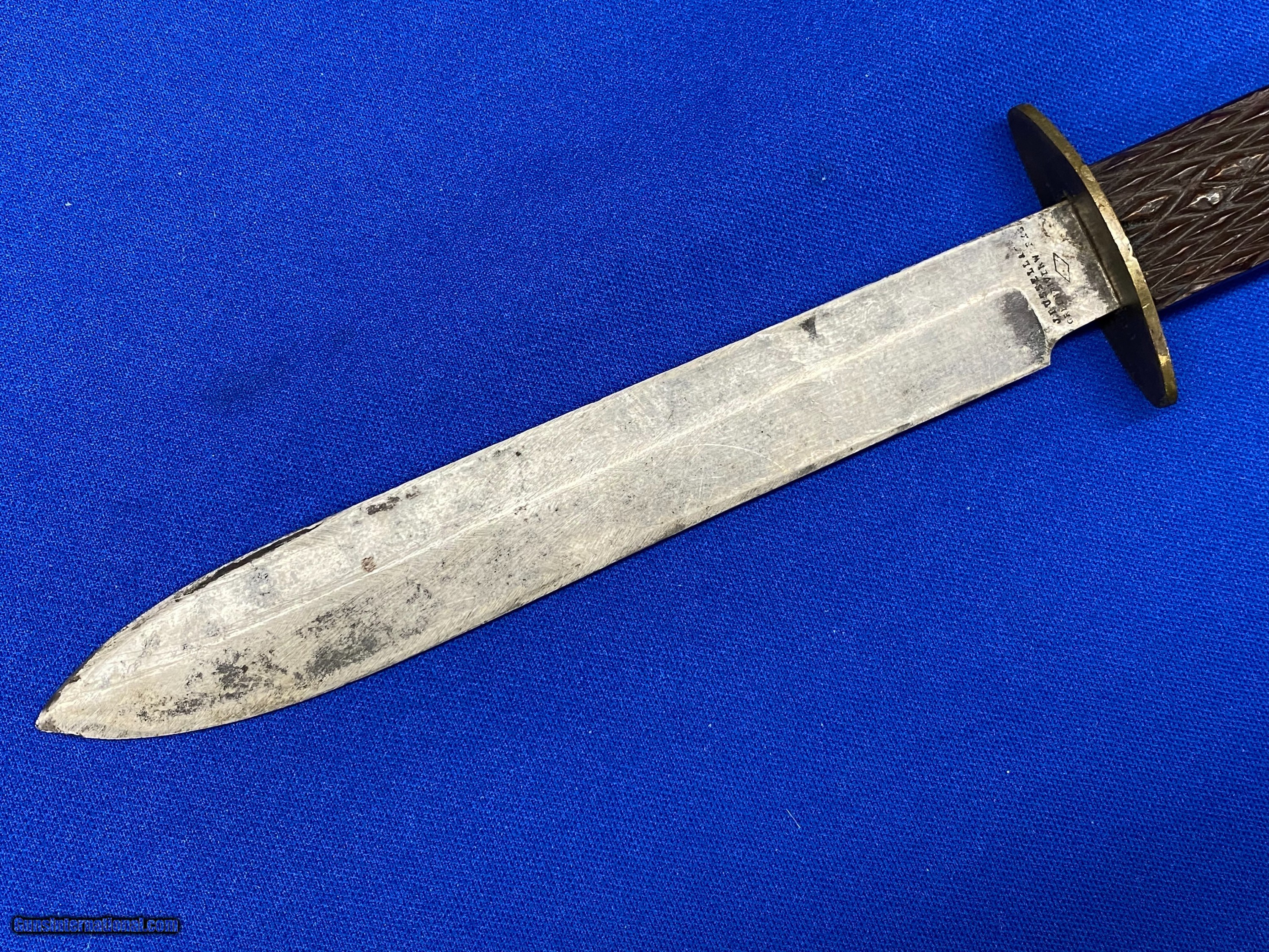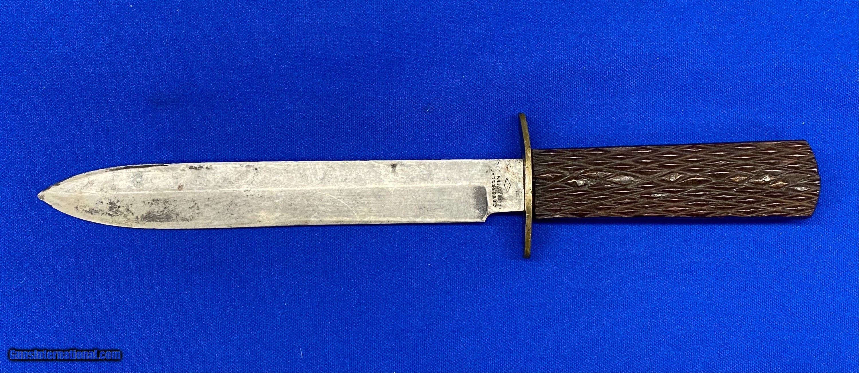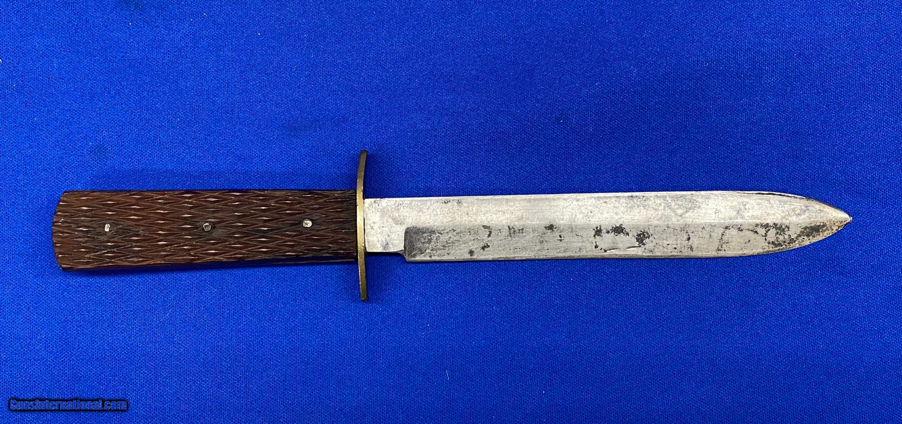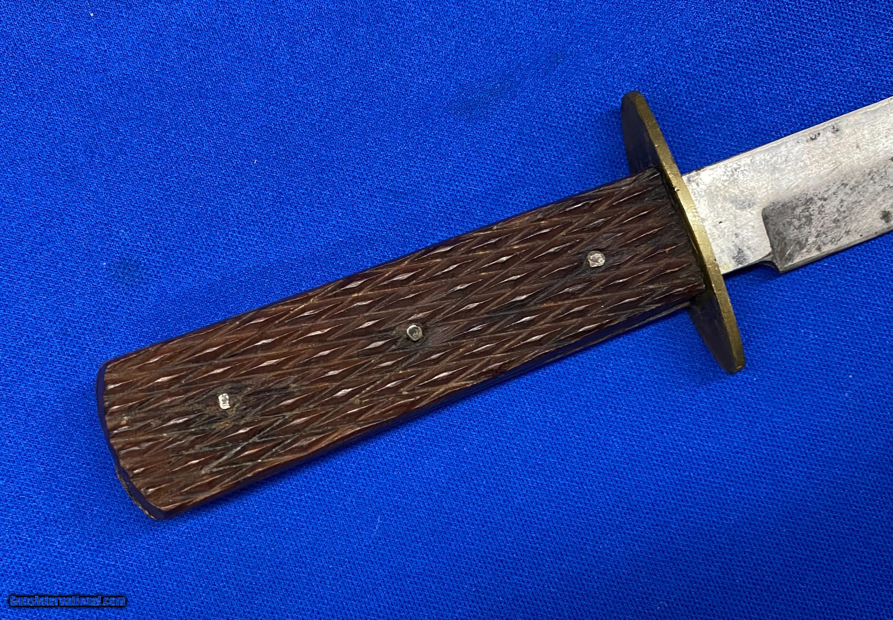 Description: This is an original Civil War era J. Russell & Co. Bowie style knife in very nice untouched condition. The knife measures 102-1/2” overall with a 7-5/8” carbon steel blade. The blade has toned to a silvery gray patina. The obverse ricasso has two-line J. Russell & Co. Green River Works with the diamond maker mark. The oval guard is made if brass and has a pleasing soft patina, and the two piece stag handles remain in excellent and each fastened by three bright brass pins. SOLD |