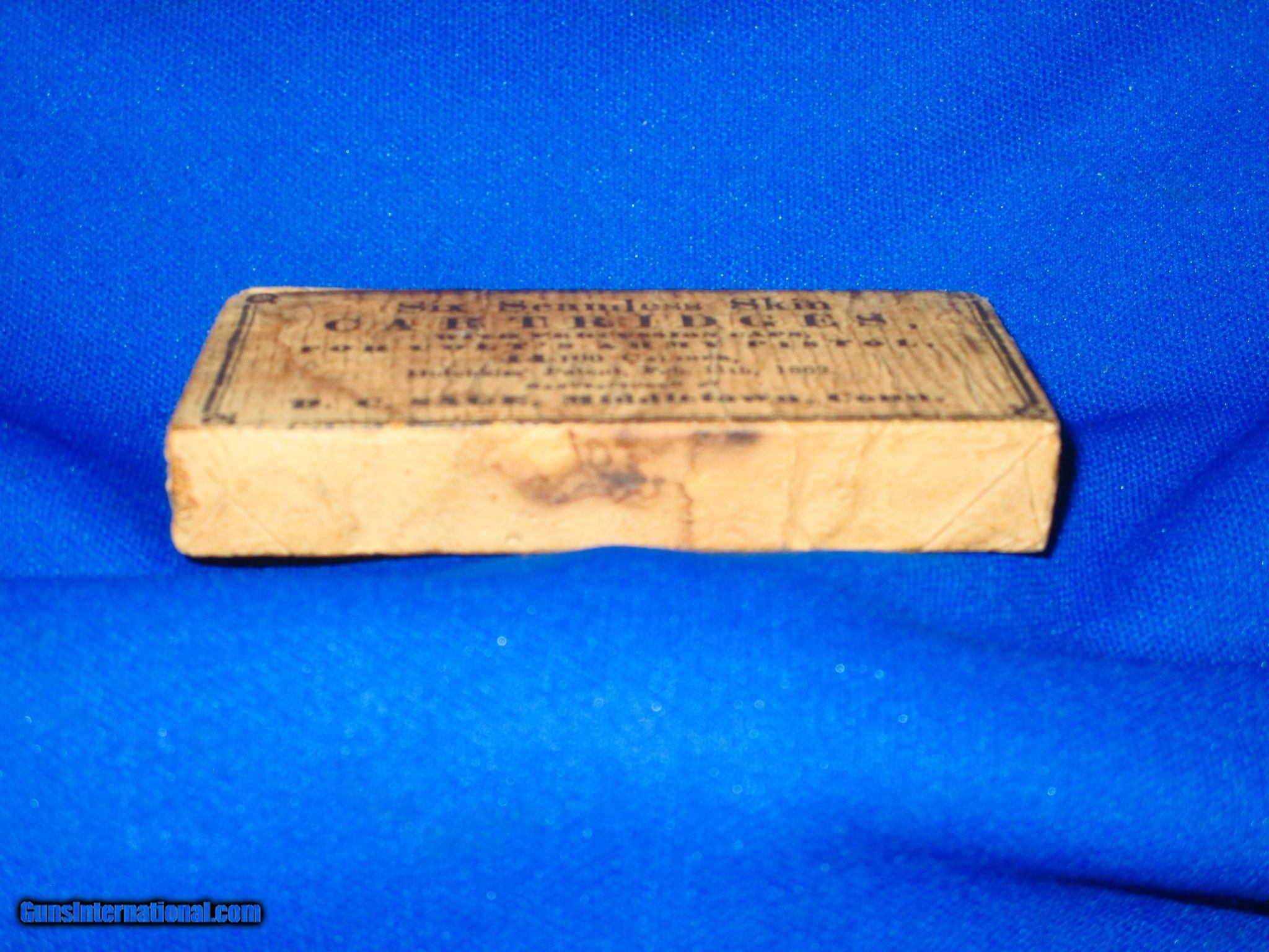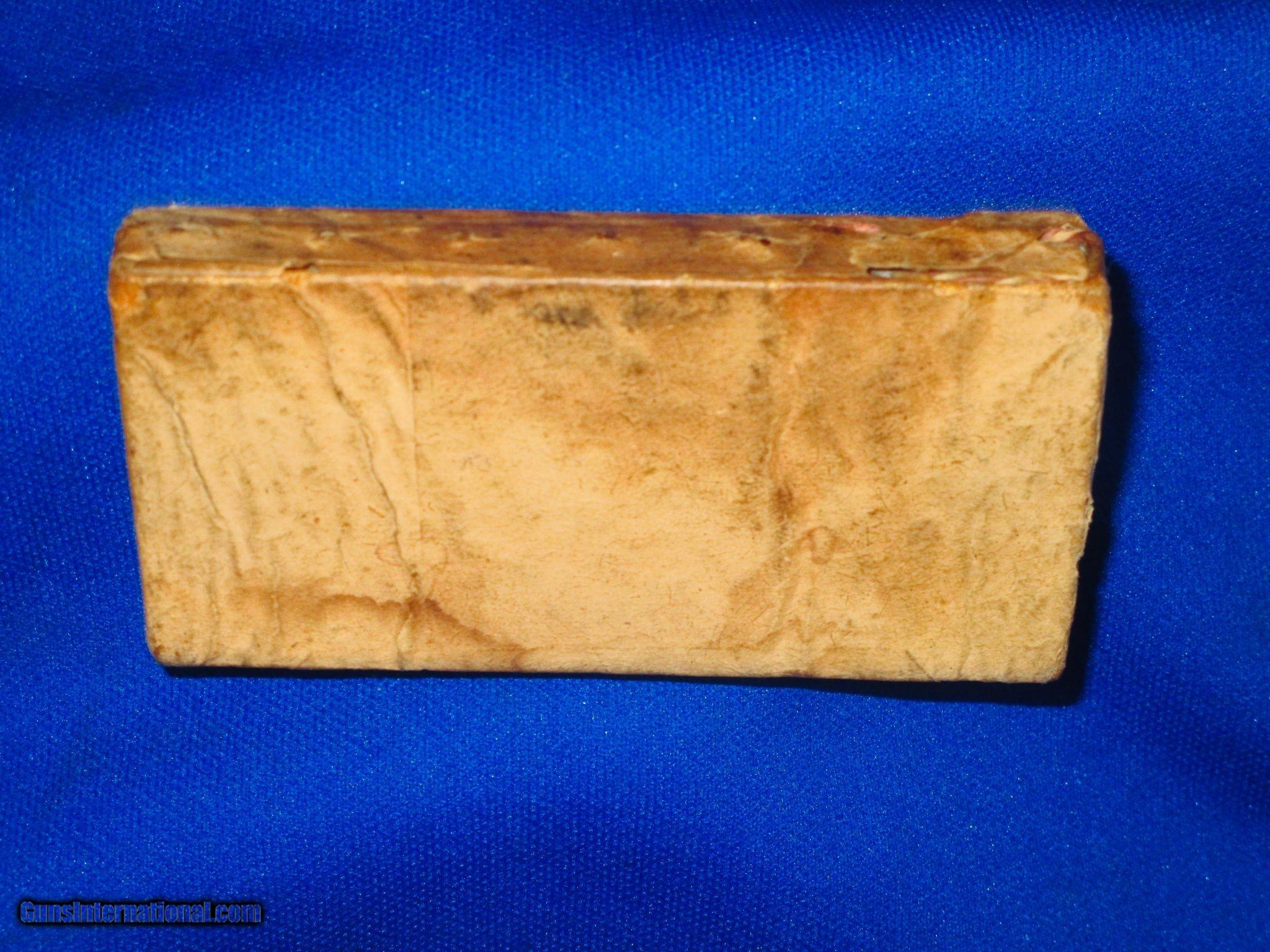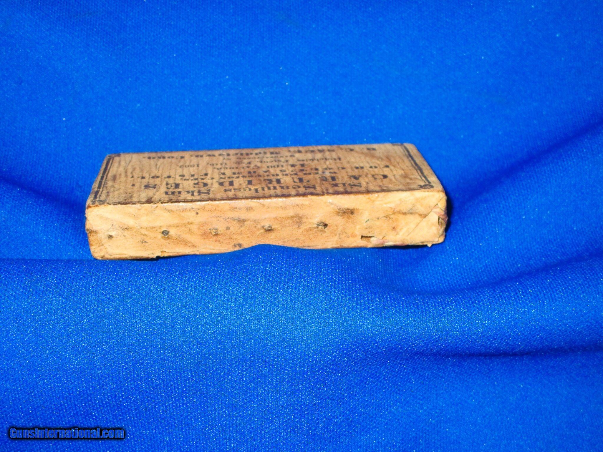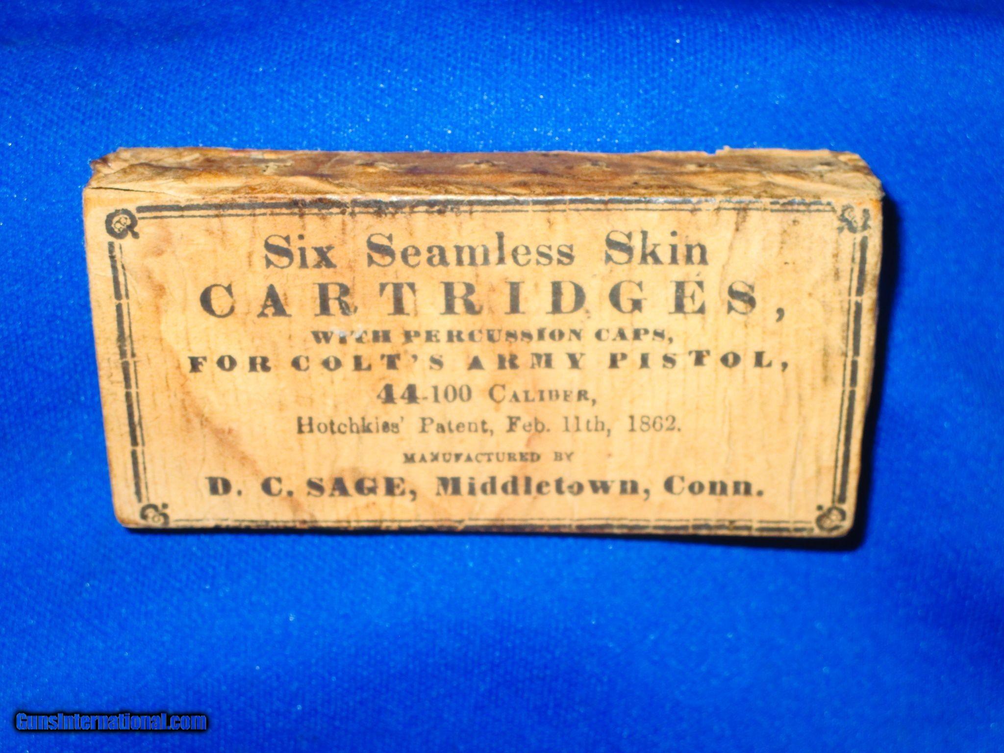Description: An Early And very Scarce Civil War Original Large pack Of "D.C. SAGE" Hotchkiss Patent, Feb. 11, 1862" Cartridges With Percussion Caps For a Colt Model 1860 Percussion Army Revolver In Fine Untouched Condition. All original throughout. The pack has fine clear markings on the label. It has its original paper wrap still on it. The pack is still sealed throughout. It contains 6 Colt Army Cartridges and Caps inside it. The large pack measures 3 5/8 inches by 1 3/4 inches. This Is A Fine Example Of A Rare Large Pack Of Civil War Hotchkiss Patent, 1862, Made By D.C. Sage Marked Cartridges With Caps For A Civil War Colt Model 1860 Percussion Army Revolver! We do not sell or ship any Antique Guns or Antique Ammo to anywhere in New York State. SOLD |