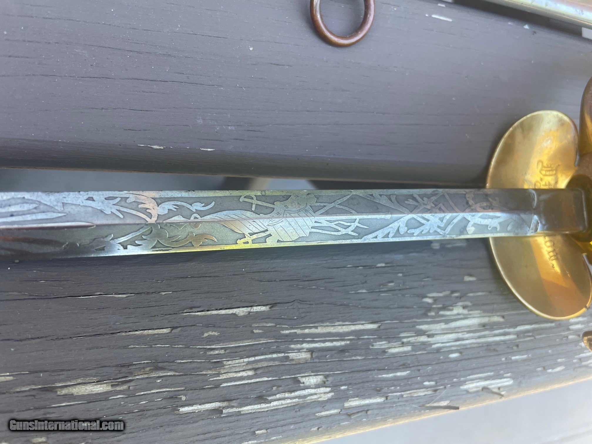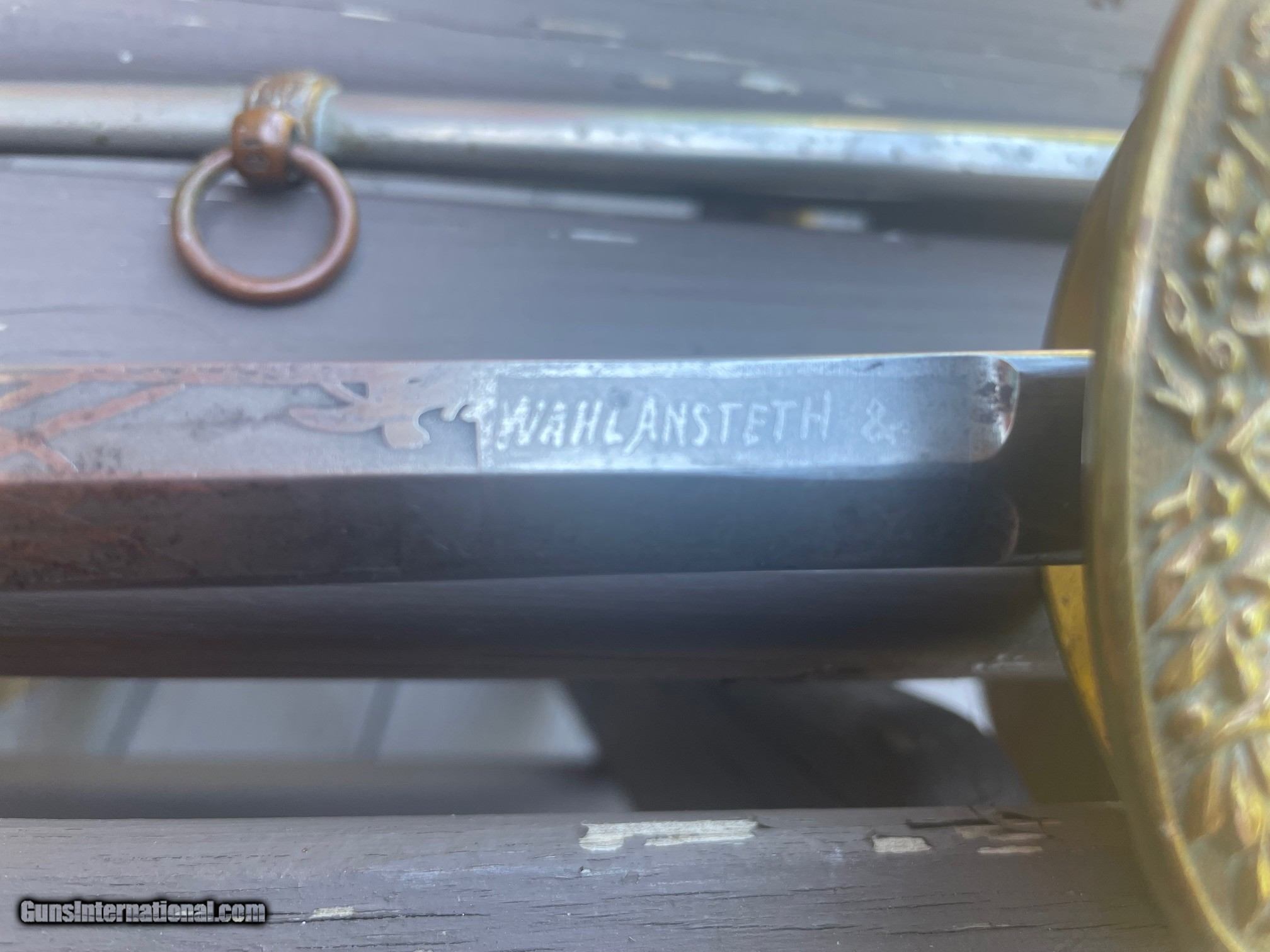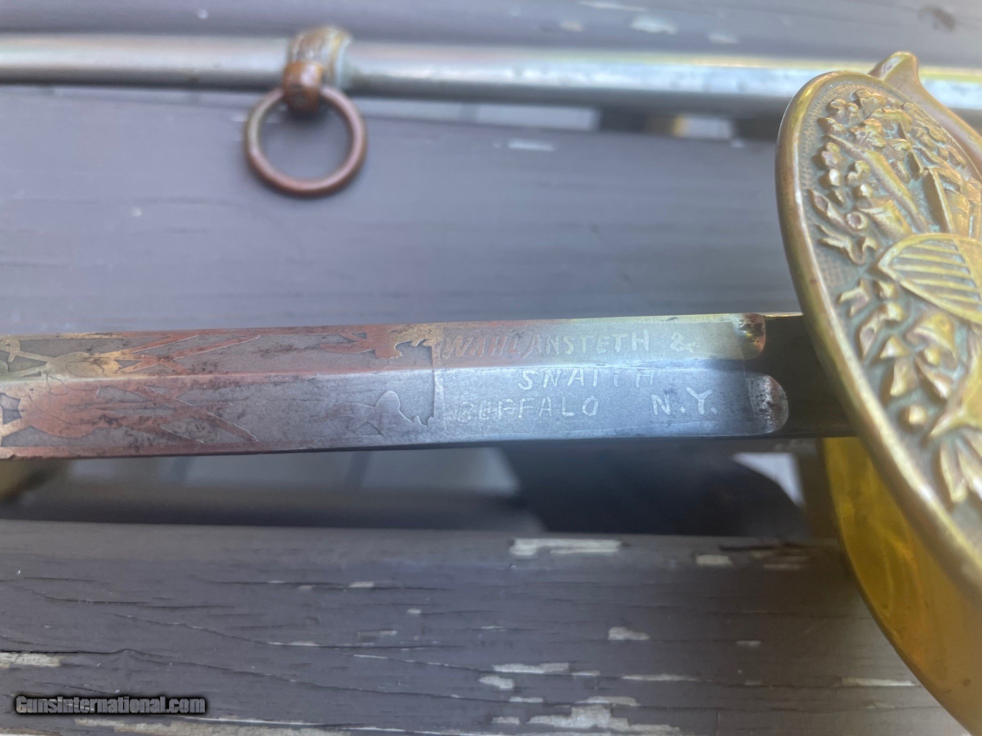 Description: THIS VINTAGE SWORD BY WAHLANSTETH & SNAT??? OF BUFFALO, N.Y. SHARK SKIN HANDLE, ENGRAVED BLADE, UNDER THE HAND GUARD IS ENGRAVED D.D.CUDLOW. I SHIP USPS INSURED TO THE LOWER 48 STATES ONLY SOLD |