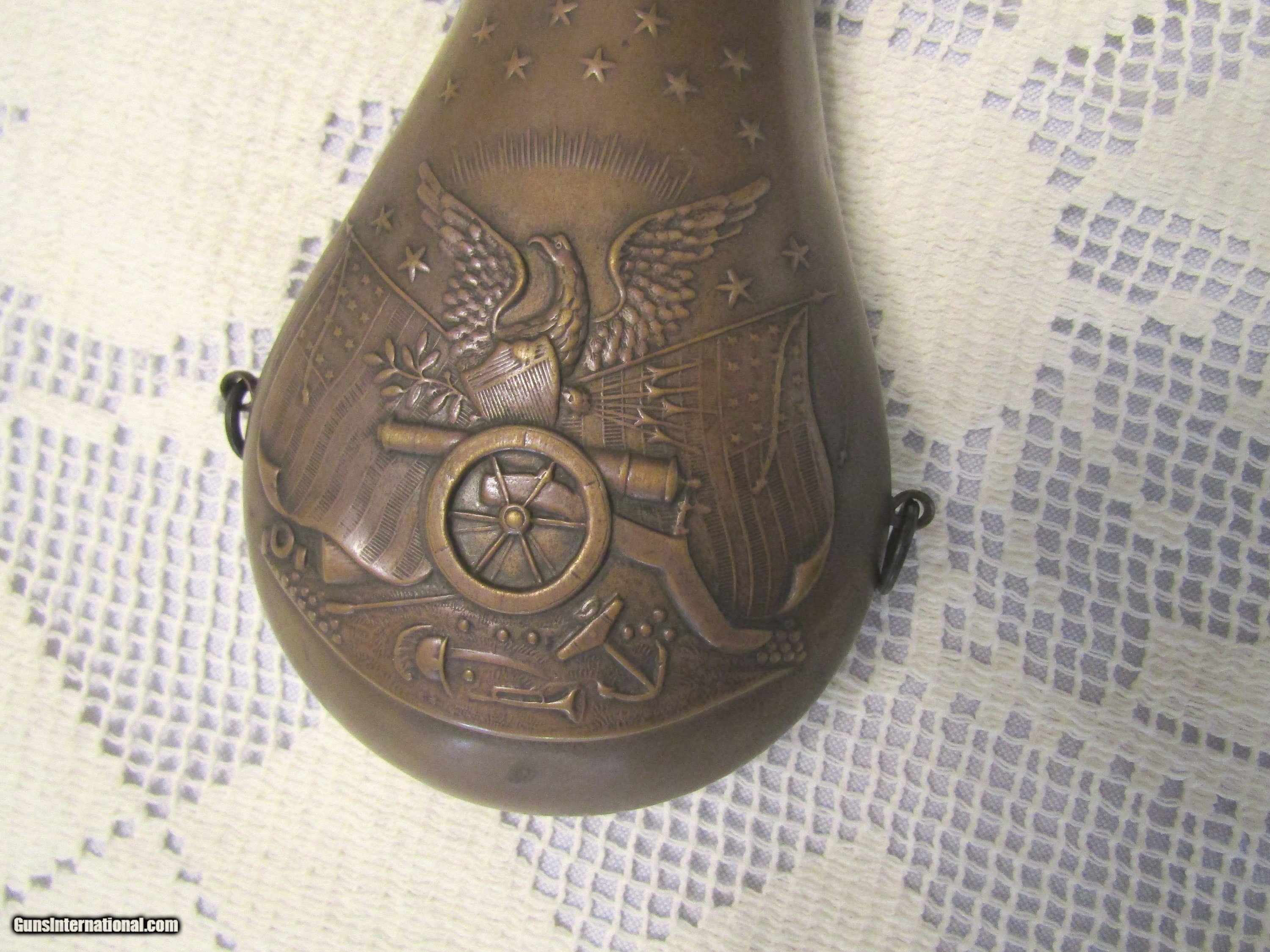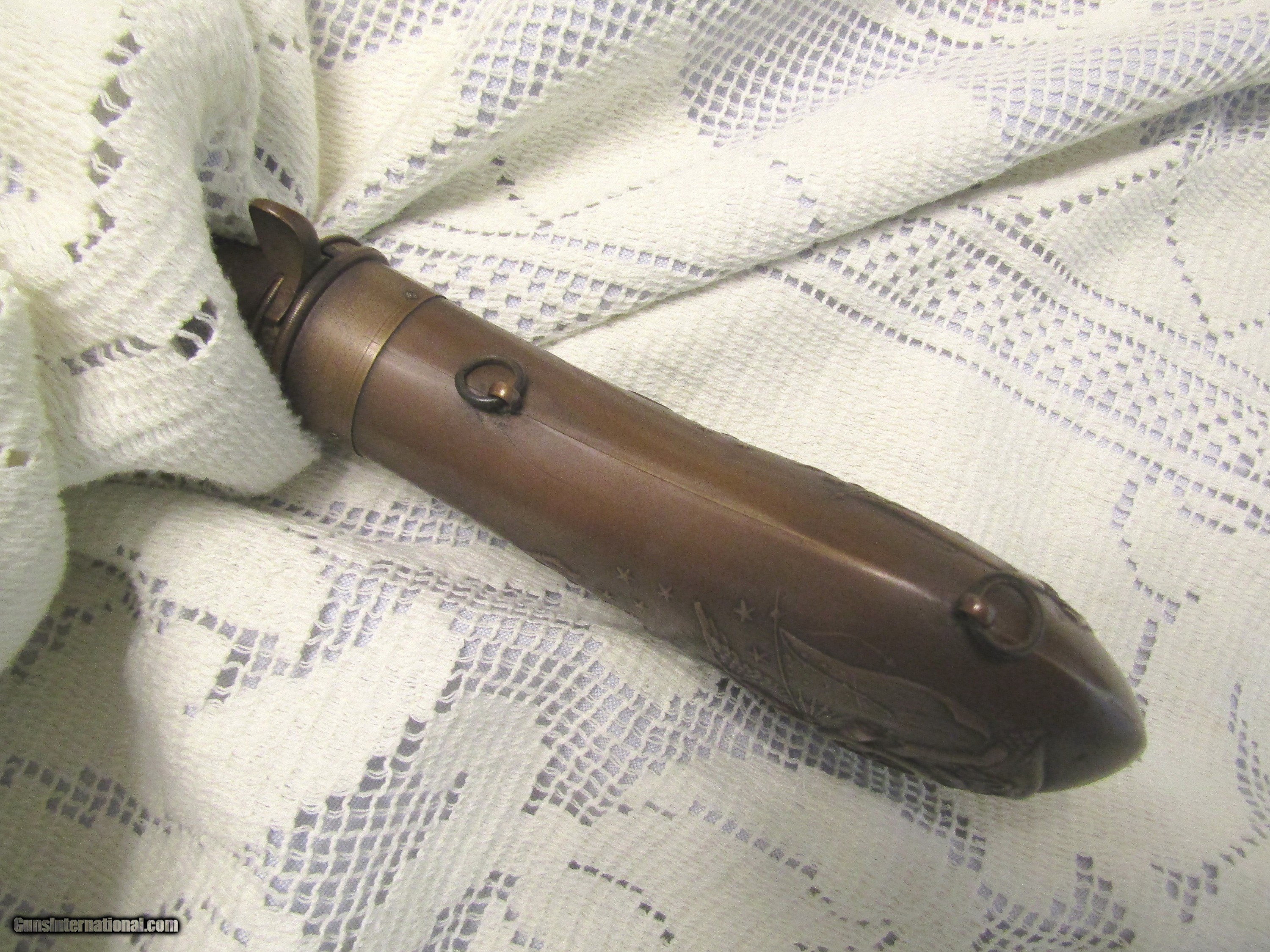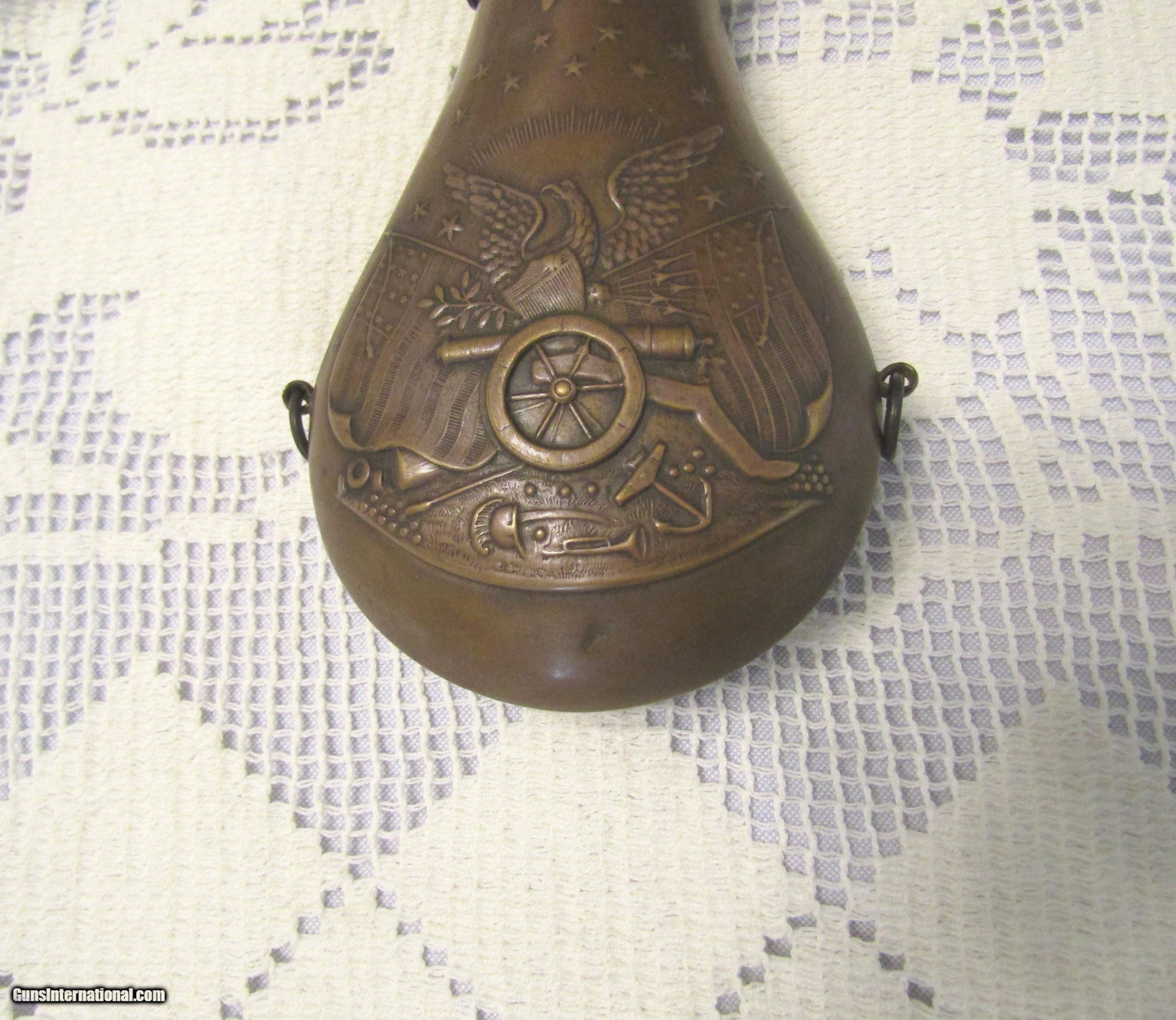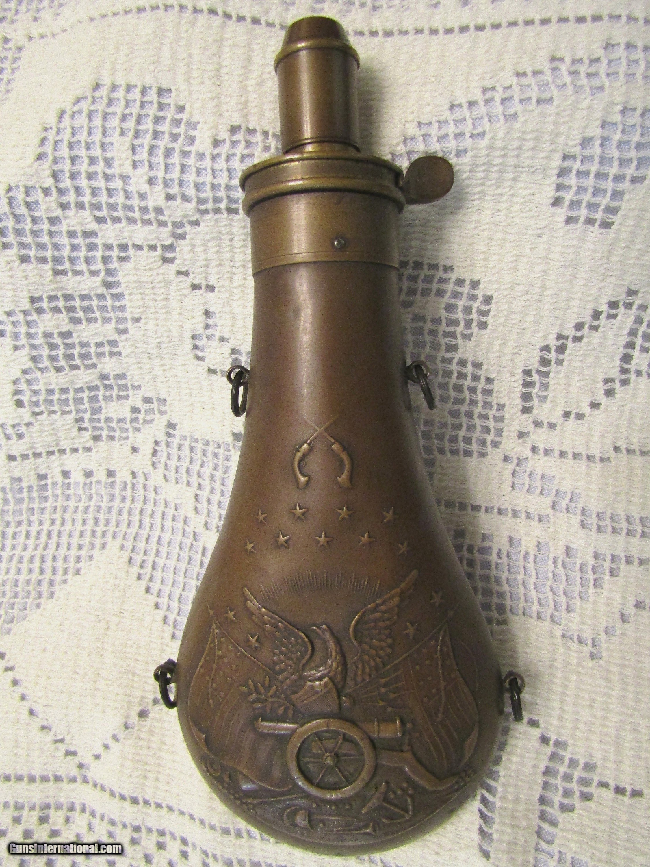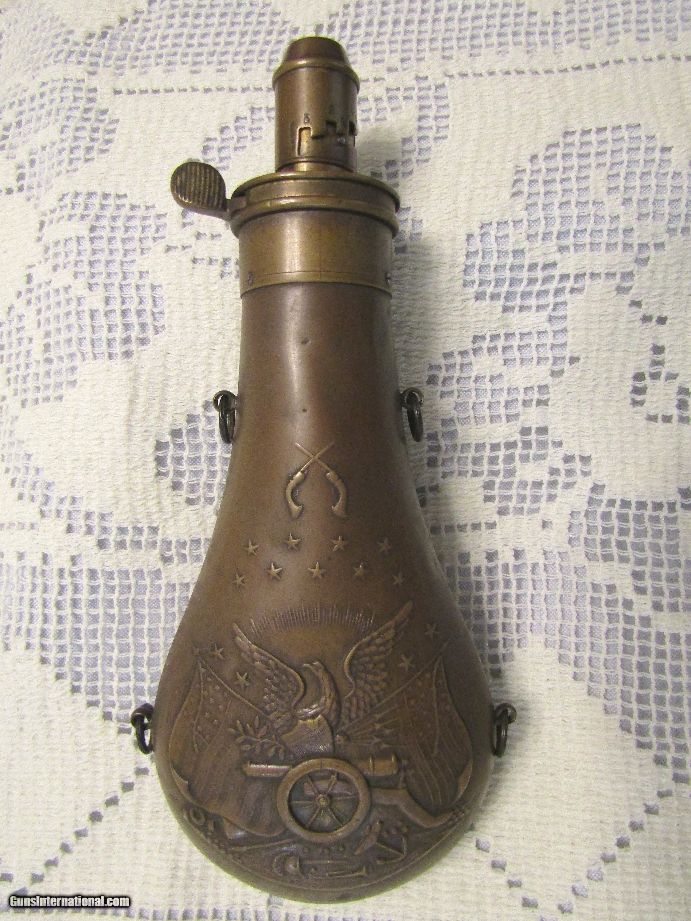 Description: This is a very good Colt Revolving Rifle powder flask, made by Am. Flask & Cap Co. It has all four of the original carrying rings. The spout adjusts correctly and the top screws off easily and the spring works as it should. The seams are perfect. It has a few scattered handling marks which I have tried to picture accurately. It has a beautiful dark patina. These flasks were also used with large-bore revolvers that held a lot of powder. Also, with the Civil War Colt and other large-bore muskets. Great Civil War collectible. SOLD |