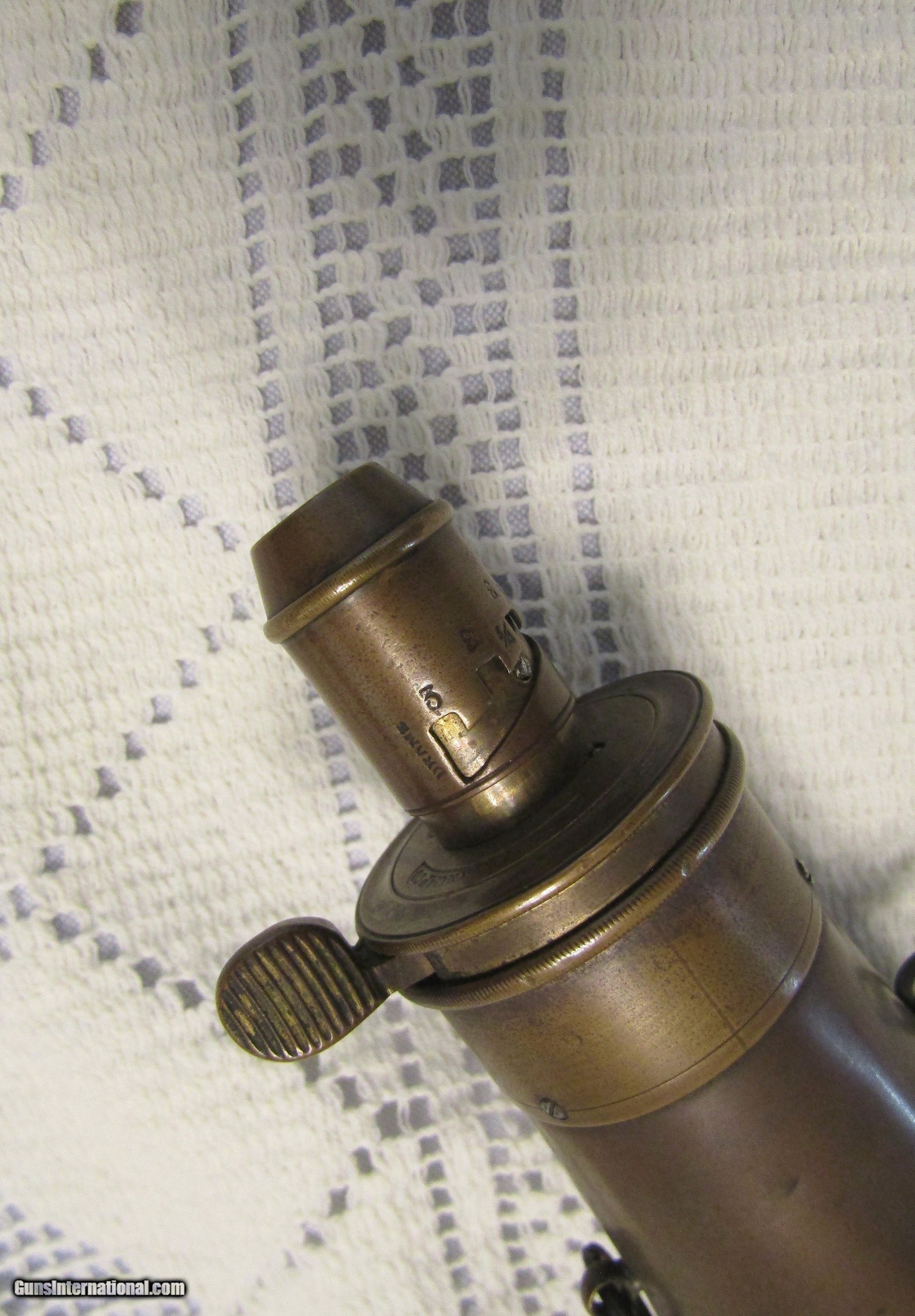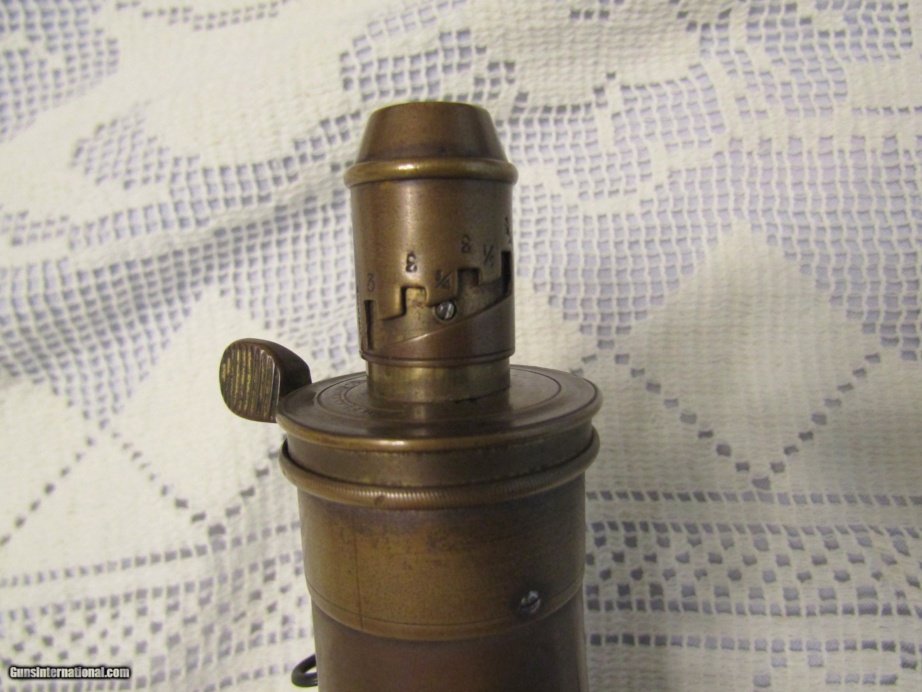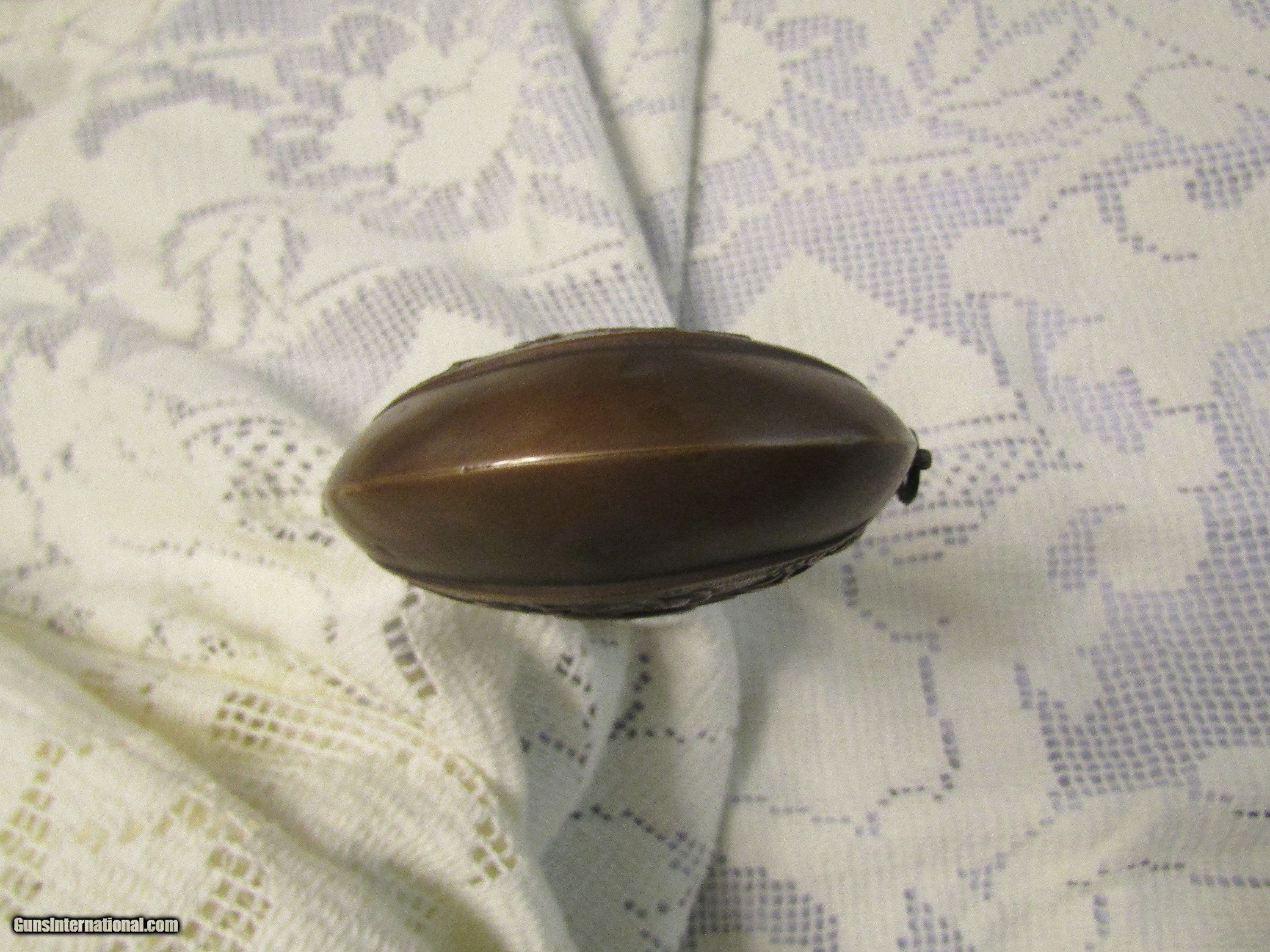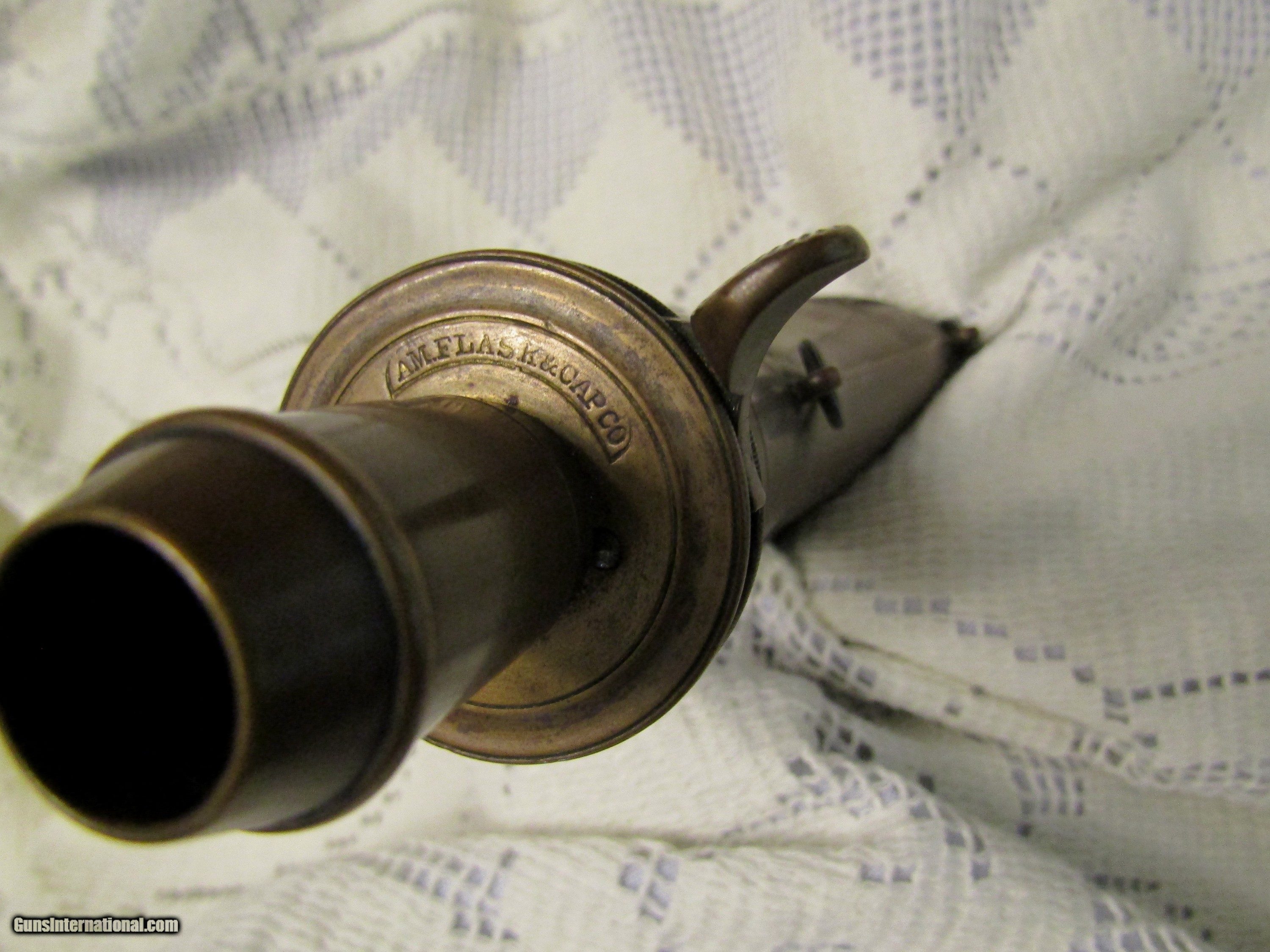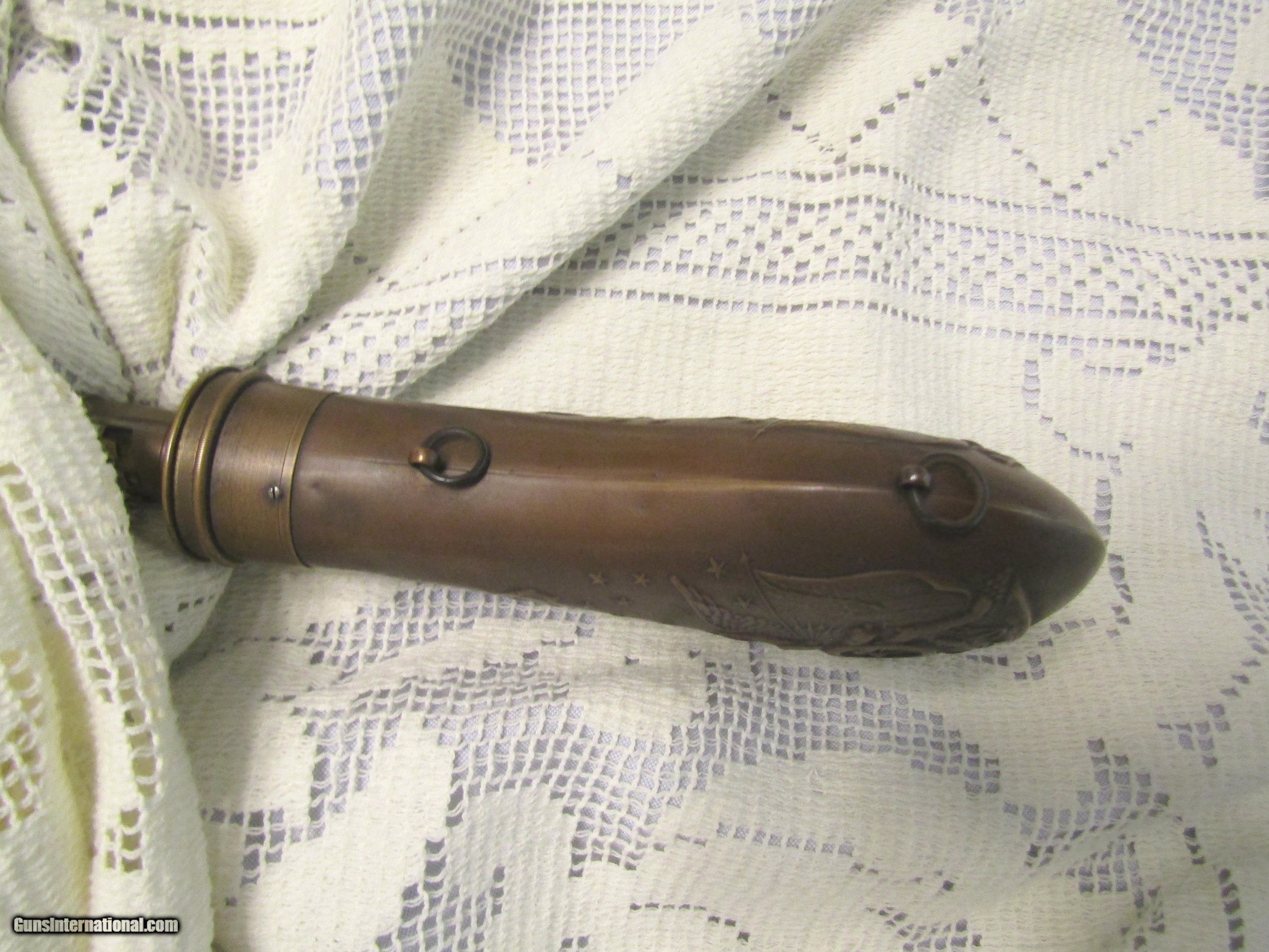 Description: This is a very good Colt Revolving Rifle powder flask, made by Am. Flask & Cap Co. It has all four of the original carrying rings. The spout adjusts correctly and the top screws off easily and the spring works as it should. The seams are perfect. It has a few scattered handling marks which I have tried to picture accurately. It has a beautiful dark patina. These flasks were also used with large-bore revolvers that held a lot of powder. Also, with the Civil War Colt and other large-bore muskets. Great Civil War collectible. SOLD |