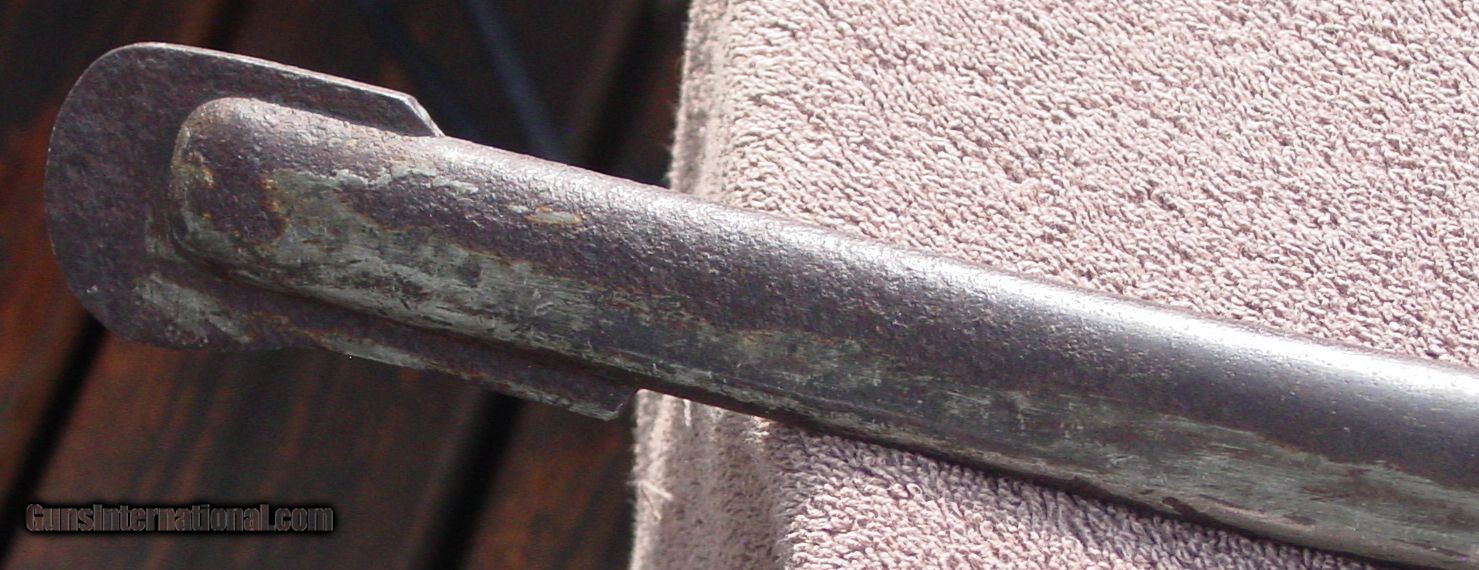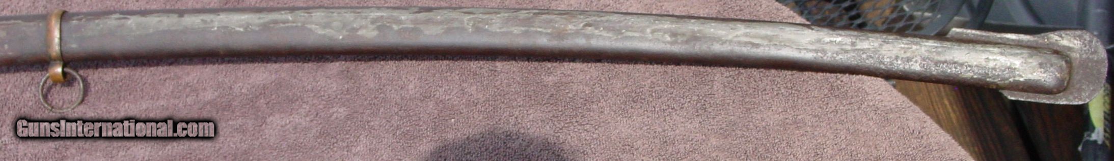 Description: Confederate cavalry saber made by Louis Haiman, Columbus, Ga, a standard variant with wonderful casting flaws, evidence of minor period sharpening, essentially a perfect scabbard one very minor push near top of drag, 100 percent of orig wire and oil cloth grip to include the original leather washer on bottom of the guard surrounding the 35 1/2 inch blade, a few minor battle blade nicks adds to the character of the fine confederate sword,some flash pictures show underlying solder beneath the varnish on the scabbard showing a dark reddish brown color throughout. A wonderful sword.Confederate cavalry saber made by Louis Haiman, Columbus, Ga, a standard variant with wonderful casting flaws, evidence of minor period sharpening, essentially a perfect scabbard one very minor push near top of drag, 100 percent of orig wire and oil cloth grip to include the original leather washer on bottom of the guard surrounding the 35 1/2 inch blade, a few minor battle blade nicks adds to the character of the fine confederate sword,some flash pictures show underlying solder beneath the varnish on the scabbard showing a dark reddish brown color throughout. A wonderful sword. SOLD |