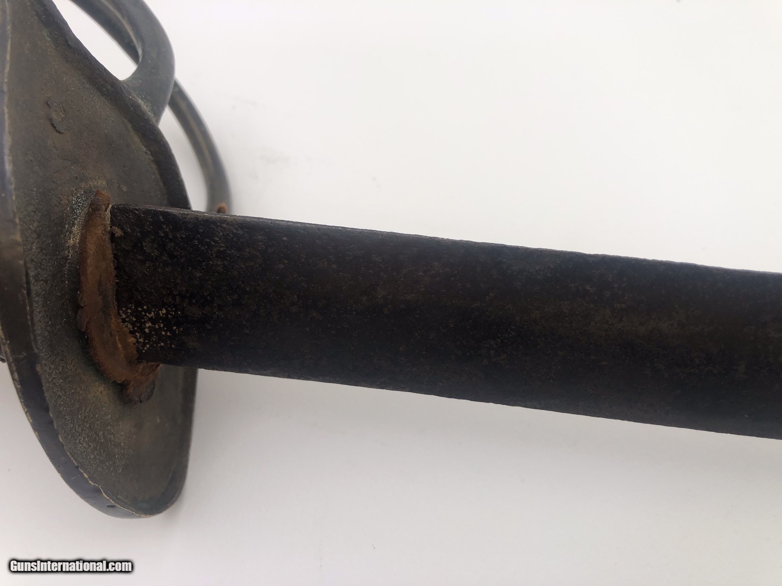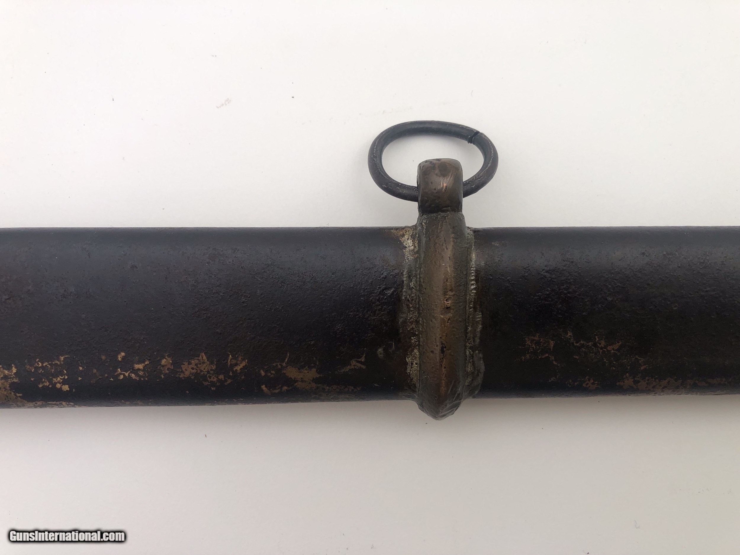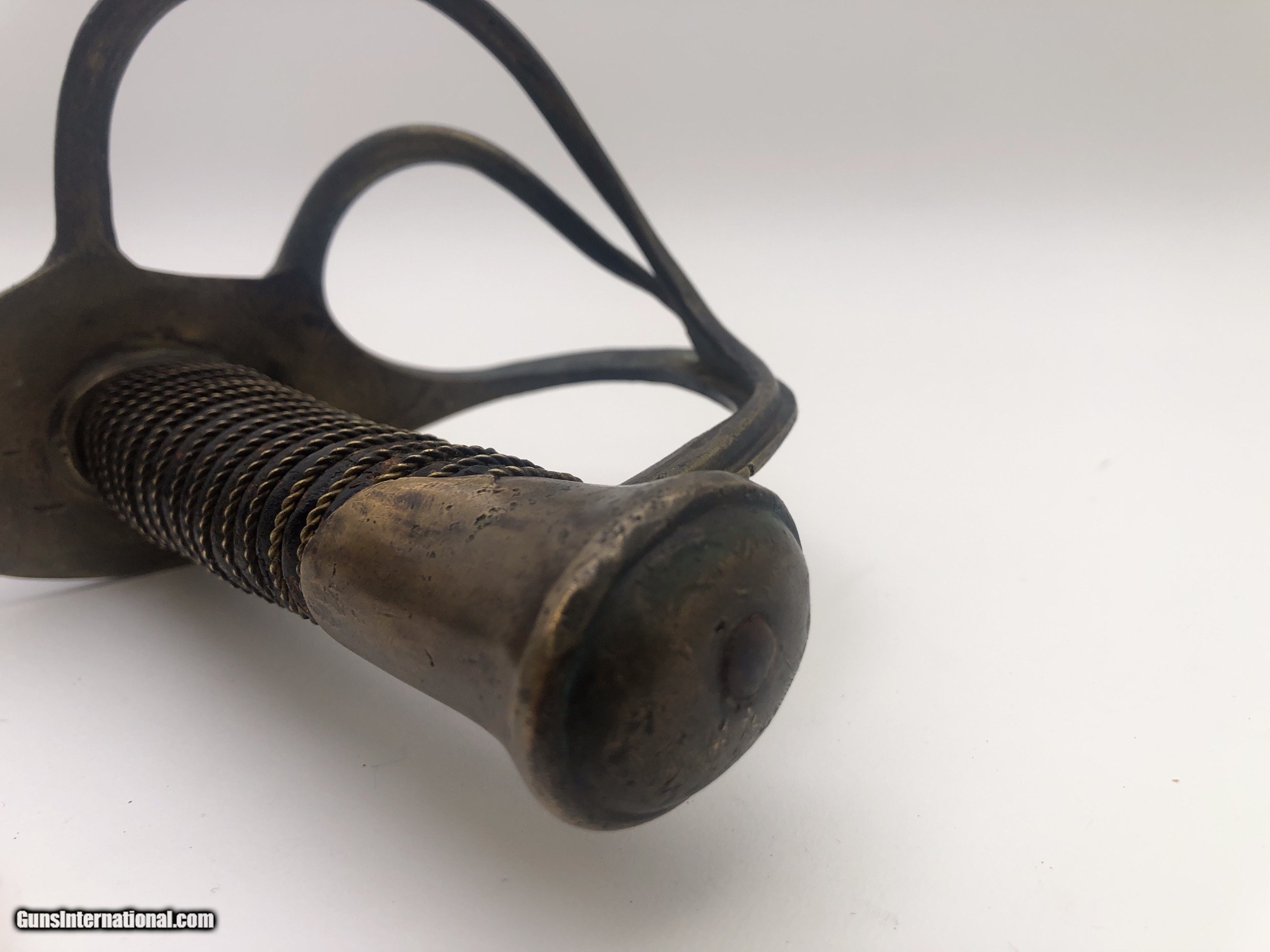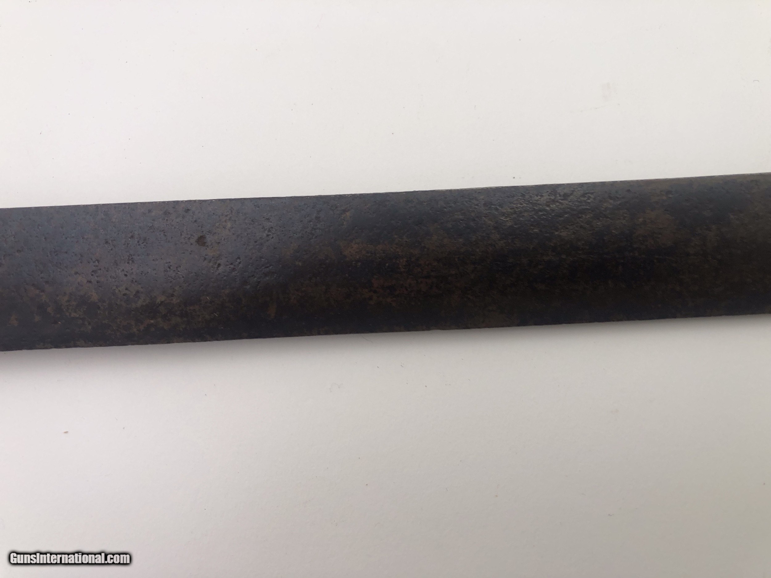 Description: This original Haiman sword has a guard and grip we have not seen on one of these swords. The brass has many flaws you would expect from a Confederate manufacture process. This is a mystery to us as it appears to have been together for a long time. Dimensions Overall in scabbard 44" Sword overall 39" Blade 33.5 " Scabbard 38.4" Condition-- Scabbard is longer than should be for this blade. Brass hilt and guard retain a good age patina. The blade is lightly pitted and is a very dark patina. The scabbard shows a dark patina with several dents. SOLD |