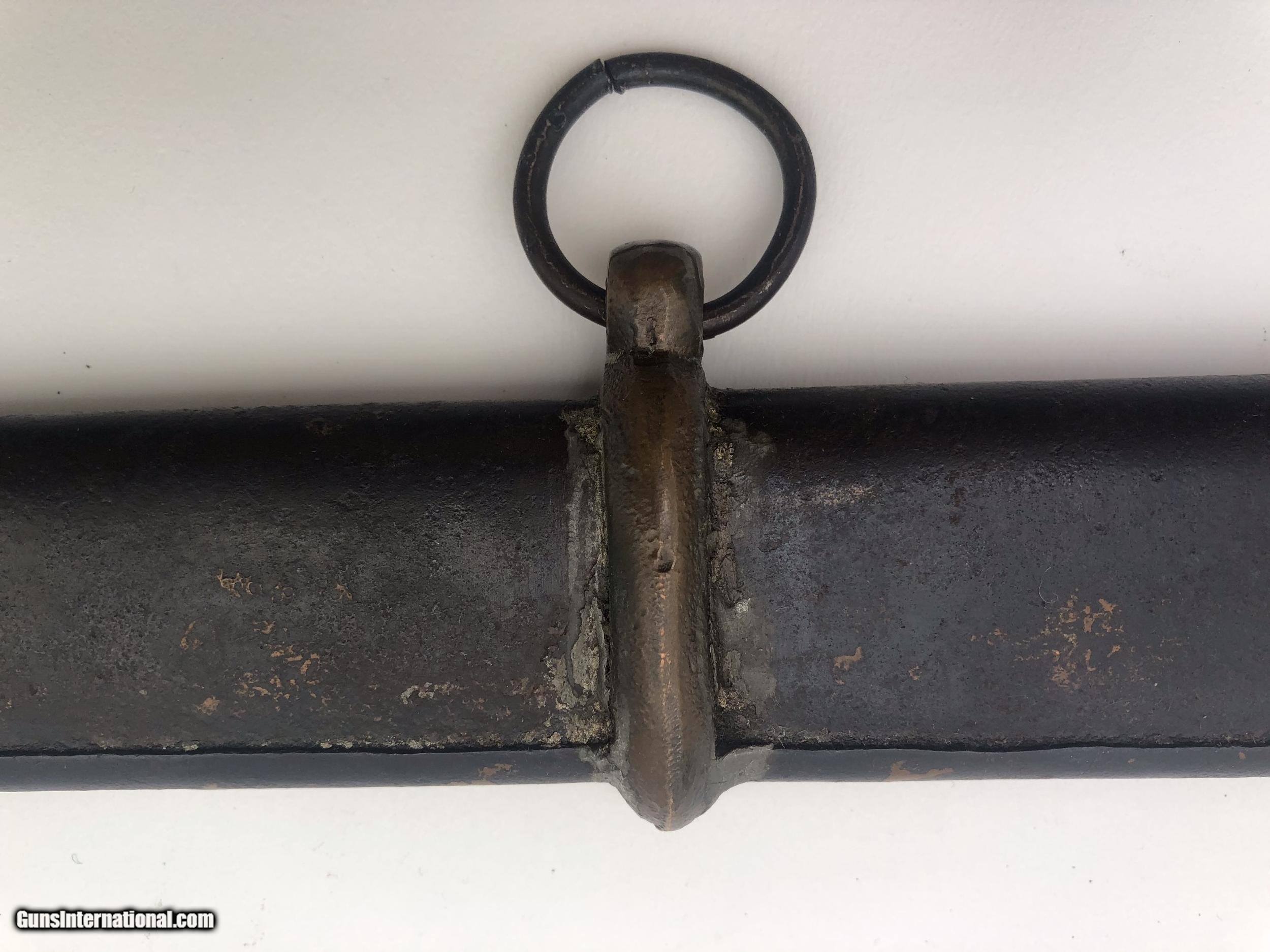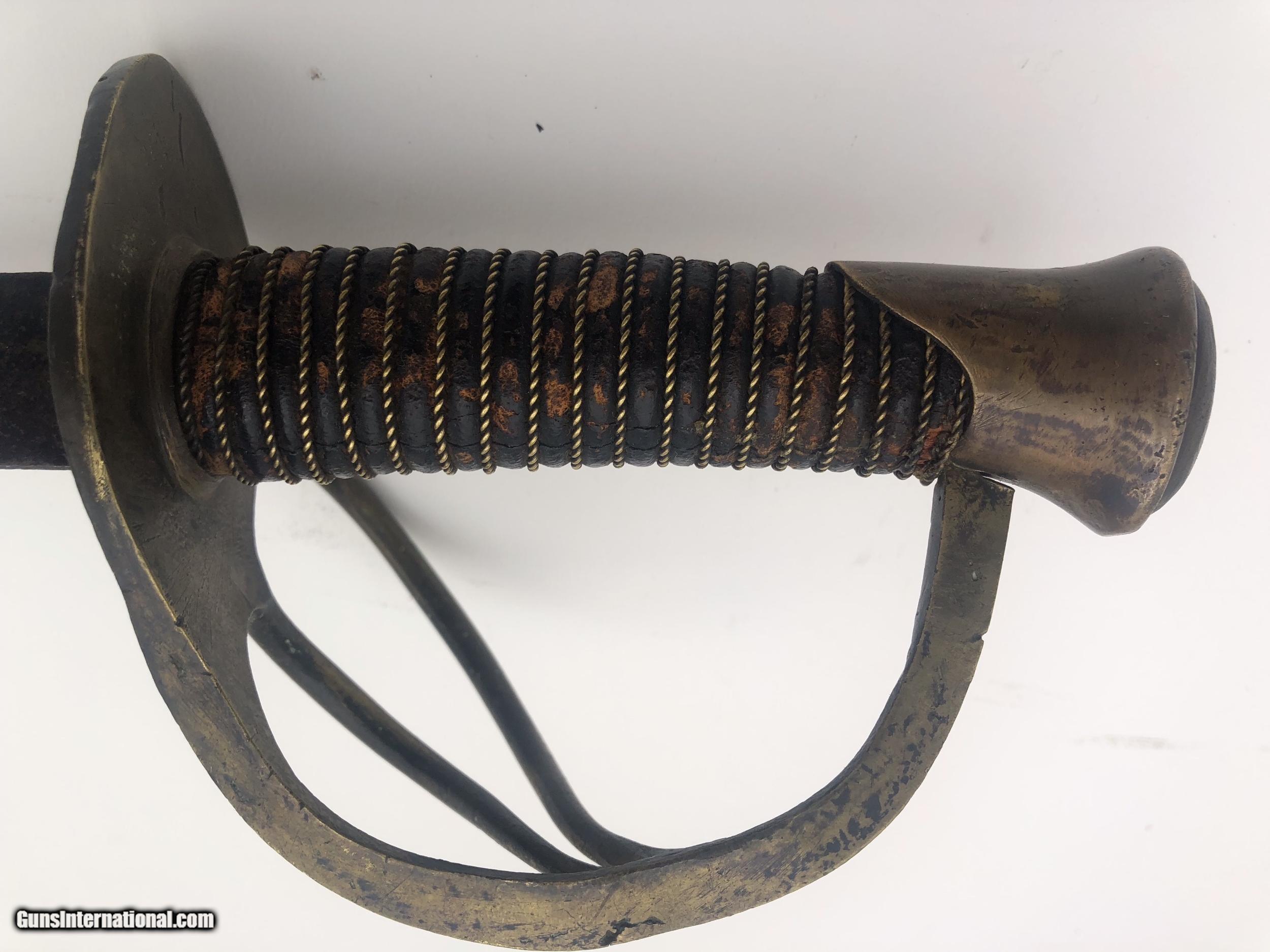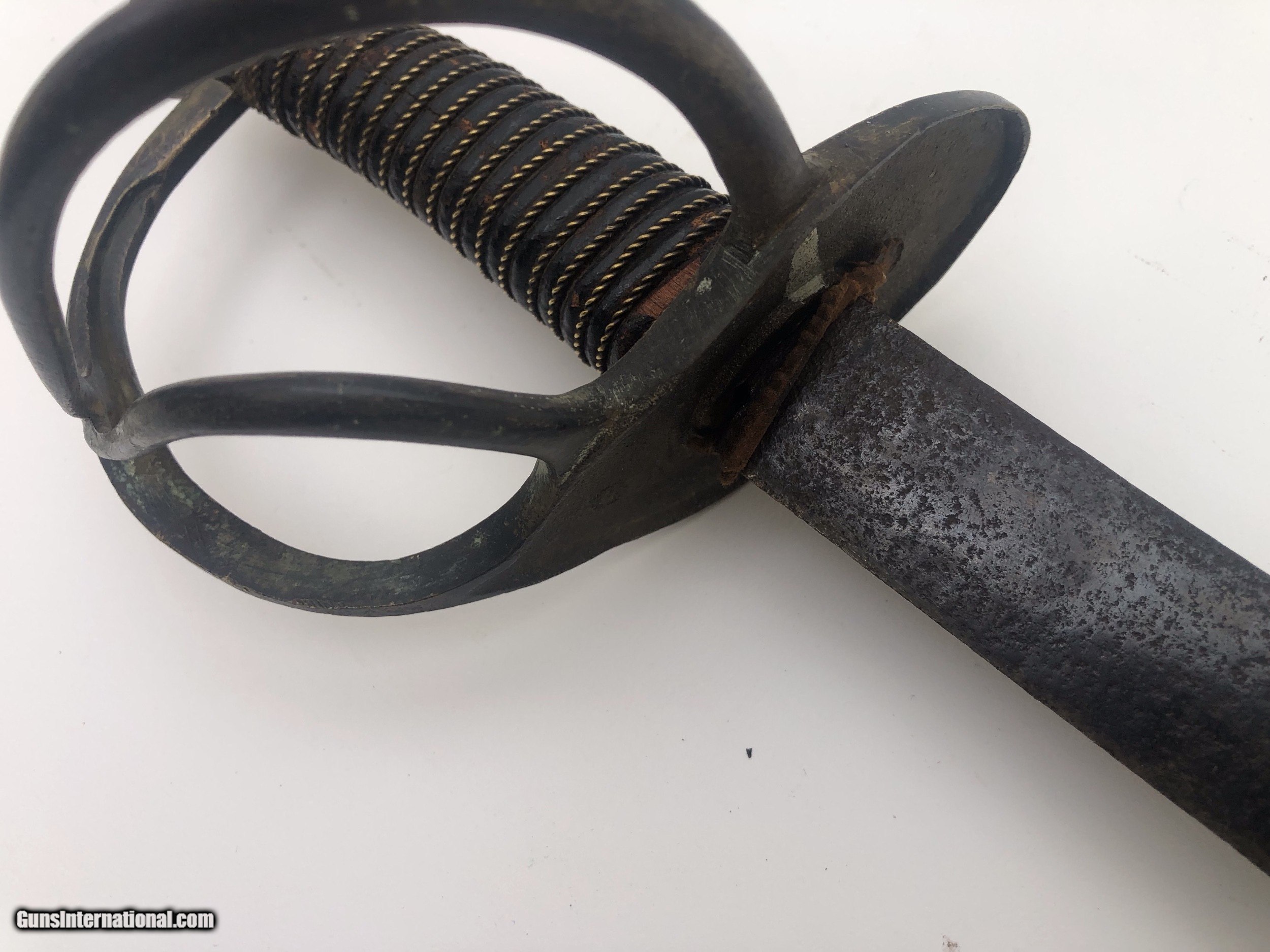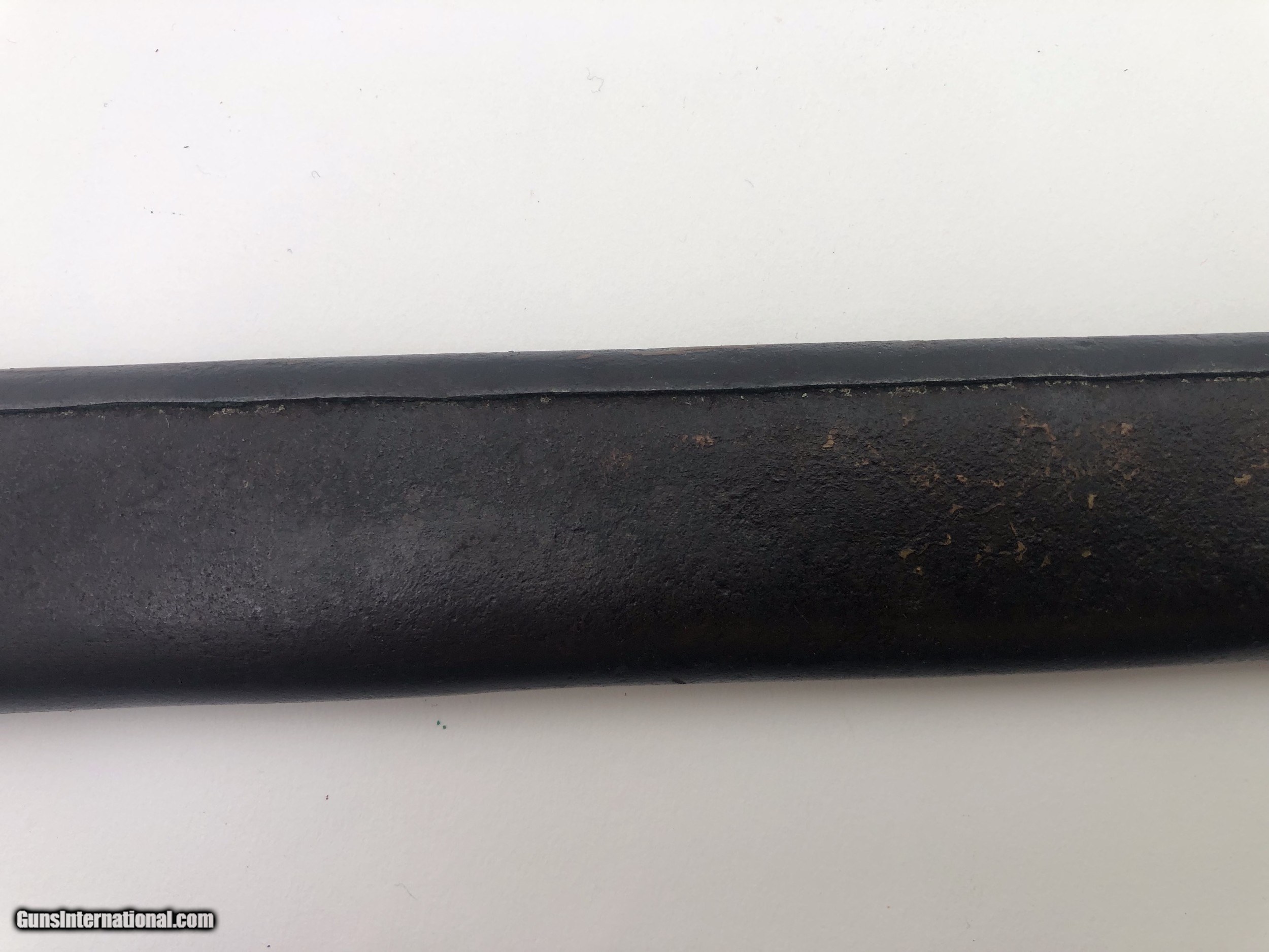 Description: This original Haiman sword has a guard and grip we have not seen on one of these swords. The brass has many flaws you would expect from a Confederate manufacture process. This is a mystery to us as it appears to have been together for a long time. Dimensions Overall in scabbard 44" Sword overall 39" Blade 33.5 " Scabbard 38.4" Condition-- Scabbard is longer than should be for this blade. Brass hilt and guard retain a good age patina. The blade is lightly pitted and is a very dark patina. The scabbard shows a dark patina with several dents. SOLD |