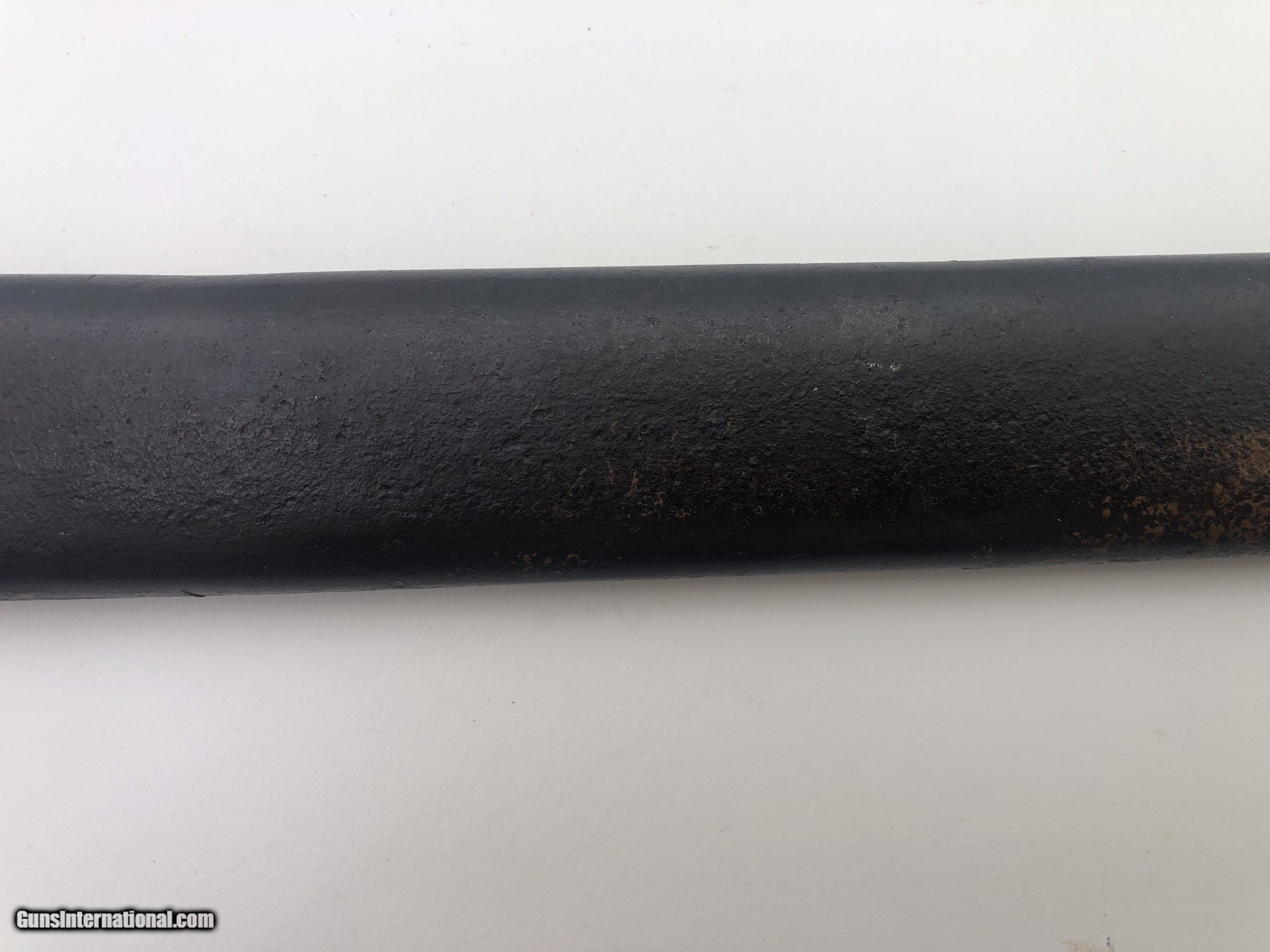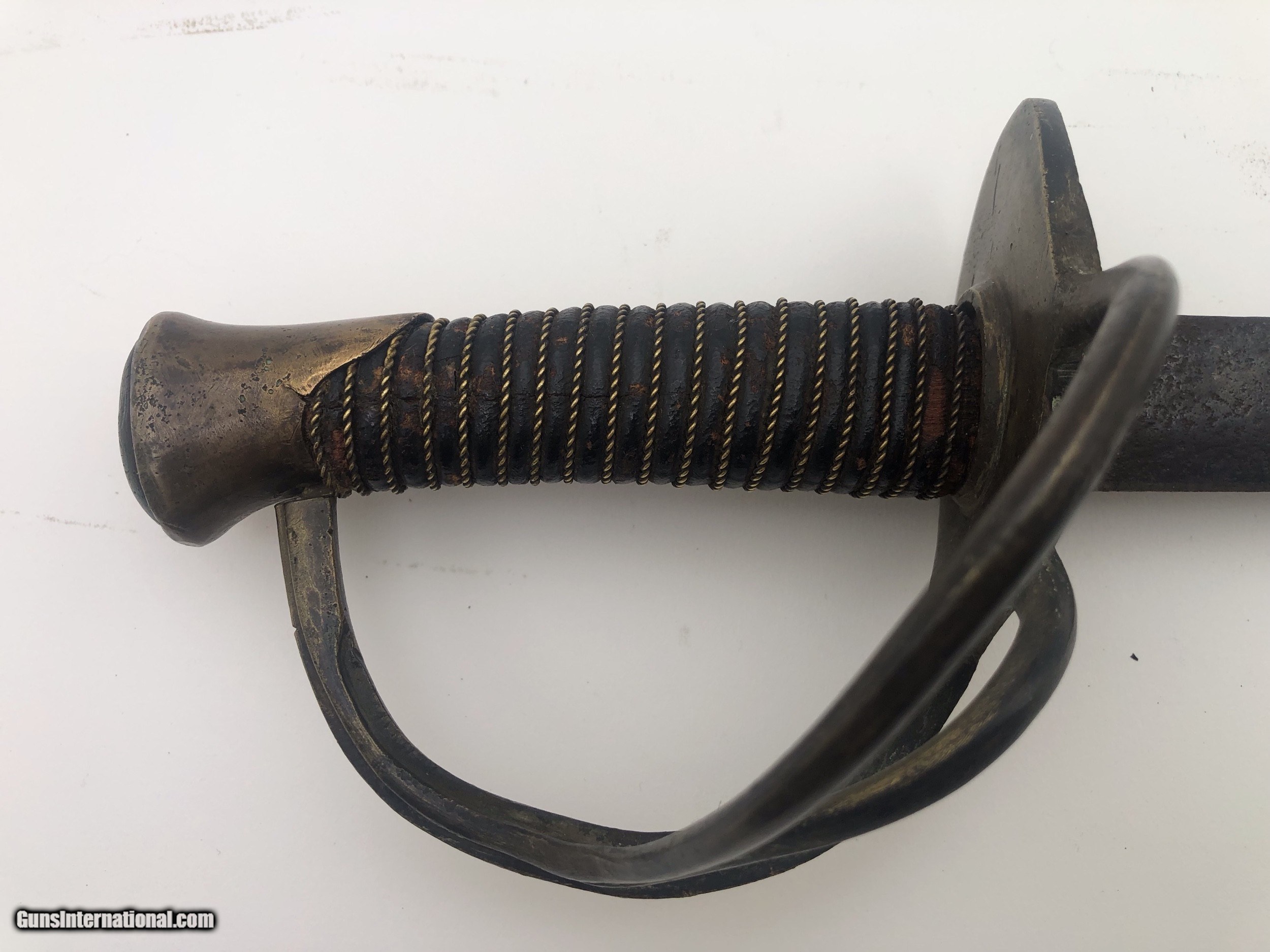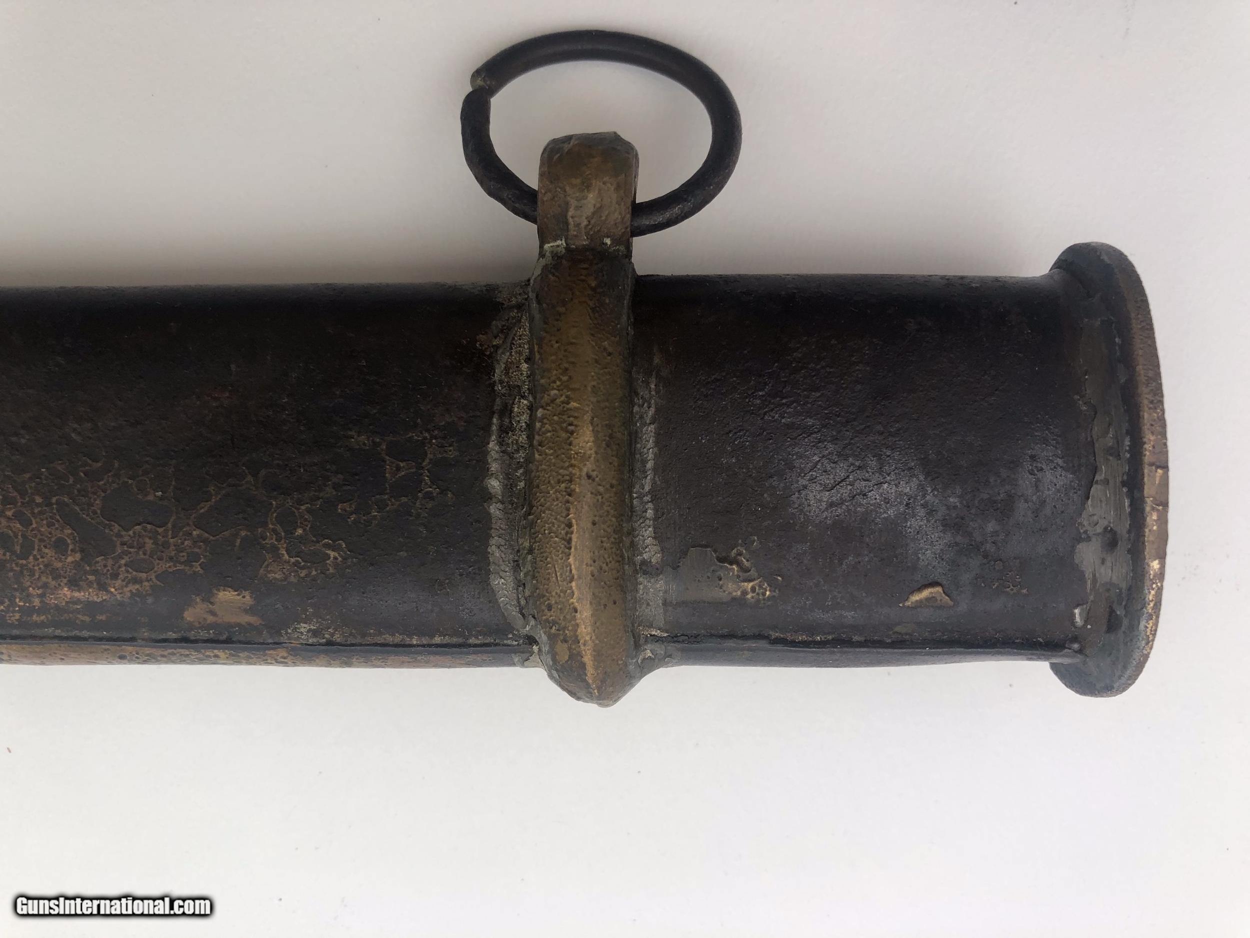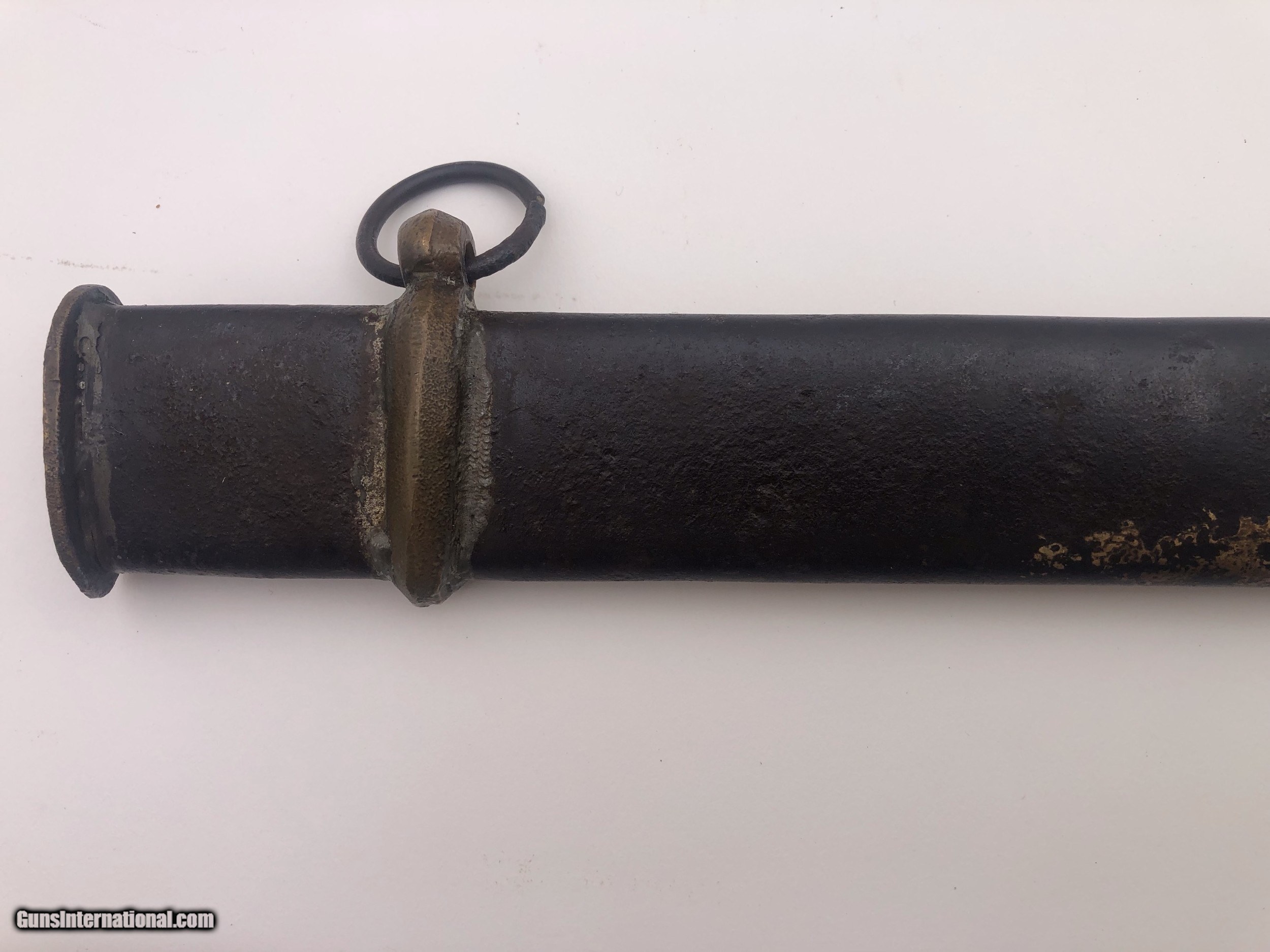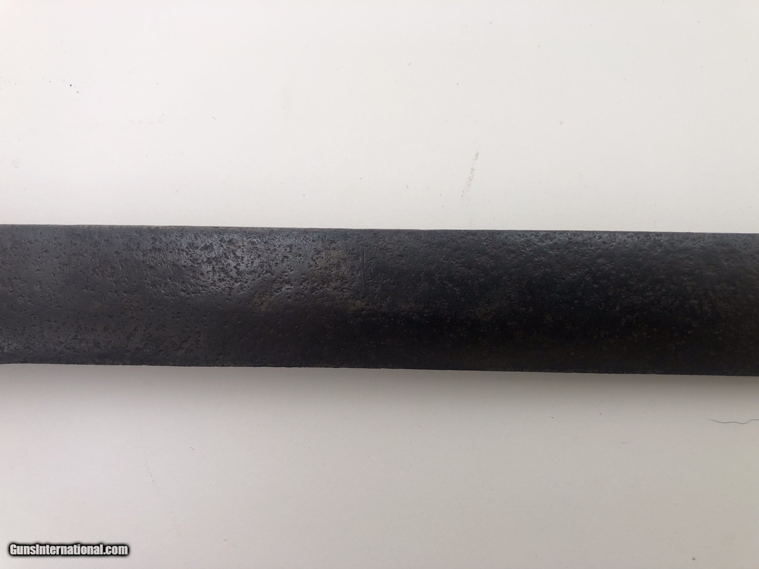 Description: This original Haiman sword has a guard and grip we have not seen on one of these swords. The brass has many flaws you would expect from a Confederate manufacture process. This is a mystery to us as it appears to have been together for a long time. Dimensions Overall in scabbard 44" Sword overall 39" Blade 33.5 " Scabbard 38.4" Condition-- Scabbard is longer than should be for this blade. Brass hilt and guard retain a good age patina. The blade is lightly pitted and is a very dark patina. The scabbard shows a dark patina with several dents. SOLD |