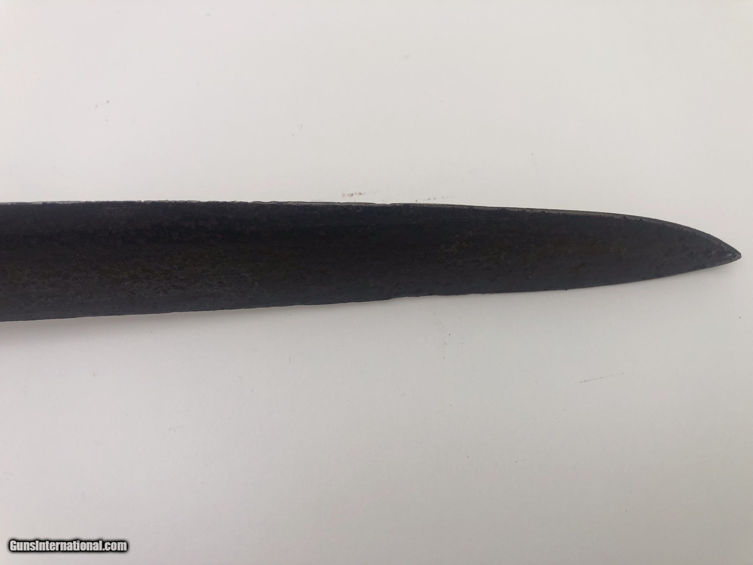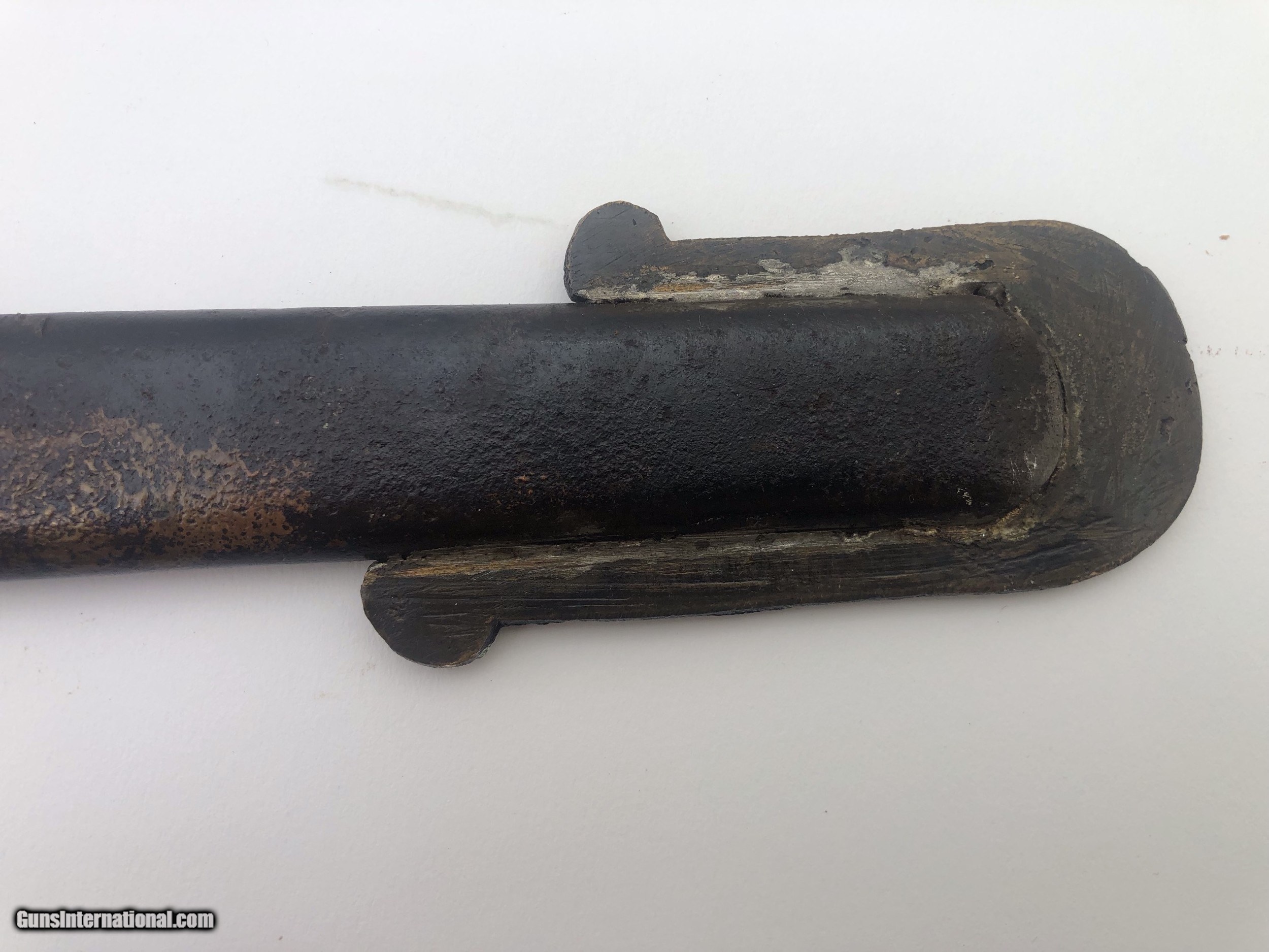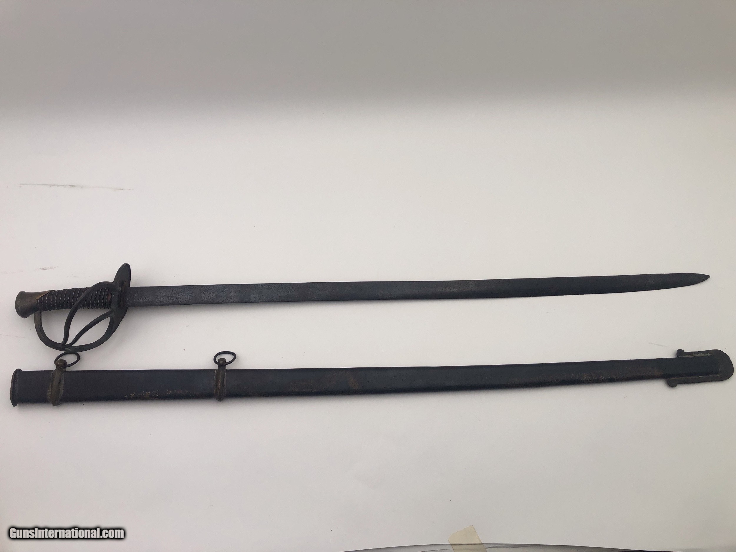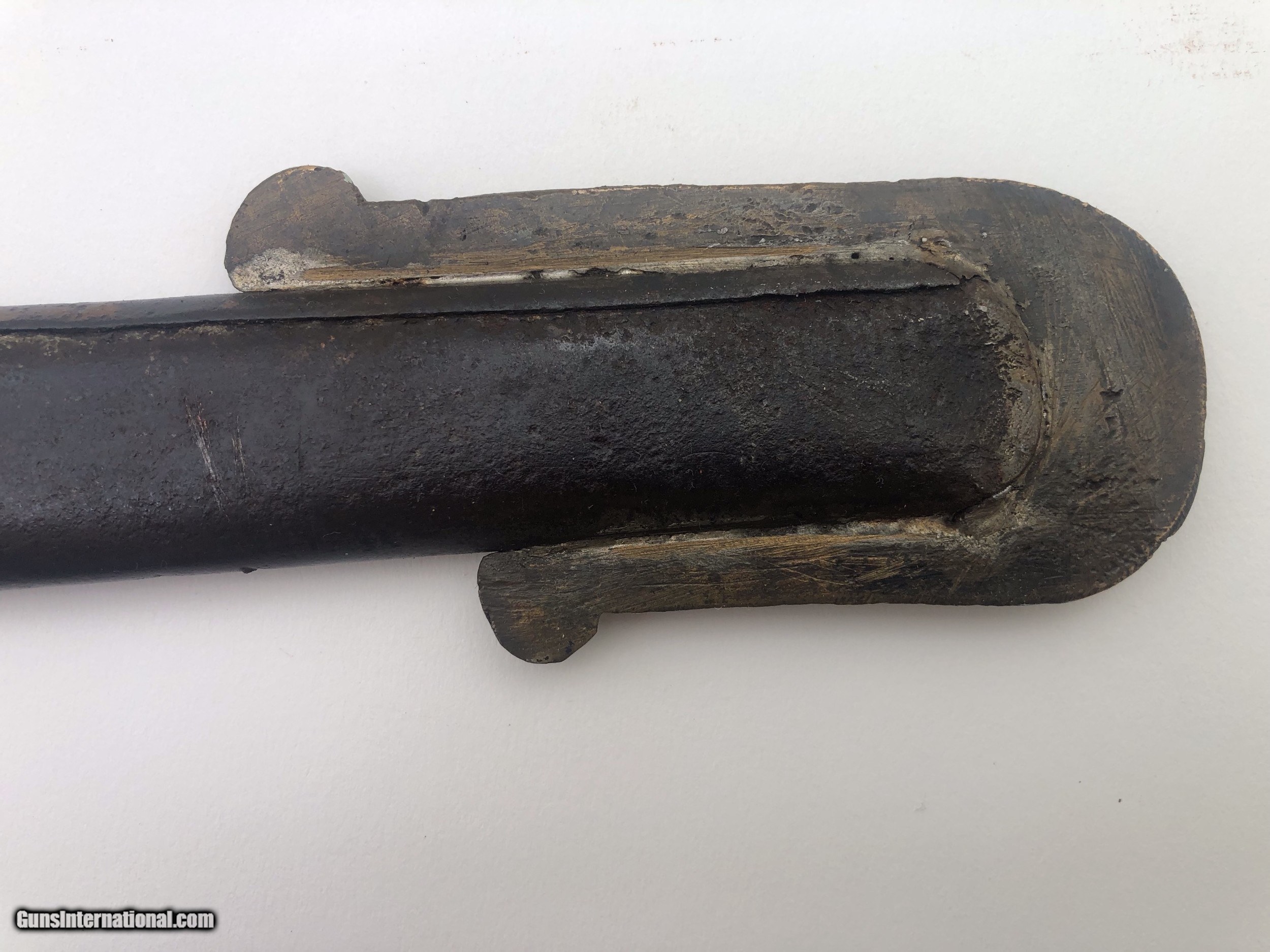 Description: This original Haiman sword has a guard and grip we have not seen on one of these swords. The brass has many flaws you would expect from a Confederate manufacture process. This is a mystery to us as it appears to have been together for a long time. Dimensions Overall in scabbard 44" Sword overall 39" Blade 33.5 " Scabbard 38.4" Condition-- Scabbard is longer than should be for this blade. Brass hilt and guard retain a good age patina. The blade is lightly pitted and is a very dark patina. The scabbard shows a dark patina with several dents. SOLD |