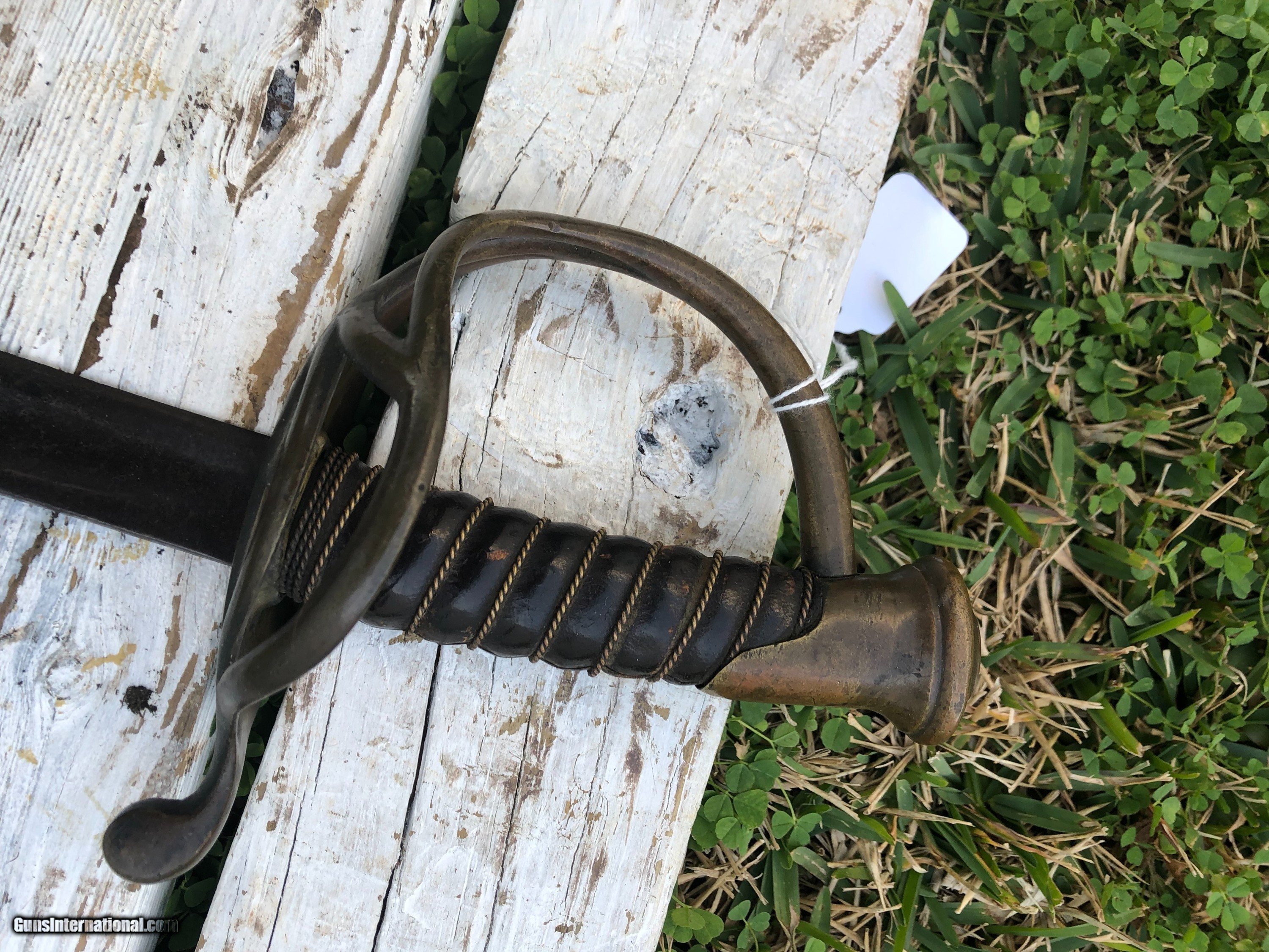 Description: Thuis is a scarce Texas made confederate sword. Original leather grip with minor repair to wire wrap on backside. Leather is really nice looking. The blade has a lot of nicks on the cutting edge most all about 1/16" and will ground out without taking the blade down much. Otherwise the blade is dark with a few spots of pitting. SOLD |