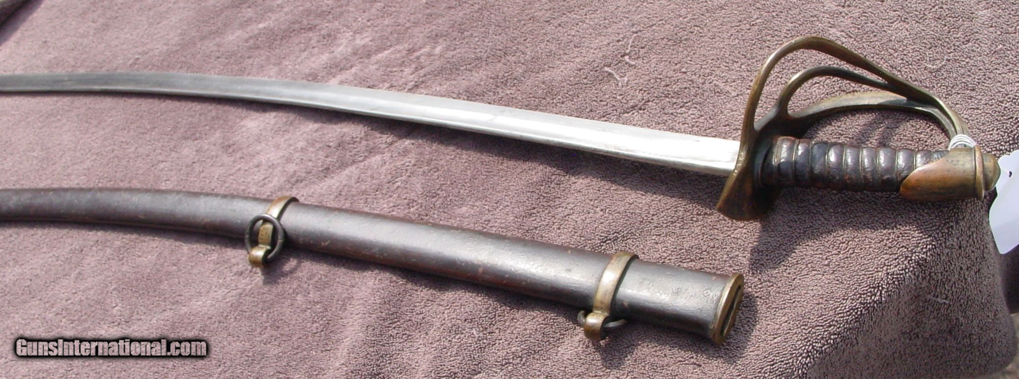 Description: KENANSVILLE CAVALRY SABER, NEAR MINT: This unique Kenansville Confederate cavalry saber is a variation of Froelich's second pattern (Kenansville Second Model), but with a Boyle & Gamble Phygian style pommel cap. The saber and scabbard are both original with matching Roman numeral XXVII markings, and are in near mint condition. The original nick-free blade is bright and tight with great casting flaws. The hilt has great patina, which matches the scabbard mounts, and has 100% original leather and iron wire. The guard has a little wiggle movement. The scabbard is dent free and retains much of its original lacquer finish. This is one of the finest examples! This is a museum grade piece. SOLD |