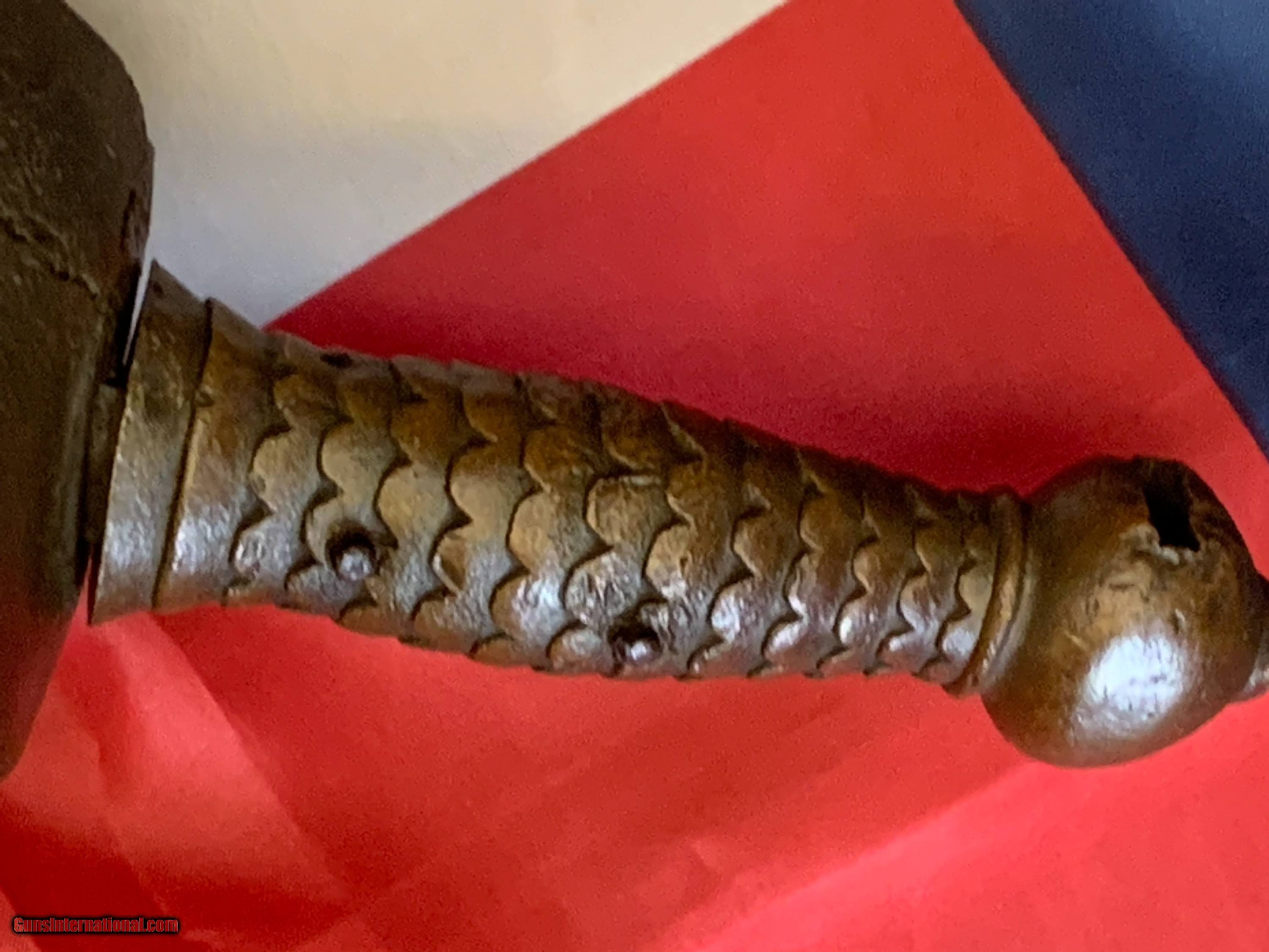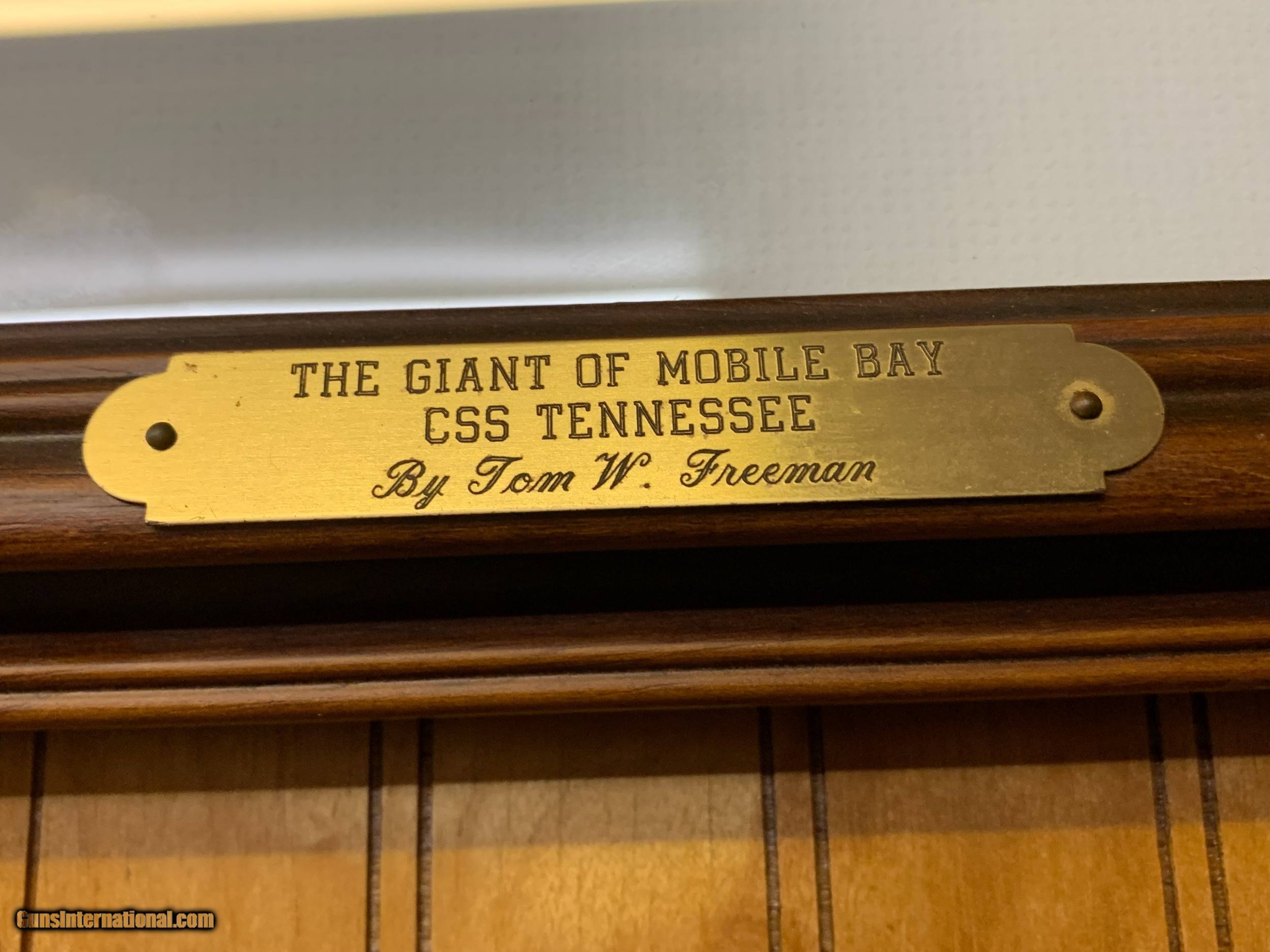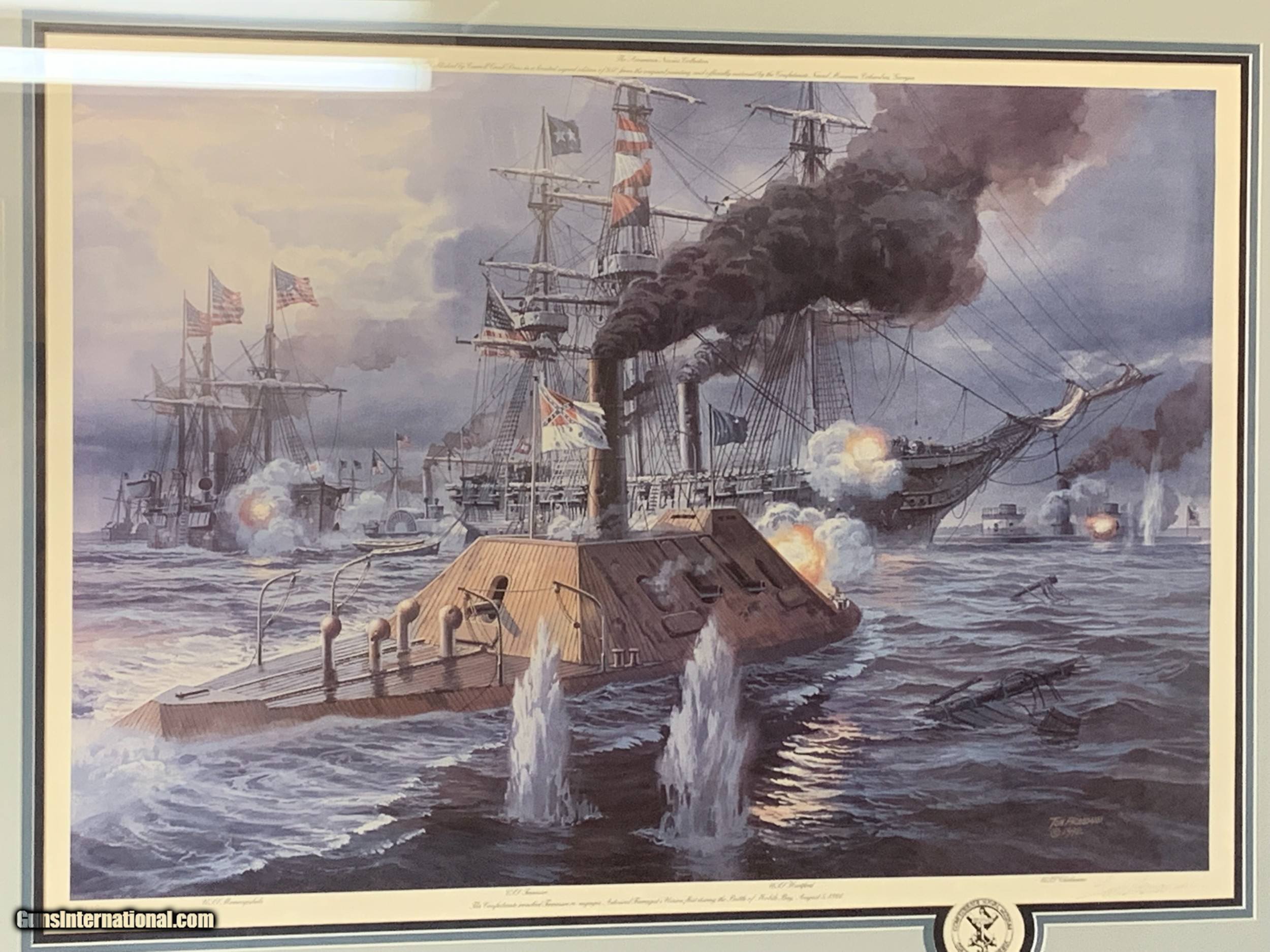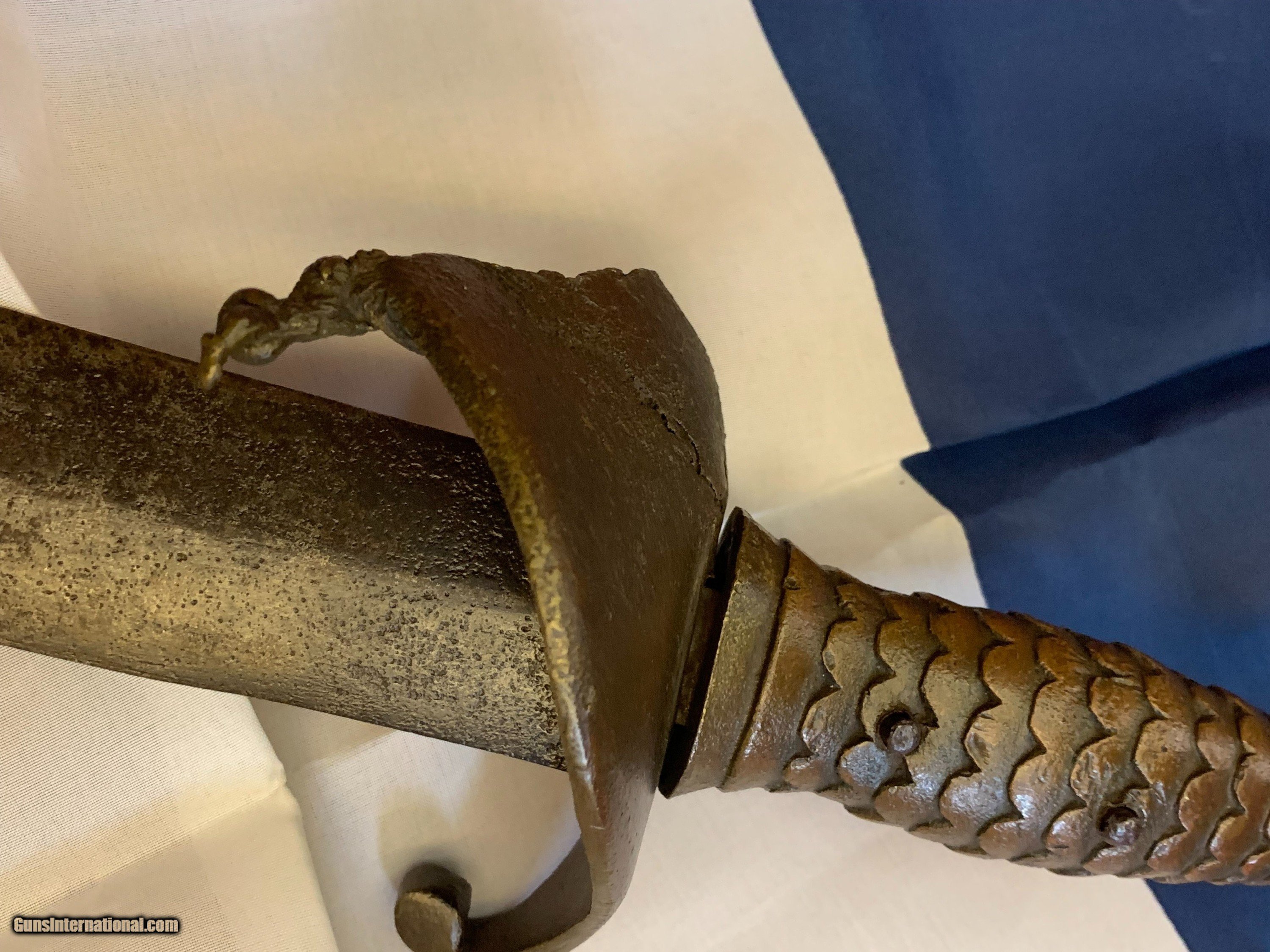 Description: CONFEDERATE NAVY BATTLE DAMAGED CUTLASS AND CSS TENNESSEE FRAMED PRINT FREE SHIPPING!!! This is an A. Dufilho (well known New Orleans swordmaker) Confederate Naval Cutlass and a large framed art print of the ironclad CSS Tennessee in battle at Mobile Bay by Tom Freeman. These are paired because the verbal provenance of the cutlass is that it was brought home to the Northeast after the Civil War by a Union sailor who had been on the USS Hartford at the Battle of Mobile Bay and captured the cutlass aboard CSS Tennessee after she was surrendered. In later years he moved to Mobile because he had been fond of the area. The cutlass turned up in modern times at a yard sale in Mobile. The story adds up because of the beating Tennessee took from the Federal fleet and the fact that the damage is undoubtedly very old. Confederate Naval Cutlasses didn't become valuable until relatively recently so there would have been no point to anyone damaging one to increase the value. The damage is very convincing! The bill of sale I received many years ago has "CSS Tennessee" written on it but that's all. It will be provided to the buyer. The cutlass is badly damaged showing the level of violence involved in ironclad Naval warfare during the Civil War; the guard is loose and cracked from impact, the counterguard has been torn off and at the point where it was torn from the guard there is melting from extreme heat (fire), there is a shrapnel crease/dent in the reverse side of the grip and the blade has a very slight bend to the left. The cutlass itself is still very presentable and has been one of the centerpieces of my Confederate Naval collection for almost 30 years. It is verified as having been made by Dufilho because these cutlasses made by Dufilho all have a distinctive curve ending in a notch on the reverse side of the guard. The one for sale here is not maker marked which is common on Confederate blades of all types. Very few of Dufilho's blades are marked but are normally identified by style matching the rare marked examples. It measures 26" overall with a blade length of 20-3/4" and width of 1-5/8". The brass all has a very even and attractive "chocolate" tone patina and exhibits the crude manufacturing that we all love to see in Confederate relics. the blade is dark with very old surface rust and light pitting overall. These cutlasses are often referred to as "Selma Arsenal" manufacture, I assume because examples were recovered along with other artifacts near the location of the arsenal. There is a ”Selma Arsenal type Confederate naval cutlass but they are different from the Dufilho’s. This also contributes to the provenance of the cutlass for sale here since CSS Tennessee was built in Selma. Examples of these cutlasses marked or not are extremely rare! I have included three photos of a non-damaged Dufilho cutlass for reference (the ones of the cutlass on a navy blue backdrop). The art print of CSS Tennessee included in this sale is titled "The Giant of Mobile Bay". There are numerous notations printed on it identifying the vessels depicted, date of the battle, etc. It also has the seal of the Confederate Naval Museum (now Civil War Naval Museum). It is a limited edition print of 950, this one being numbered 178 of 950 and is signed by the artist. The overall dimensions of the frame are 28-1/2" tall by 37" wide. The actual image size is 19-1/4" X 27". These two items make an impressive display together! I will also include the two black walnut display wall mounts I have used for this cutlass for many years. THIS RARE, HISTORIC CONFEDERATE CUTLASS AND ART PRINT ARE BEING OFFERED FOR AROUND THE MARKET PRICE OF AN AVERAGE, RUN-OF-THE-MILL CONFEDERATE MANUFACTURED NAVAL CUTLASS!! I am liquidating my extensive collection of Civil War relics after 30 years collecting in preparation for retirement. Look for more exciting and rare Civil War items from my collection. PLEASE NOTE: THIS CUTLASS IS ALSO AVAILABLE FOR $1699 WITHOUT THE ART PRINT IF YOU PREFER, JUST EMAIL ME AND I CAN CHANGE THE LISTING. ALL SALES FINAL! RETURNS NOT ACCEPTED!! PERSONAL CHECKS WILL NEED TO CLEAR MY BANK ACCOUNT PRIOR TO SHIPMENT. PAYMENT DUE WITHIN 5 DAYS OF PURCHASE. NO INTERNATIONAL SALES OR SHIPMENTS. SOLD |