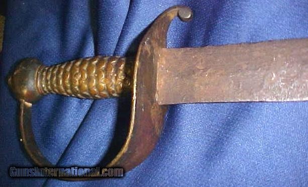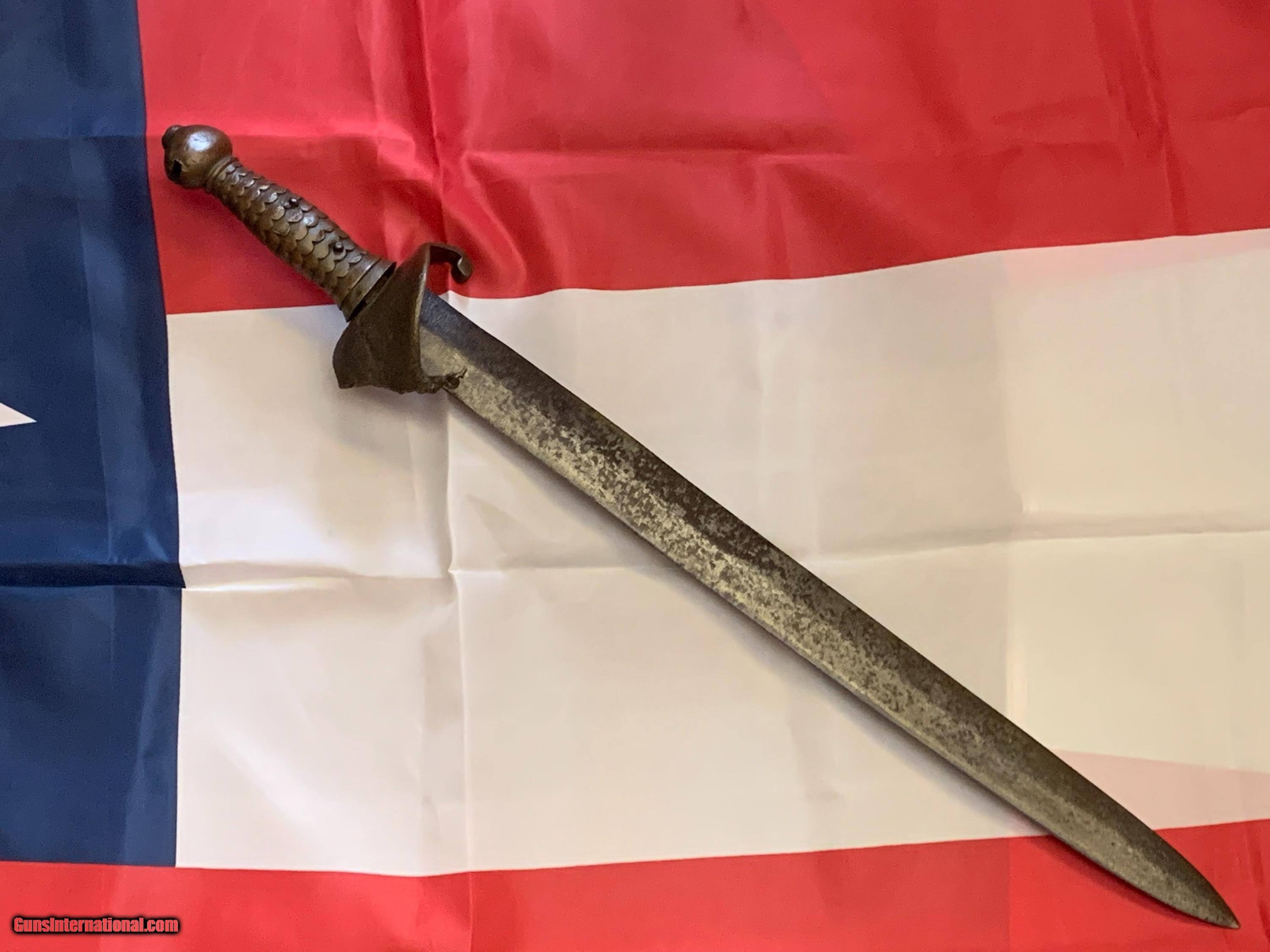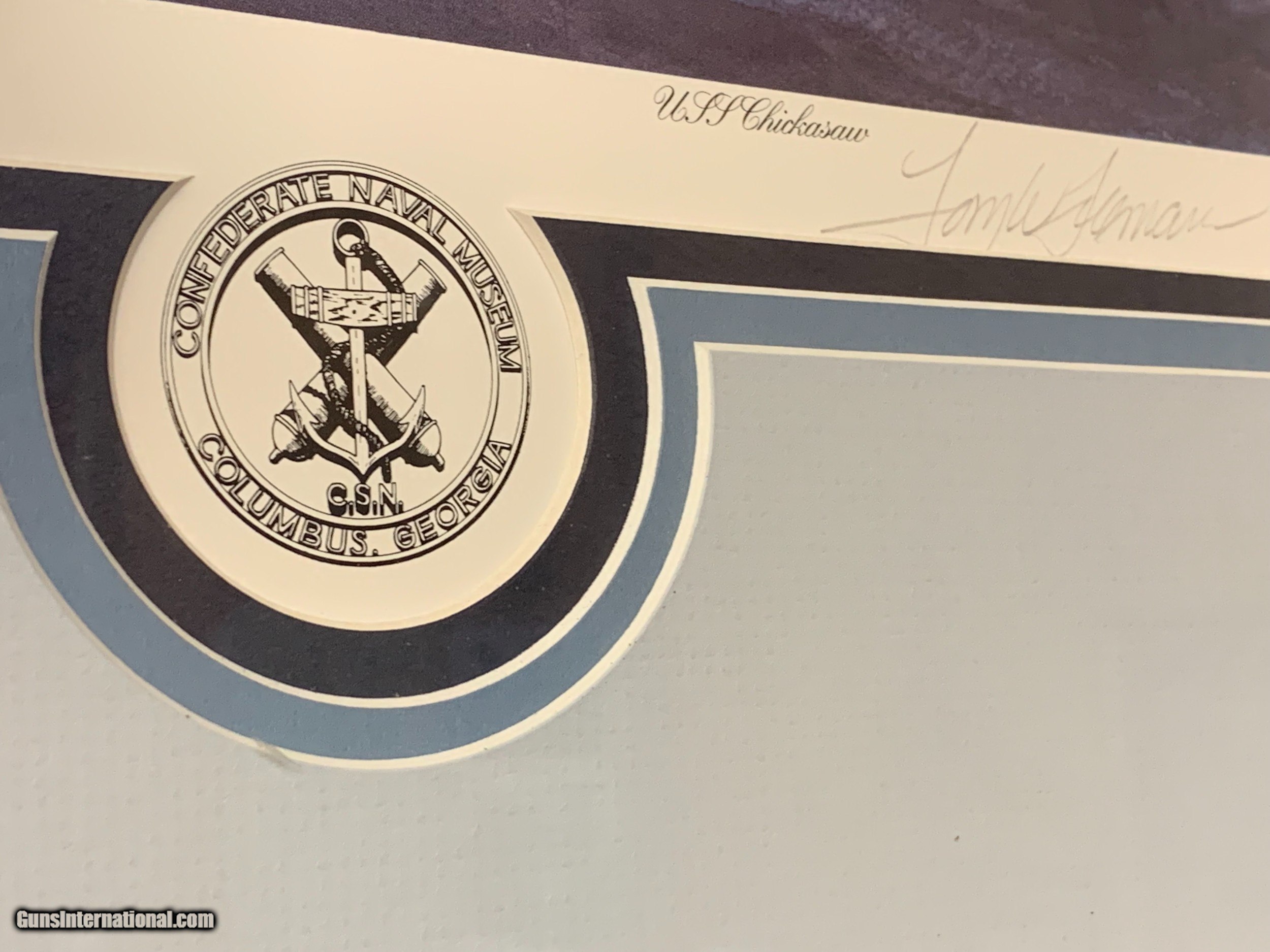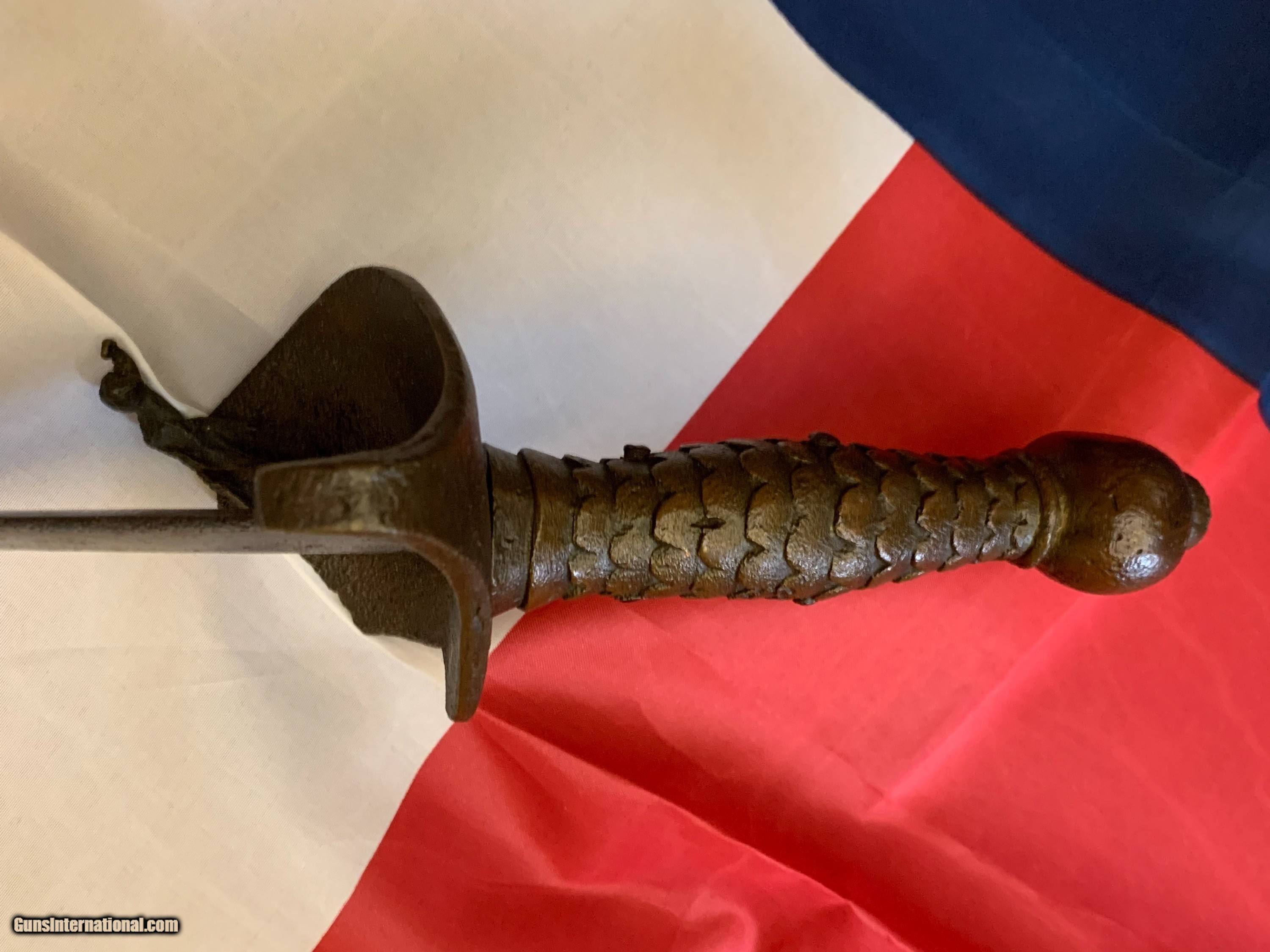 Description: CONFEDERATE NAVY BATTLE DAMAGED CUTLASS AND CSS TENNESSEE FRAMED PRINT FREE SHIPPING!!! This is an A. Dufilho (well known New Orleans swordmaker) Confederate Naval Cutlass and a large framed art print of the ironclad CSS Tennessee in battle at Mobile Bay by Tom Freeman. These are paired because the verbal provenance of the cutlass is that it was brought home to the Northeast after the Civil War by a Union sailor who had been on the USS Hartford at the Battle of Mobile Bay and captured the cutlass aboard CSS Tennessee after she was surrendered. In later years he moved to Mobile because he had been fond of the area. The cutlass turned up in modern times at a yard sale in Mobile. The story adds up because of the beating Tennessee took from the Federal fleet and the fact that the damage is undoubtedly very old. Confederate Naval Cutlasses didn't become valuable until relatively recently so there would have been no point to anyone damaging one to increase the value. The damage is very convincing! The bill of sale I received many years ago has "CSS Tennessee" written on it but that's all. It will be provided to the buyer. The cutlass is badly damaged showing the level of violence involved in ironclad Naval warfare during the Civil War; the guard is loose and cracked from impact, the counterguard has been torn off and at the point where it was torn from the guard there is melting from extreme heat (fire), there is a shrapnel crease/dent in the reverse side of the grip and the blade has a very slight bend to the left. The cutlass itself is still very presentable and has been one of the centerpieces of my Confederate Naval collection for almost 30 years. It is verified as having been made by Dufilho because these cutlasses made by Dufilho all have a distinctive curve ending in a notch on the reverse side of the guard. The one for sale here is not maker marked which is common on Confederate blades of all types. Very few of Dufilho's blades are marked but are normally identified by style matching the rare marked examples. It measures 26" overall with a blade length of 20-3/4" and width of 1-5/8". The brass all has a very even and attractive "chocolate" tone patina and exhibits the crude manufacturing that we all love to see in Confederate relics. the blade is dark with very old surface rust and light pitting overall. These cutlasses are often referred to as "Selma Arsenal" manufacture, I assume because examples were recovered along with other artifacts near the location of the arsenal. There is a ”Selma Arsenal type Confederate naval cutlass but they are different from the Dufilho’s. This also contributes to the provenance of the cutlass for sale here since CSS Tennessee was built in Selma. Examples of these cutlasses marked or not are extremely rare! I have included three photos of a non-damaged Dufilho cutlass for reference (the ones of the cutlass on a navy blue backdrop). The art print of CSS Tennessee included in this sale is titled "The Giant of Mobile Bay". There are numerous notations printed on it identifying the vessels depicted, date of the battle, etc. It also has the seal of the Confederate Naval Museum (now Civil War Naval Museum). It is a limited edition print of 950, this one being numbered 178 of 950 and is signed by the artist. The overall dimensions of the frame are 28-1/2" tall by 37" wide. The actual image size is 19-1/4" X 27". These two items make an impressive display together! I will also include the two black walnut display wall mounts I have used for this cutlass for many years. THIS RARE, HISTORIC CONFEDERATE CUTLASS AND ART PRINT ARE BEING OFFERED FOR AROUND THE MARKET PRICE OF AN AVERAGE, RUN-OF-THE-MILL CONFEDERATE MANUFACTURED NAVAL CUTLASS!! I am liquidating my extensive collection of Civil War relics after 30 years collecting in preparation for retirement. Look for more exciting and rare Civil War items from my collection. PLEASE NOTE: THIS CUTLASS IS ALSO AVAILABLE FOR $1699 WITHOUT THE ART PRINT IF YOU PREFER, JUST EMAIL ME AND I CAN CHANGE THE LISTING. ALL SALES FINAL! RETURNS NOT ACCEPTED!! PERSONAL CHECKS WILL NEED TO CLEAR MY BANK ACCOUNT PRIOR TO SHIPMENT. PAYMENT DUE WITHIN 5 DAYS OF PURCHASE. NO INTERNATIONAL SALES OR SHIPMENTS. SOLD |