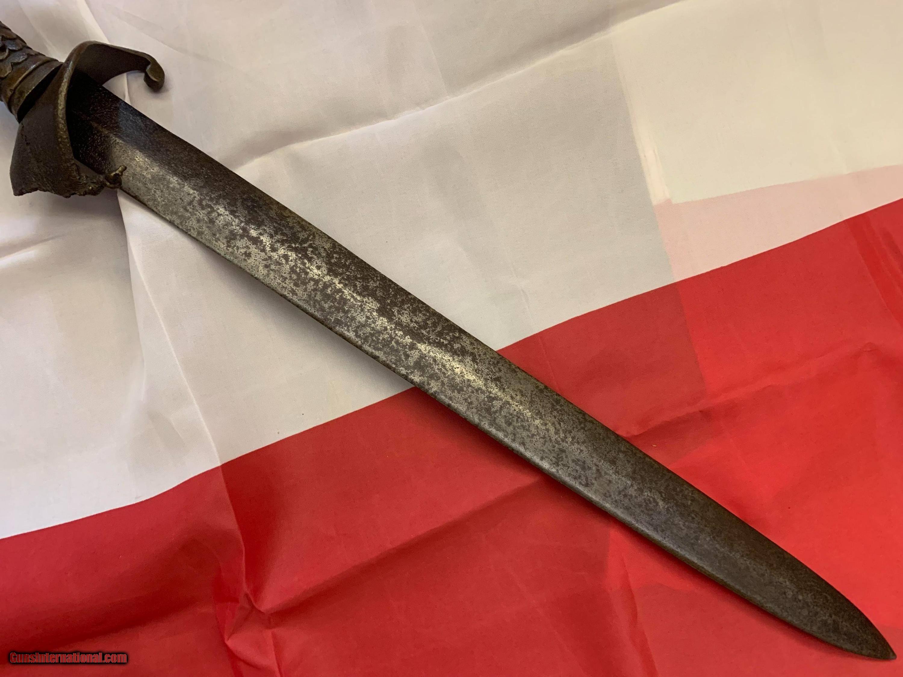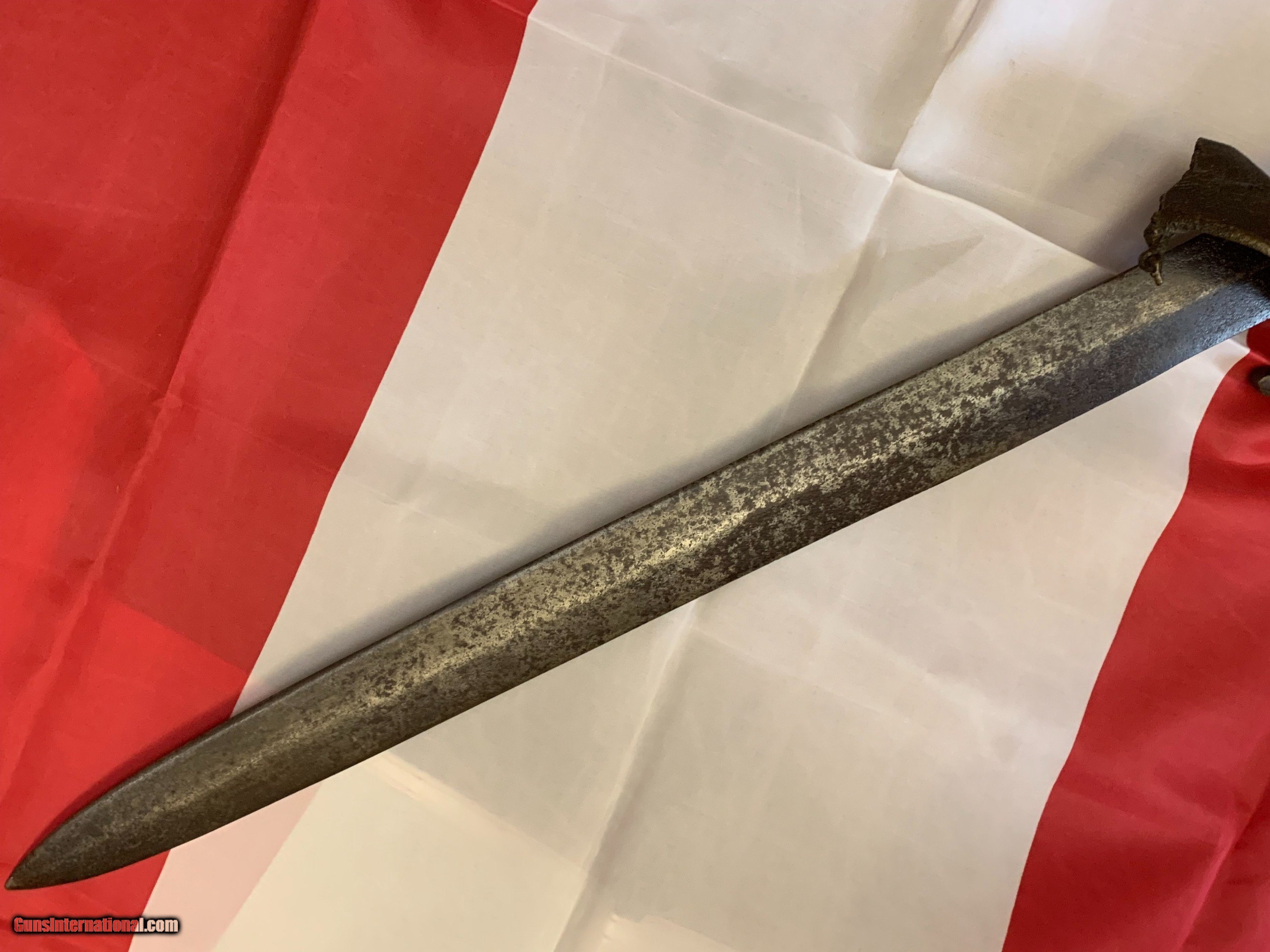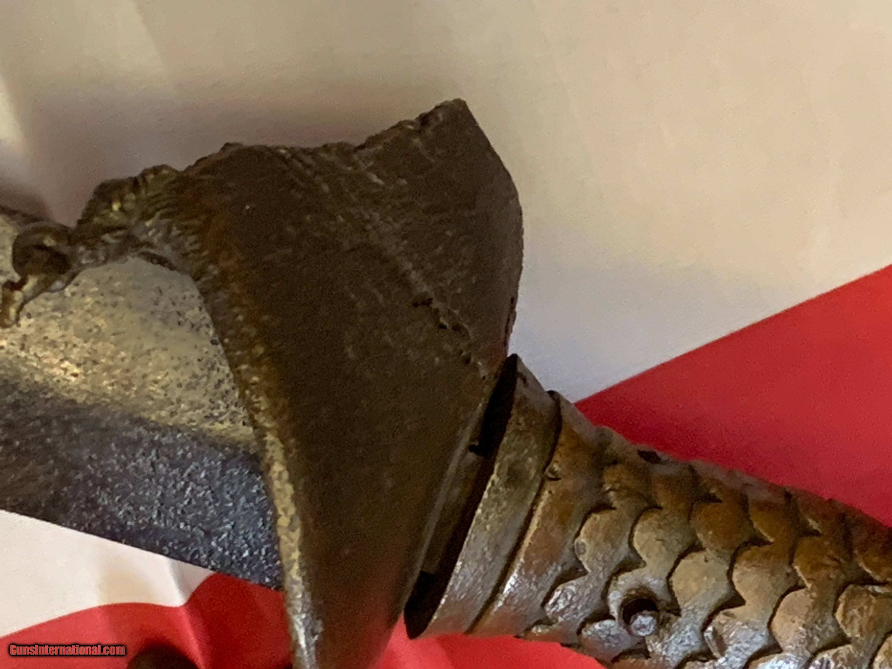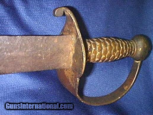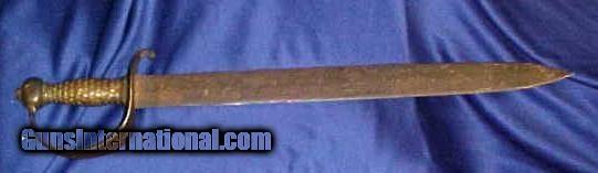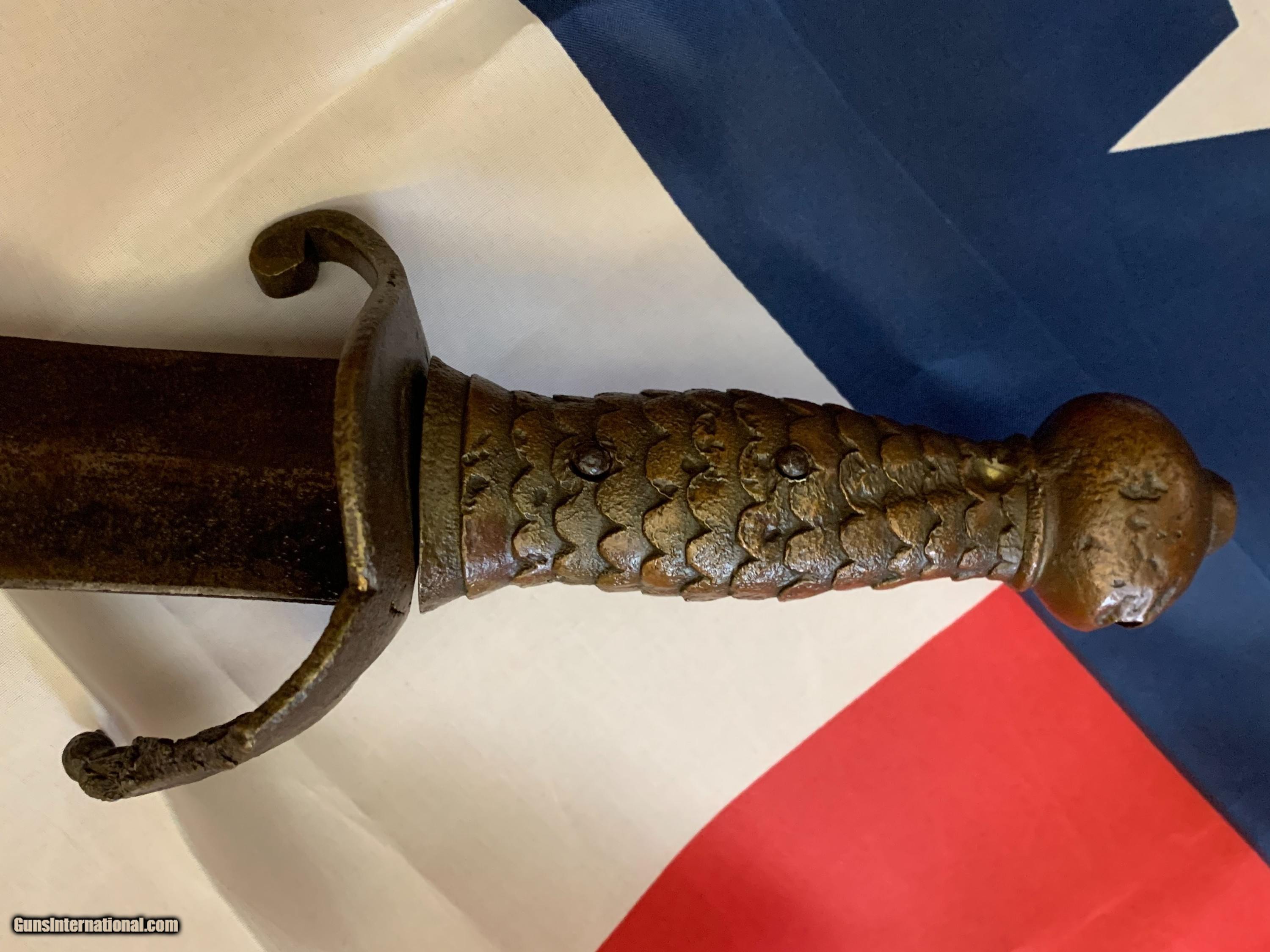 Description: CONFEDERATE NAVY BATTLE DAMAGED CUTLASS AND CSS TENNESSEE FRAMED PRINT FREE SHIPPING!!! This is an A. Dufilho (well known New Orleans swordmaker) Confederate Naval Cutlass and a large framed art print of the ironclad CSS Tennessee in battle at Mobile Bay by Tom Freeman. These are paired because the verbal provenance of the cutlass is that it was brought home to the Northeast after the Civil War by a Union sailor who had been on the USS Hartford at the Battle of Mobile Bay and captured the cutlass aboard CSS Tennessee after she was surrendered. In later years he moved to Mobile because he had been fond of the area. The cutlass turned up in modern times at a yard sale in Mobile. The story adds up because of the beating Tennessee took from the Federal fleet and the fact that the damage is undoubtedly very old. Confederate Naval Cutlasses didn't become valuable until relatively recently so there would have been no point to anyone damaging one to increase the value. The damage is very convincing! The bill of sale I received many years ago has "CSS Tennessee" written on it but that's all. It will be provided to the buyer. The cutlass is badly damaged showing the level of violence involved in ironclad Naval warfare during the Civil War; the guard is loose and cracked from impact, the counterguard has been torn off and at the point where it was torn from the guard there is melting from extreme heat (fire), there is a shrapnel crease/dent in the reverse side of the grip and the blade has a very slight bend to the left. The cutlass itself is still very presentable and has been one of the centerpieces of my Confederate Naval collection for almost 30 years. It is verified as having been made by Dufilho because these cutlasses made by Dufilho all have a distinctive curve ending in a notch on the reverse side of the guard. The one for sale here is not maker marked which is common on Confederate blades of all types. Very few of Dufilho's blades are marked but are normally identified by style matching the rare marked examples. It measures 26" overall with a blade length of 20-3/4" and width of 1-5/8". The brass all has a very even and attractive "chocolate" tone patina and exhibits the crude manufacturing that we all love to see in Confederate relics. the blade is dark with very old surface rust and light pitting overall. These cutlasses are often referred to as "Selma Arsenal" manufacture, I assume because examples were recovered along with other artifacts near the location of the arsenal. There is a ”Selma Arsenal type Confederate naval cutlass but they are different from the Dufilho’s. This also contributes to the provenance of the cutlass for sale here since CSS Tennessee was built in Selma. Examples of these cutlasses marked or not are extremely rare! I have included three photos of a non-damaged Dufilho cutlass for reference (the ones of the cutlass on a navy blue backdrop). The art print of CSS Tennessee included in this sale is titled "The Giant of Mobile Bay". There are numerous notations printed on it identifying the vessels depicted, date of the battle, etc. It also has the seal of the Confederate Naval Museum (now Civil War Naval Museum). It is a limited edition print of 950, this one being numbered 178 of 950 and is signed by the artist. The overall dimensions of the frame are 28-1/2" tall by 37" wide. The actual image size is 19-1/4" X 27". These two items make an impressive display together! I will also include the two black walnut display wall mounts I have used for this cutlass for many years. THIS RARE, HISTORIC CONFEDERATE CUTLASS AND ART PRINT ARE BEING OFFERED FOR AROUND THE MARKET PRICE OF AN AVERAGE, RUN-OF-THE-MILL CONFEDERATE MANUFACTURED NAVAL CUTLASS!! I am liquidating my extensive collection of Civil War relics after 30 years collecting in preparation for retirement. Look for more exciting and rare Civil War items from my collection. PLEASE NOTE: THIS CUTLASS IS ALSO AVAILABLE FOR $1699 WITHOUT THE ART PRINT IF YOU PREFER, JUST EMAIL ME AND I CAN CHANGE THE LISTING. ALL SALES FINAL! RETURNS NOT ACCEPTED!! PERSONAL CHECKS WILL NEED TO CLEAR MY BANK ACCOUNT PRIOR TO SHIPMENT. PAYMENT DUE WITHIN 5 DAYS OF PURCHASE. NO INTERNATIONAL SALES OR SHIPMENTS. SOLD |