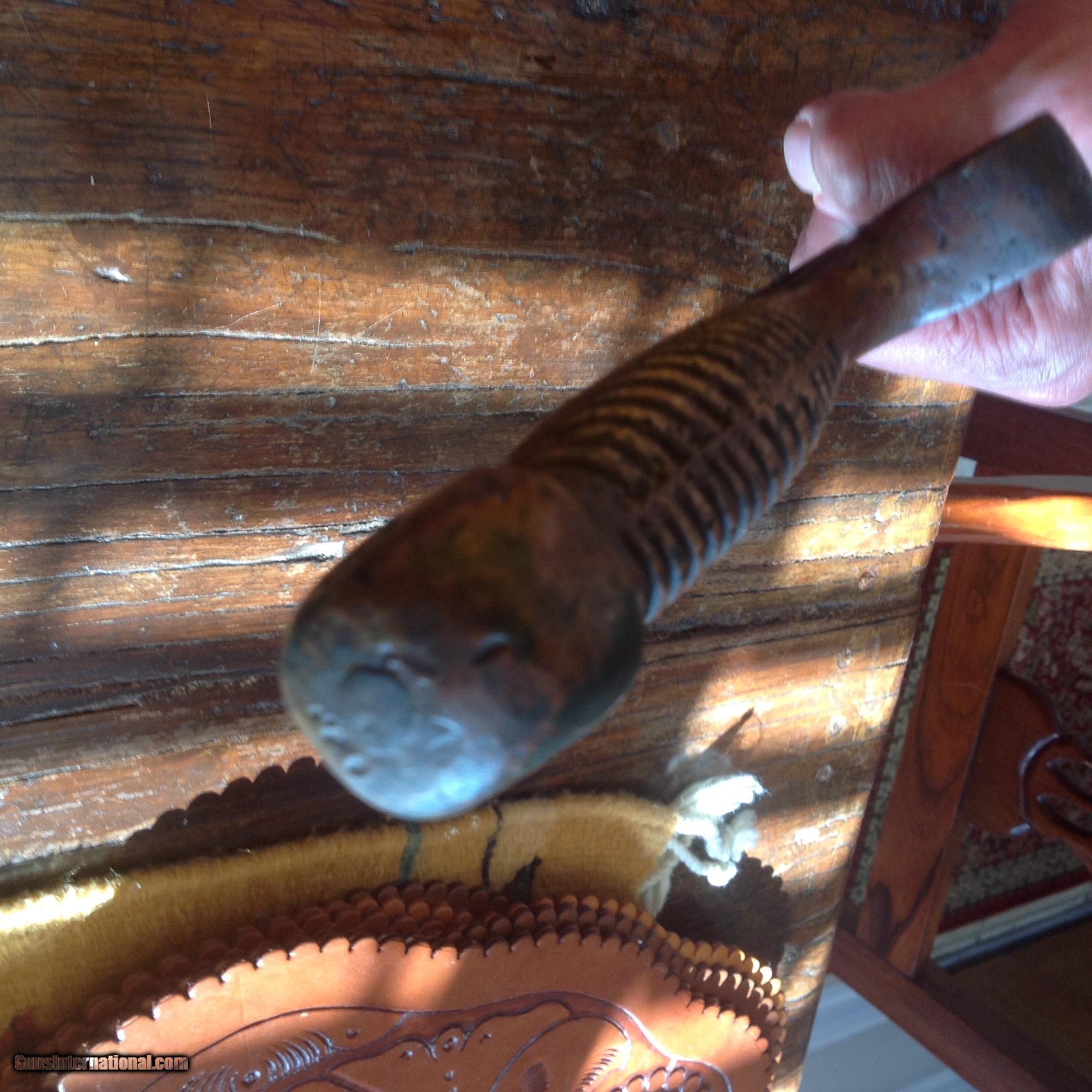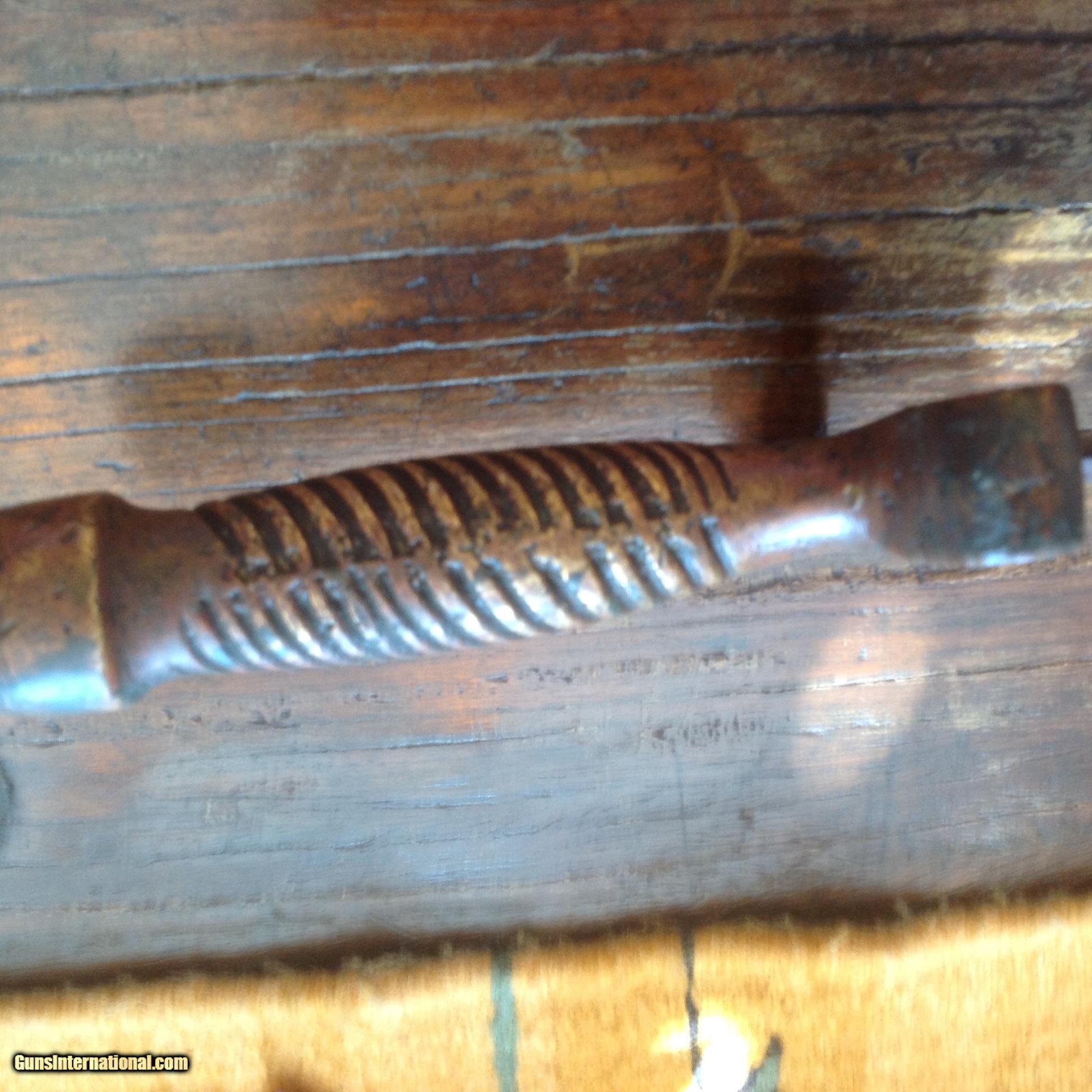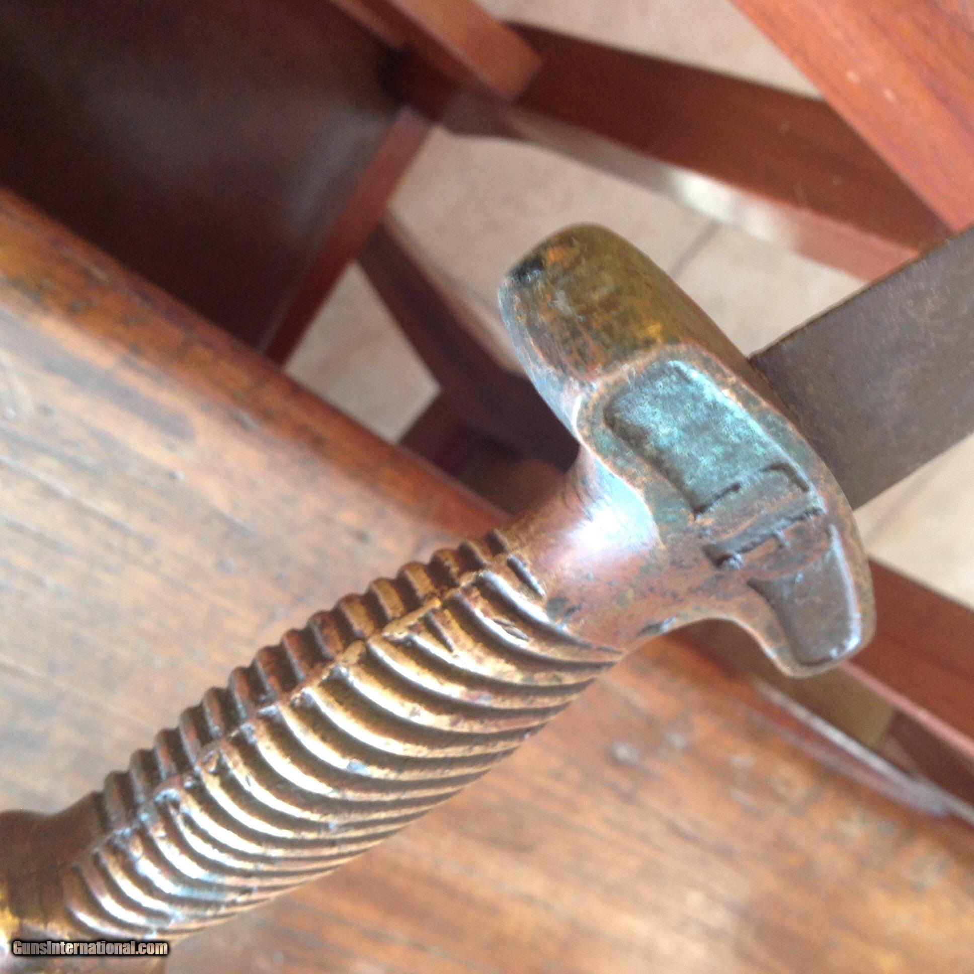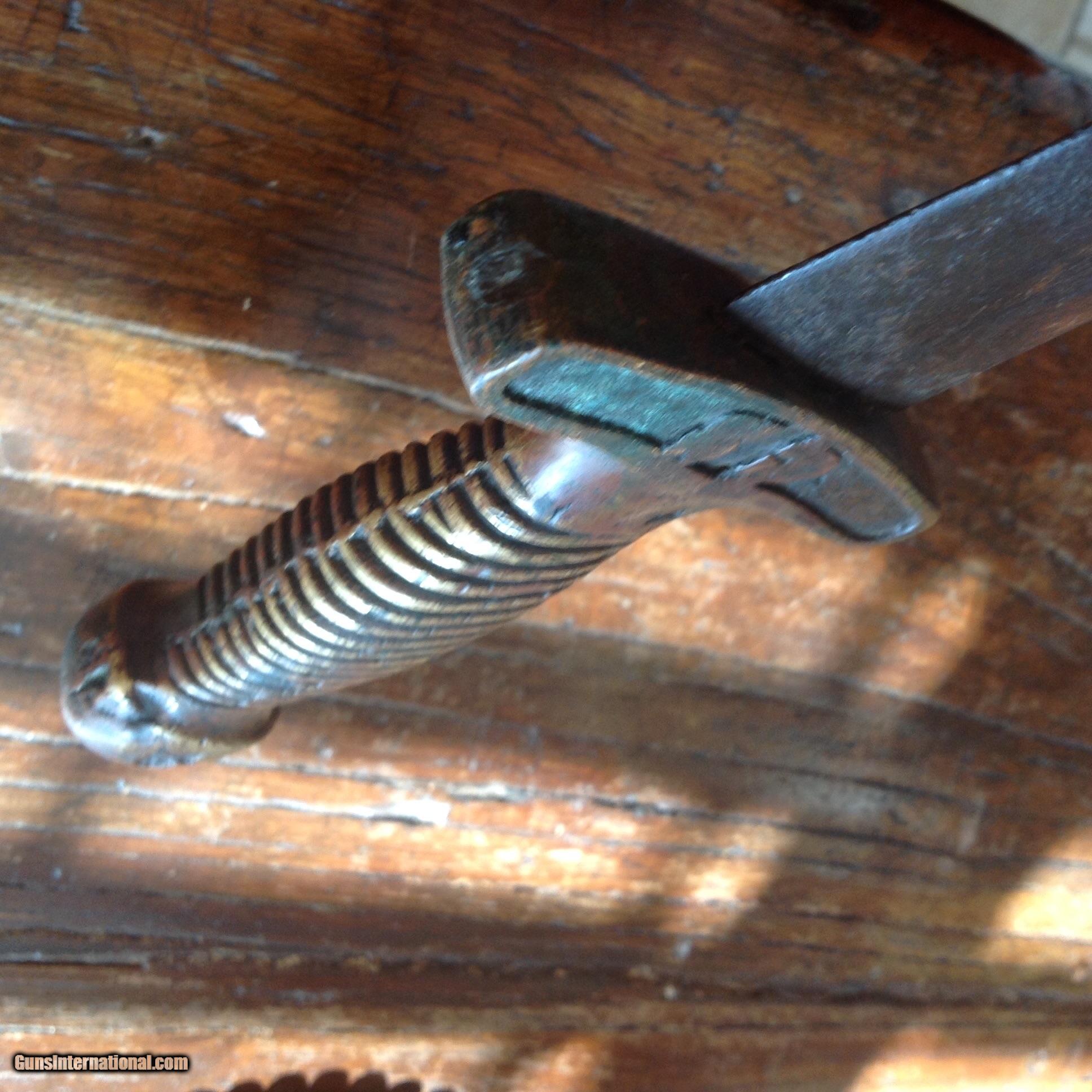 Description: SOLD!!! Priced to sell! Very nice Confederate Star with CS in pommel short artillery sword. Total length just over 24 inches. Blade is just at 19 inches. Unstopped fuller measures at approximately 12 inches. Crude sand casted handle. High copper content color in grip. Blade has dark patina with some pitting. I have owned four of these swords now. This is an authentic real deal CS with Star in Pommel Short Sword for a great price! Most of the big time CW Dealers would charge $2500 to $3000 for this sword. More pictures available upon request. SOLD |