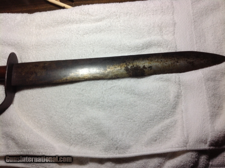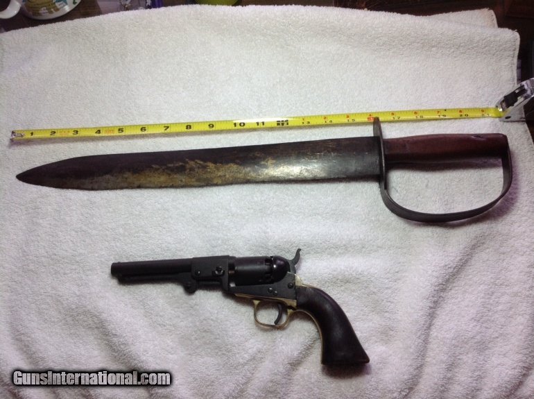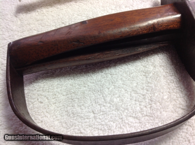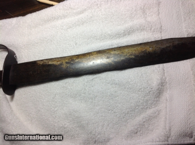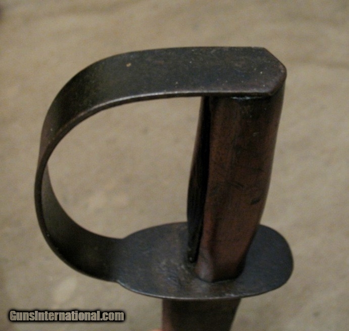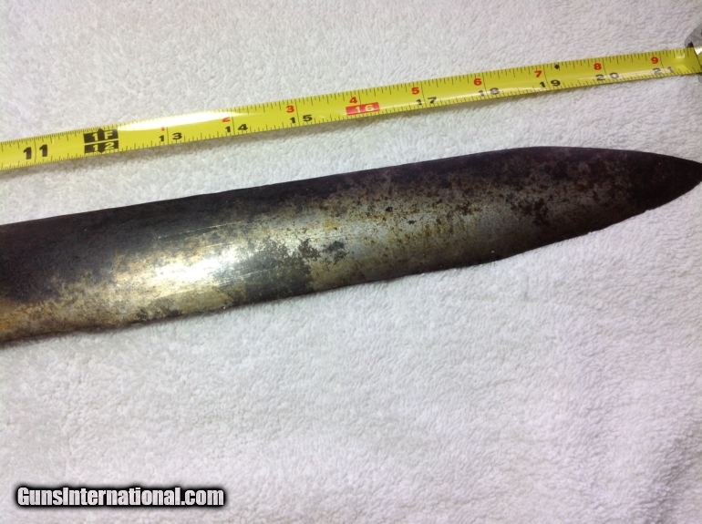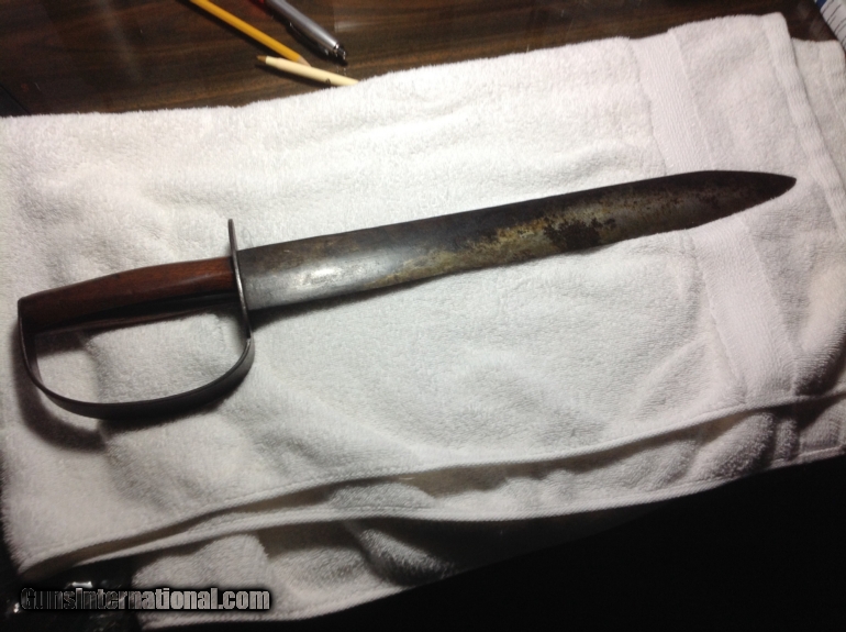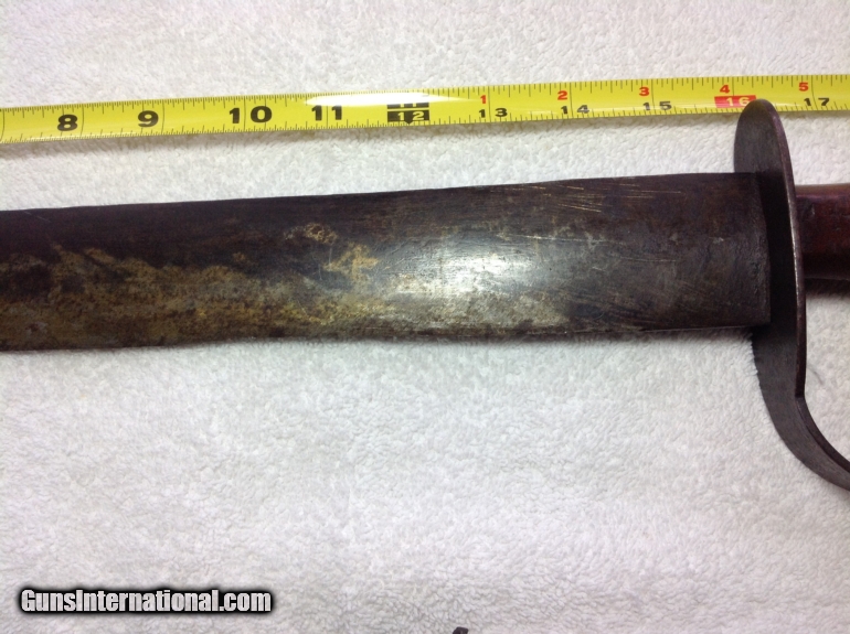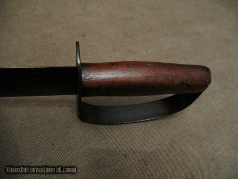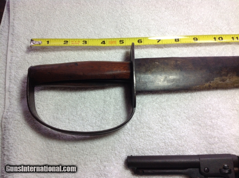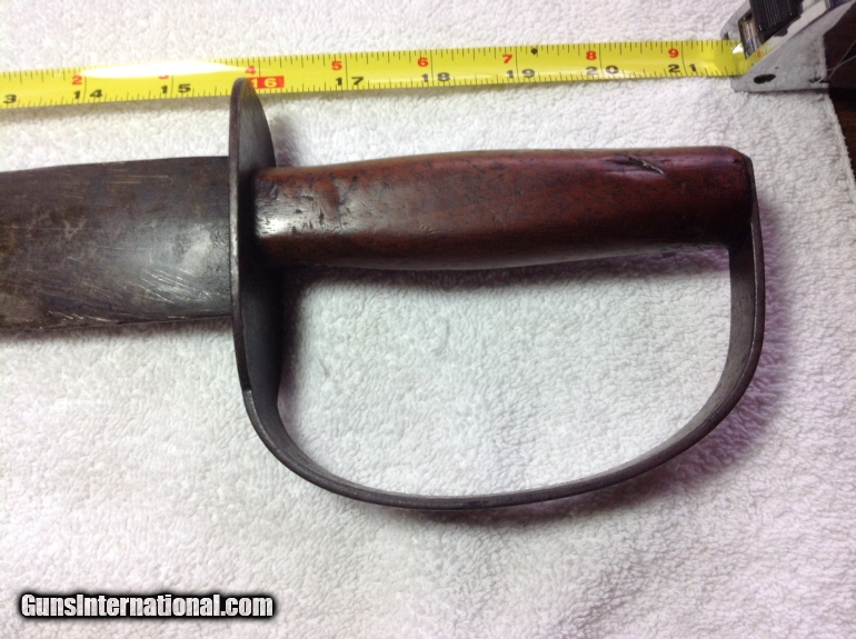 Description: Untouched Kennansville Confederate States Armory Arsenal Made Louis Froelich D Guard. 21 inches long. Untouched Blade approximately 16 inches long and almost 2 inches wide. No flea bites in the blade at all. Missing part of the wood handle. See page 42 and 43 of The Confederate Bowie Knife Guide by Lee Hadaway for a picture of a clipped point version of this D Guard. More photos available upon request. SOLD |