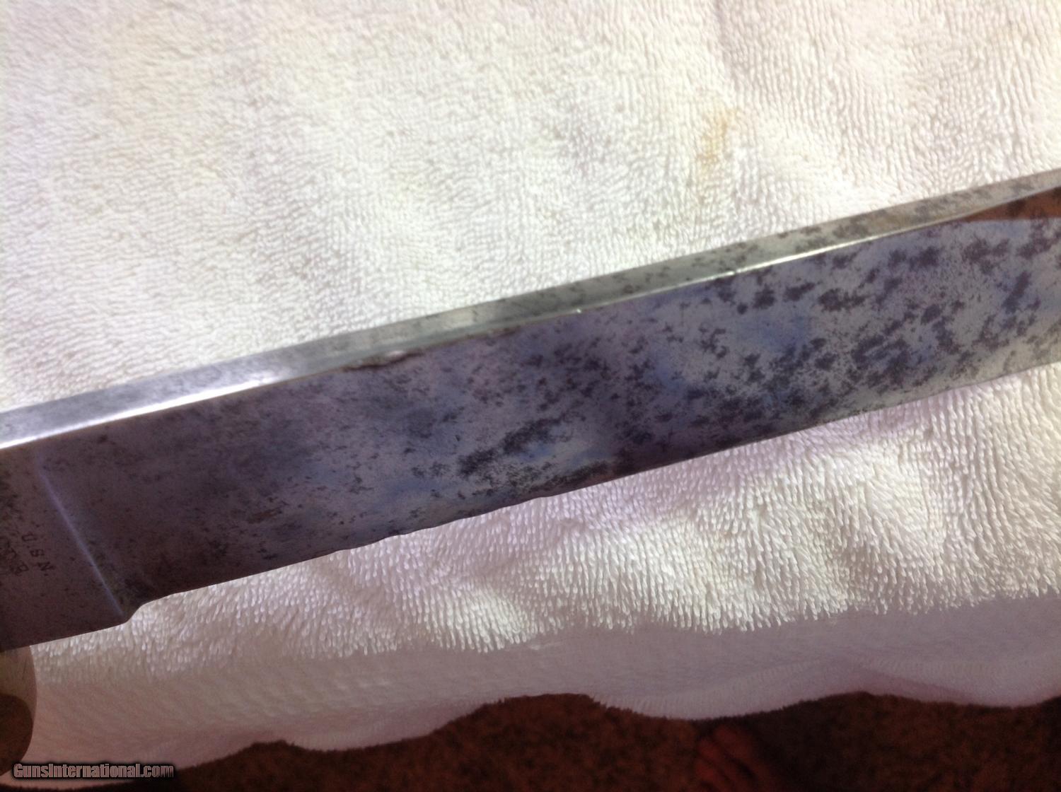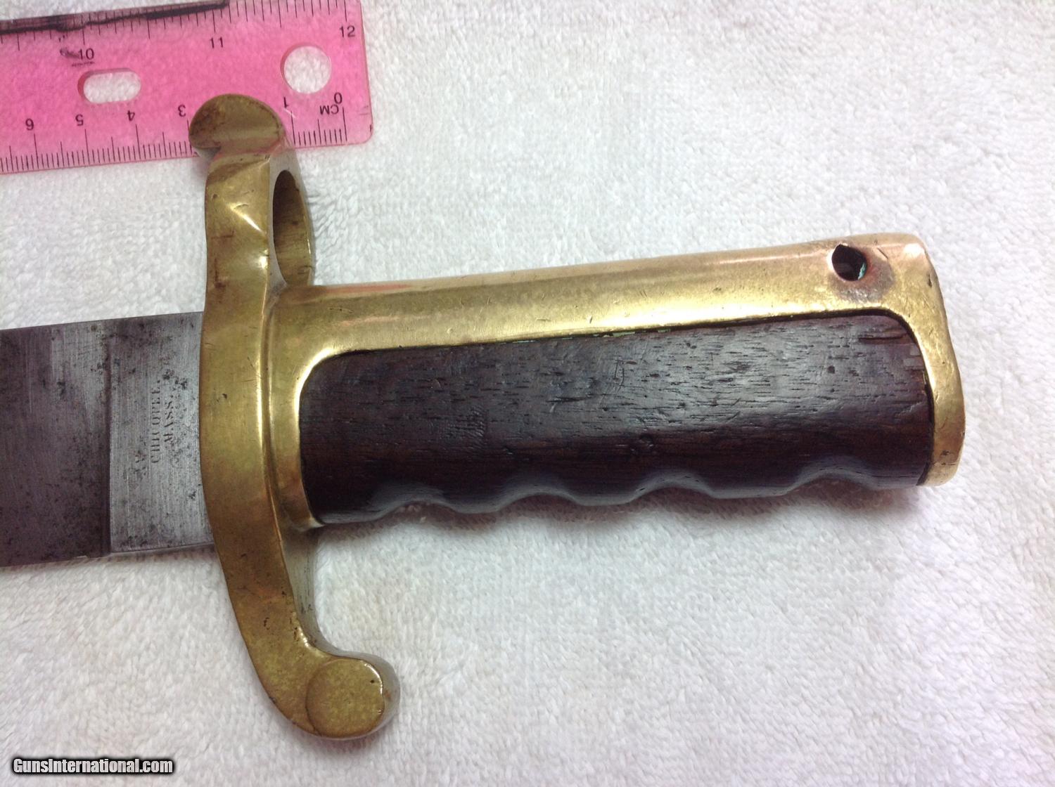 Description: Very nice authentic Civil War Dahlgren Bowie Bayonet dated 1863. Blade is in very good condition with a couple of flea bites that do not detract from its appearance at all and demonstrate that is was period used. Metal is mainly shiny grey with some age spotting. Detent pin and latch is missing. All of the right markings in the correct font of the period. USN DR 1863 on one side and can make out AM (cannot see the E or the S) Chicopee. Mass. on the opposite side. DR inspection mark on pommel. Blade measures at 11 3/4 inches and over 1/4 inch thick at the spine. Handle is just over 4 1/2 inches. This is a solid beefy Bowie with no play in the blade or handle. Priced right. More photos available upon request. Bought this one from the Pirates Lair site. Still showing the same knife on theirsite last time I checked. I just bought another one and cannot keep both of them. I have owned three of these and this is the best one. SOLD |