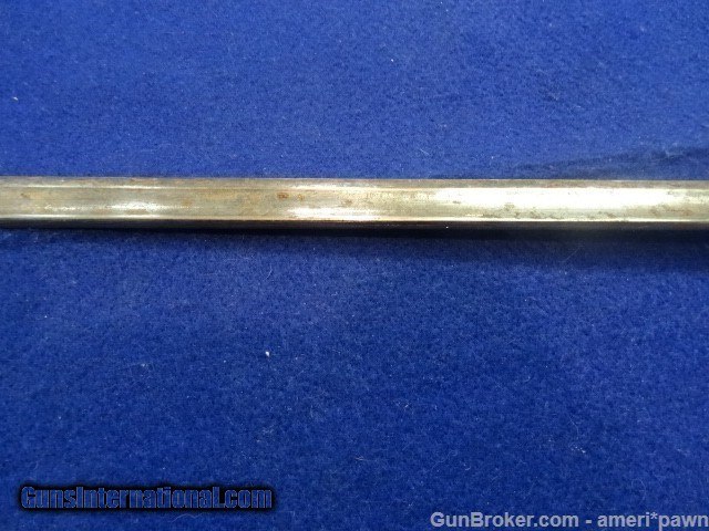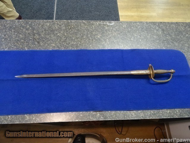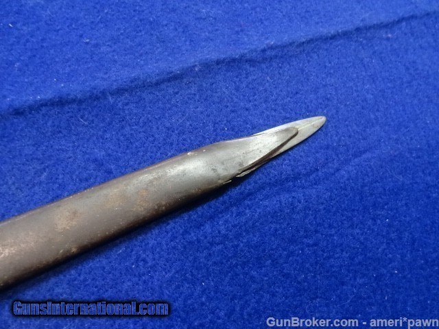 Description: A mid war(1863)Union NCO sword by Emerson and Silver.The marks on the hilt are clearly visable,as is the DFM inspectors mark on the hilt and the guard.The sword has some tarnish and oxidation,and we have made no attempt to clean it. The scabbard shows some damage,a missing hook and drag.Please look at the pictures provided.The sword is priced accordingly.We can ship this sword anywhere in the lower 48 states for $25.00. SOLD |