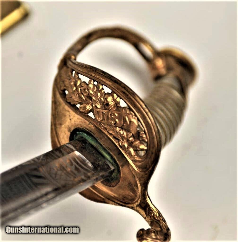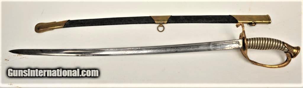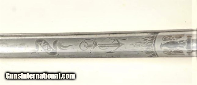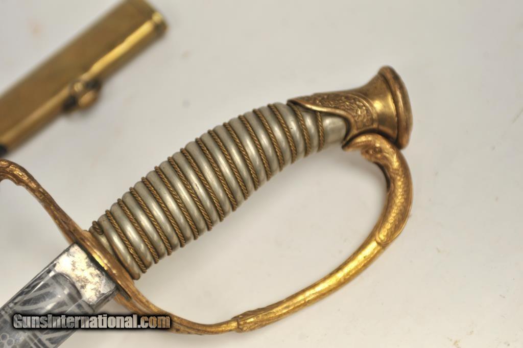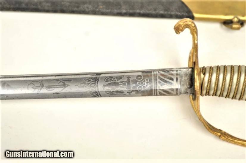 Description: Stunning U.S. Naval Officer’s sword with fancy pewter grip and etched blade marked “Wm. Horstmann & Sons, Philadelphia”. Showing dolphin on guard and eagle on top of the pommel, acorns and piercing on single branch hilt. The custom etched blade presents a stands of arms and “U.S.N” on banner, fowled anchor, stars, scrolls and Horstmann Logo on one side, The Powerful American eagle and similar motifs on reverse with iron proof at top of the spine. The blade is about excellent with frosty etching and remarkably has original polish. Etching extends 16” from hilt down blade of 28 ½” and 35” overall. The rare Original scabbard is sharkskin with the proper mounts which are marked “48” in small die stamps. This is a Magnificent Historic sword by one of the Worlds finest and most famous retailors a beauty that is in the excellent cared for condition that Collectors are always searching for but rarely find, These type of artifacts are becoming more and more scarce as time goes by and folks are understanding it is far better to own a piece of History then losing money every hour in a bank. It will make for a Fabulous display now for you to enjoy and a wonderful Legacy to leave for your very grateful Heirs. SOLD |