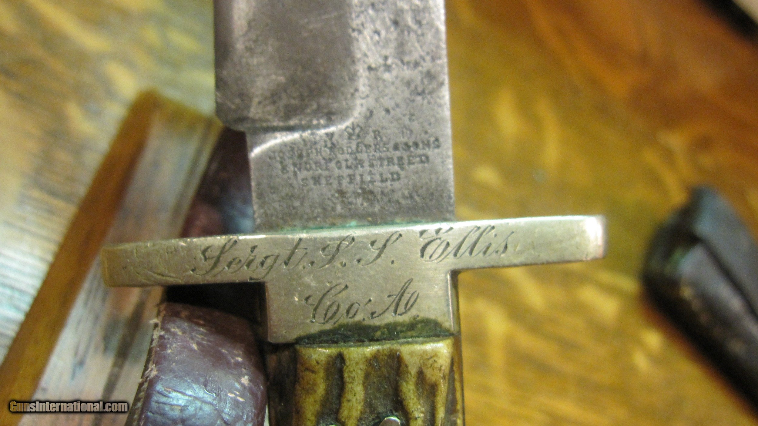 Description: A beautiful Bowie style side knife with a clip point blade, made by Joseph Rodgers and Sons of Sheffield England. 10 5/8' overall lenght, 6 3/8" blade. Identified to Sgt. S. Ellis of Co. A 1st Maine Cavalry. A complete binder of his records are included. Great Civil War history. He was taken prisonerat Brandy Station on 9 June 1863 and paroled 13 July 1863. The unit was in 136 engagements through out the war. Beautiful inscription on knife. Metal scabbard is leather covered. Identified side knives are fairly rare. Please call 973-214-3407 with questions SOLD |