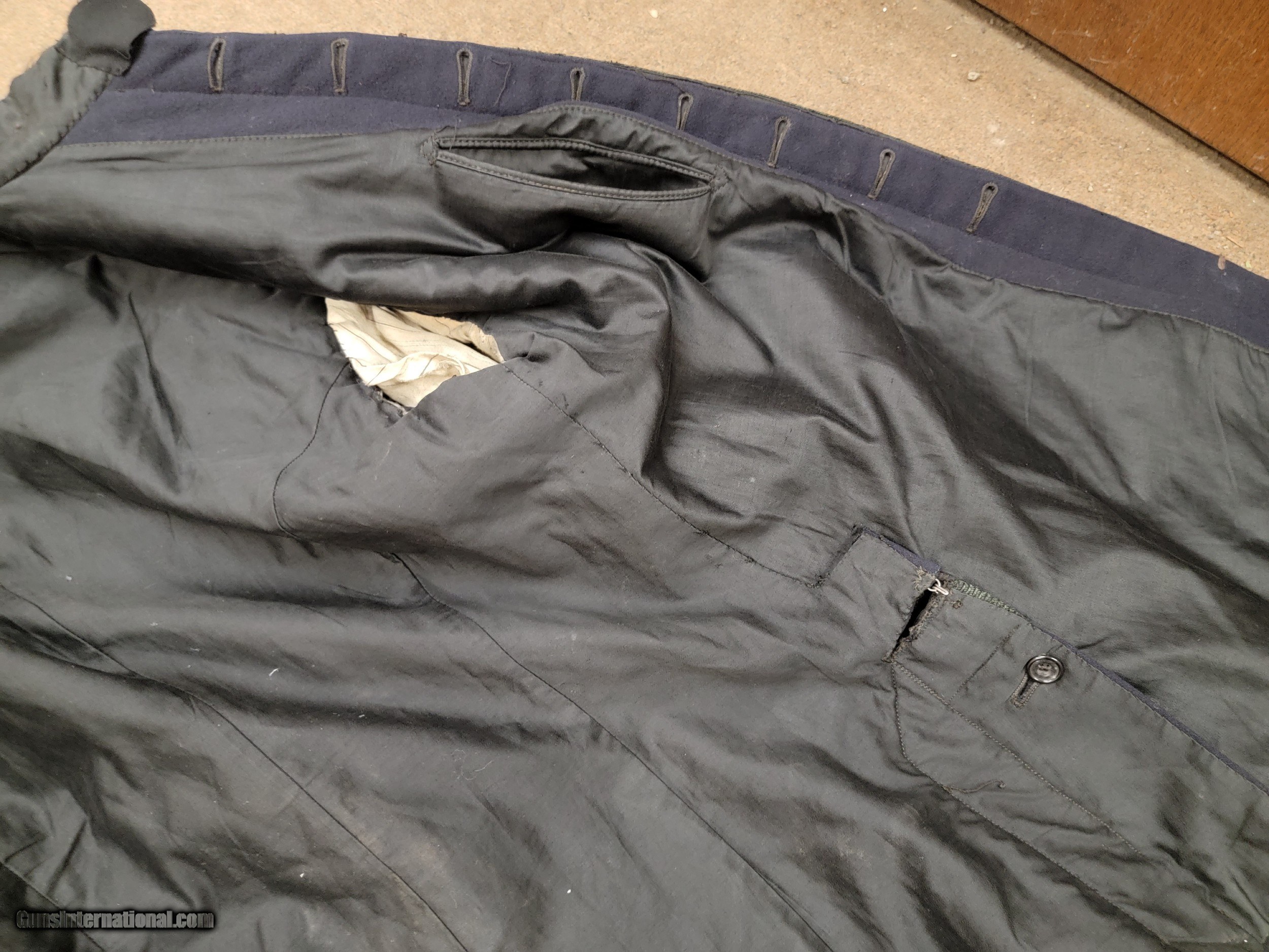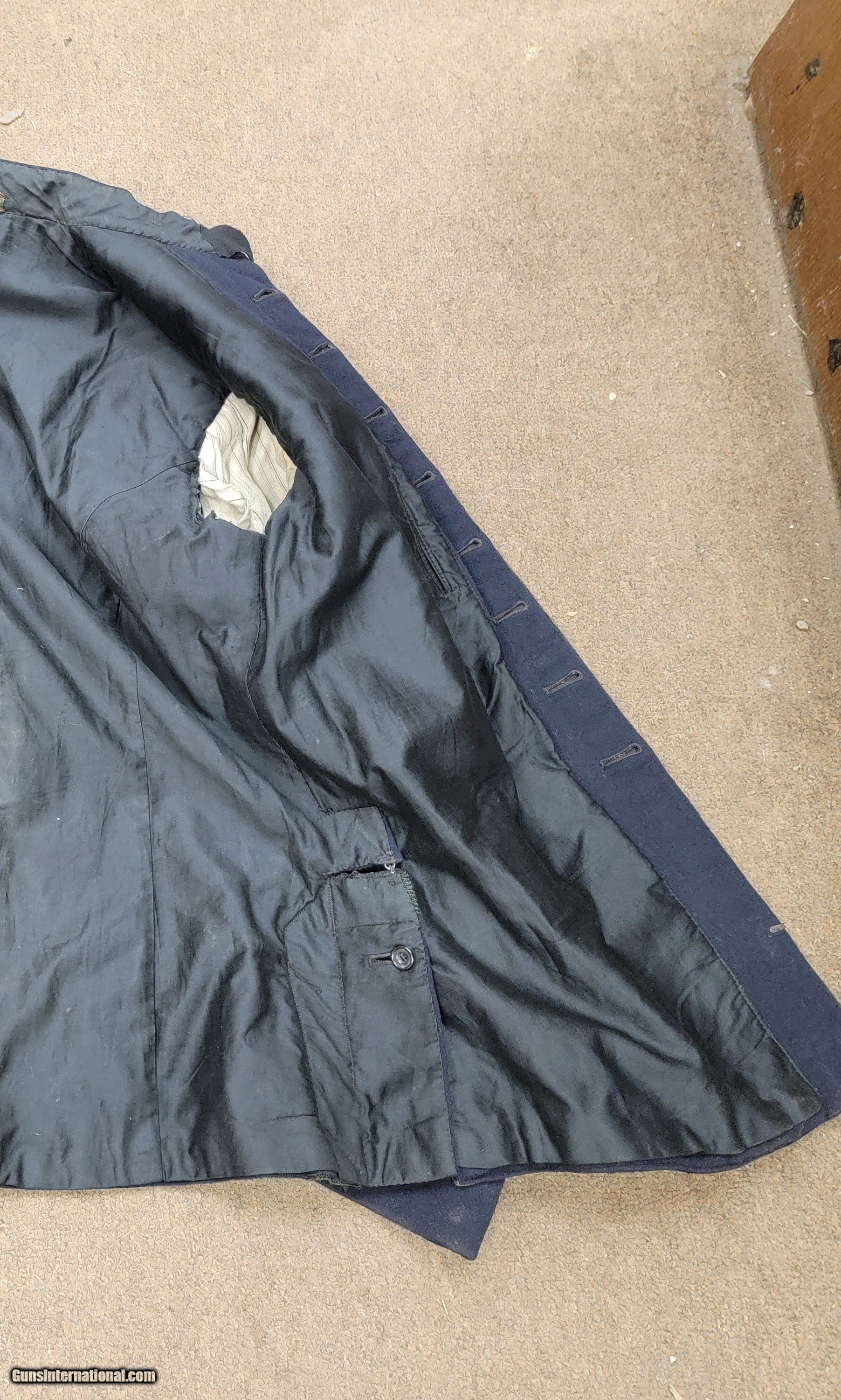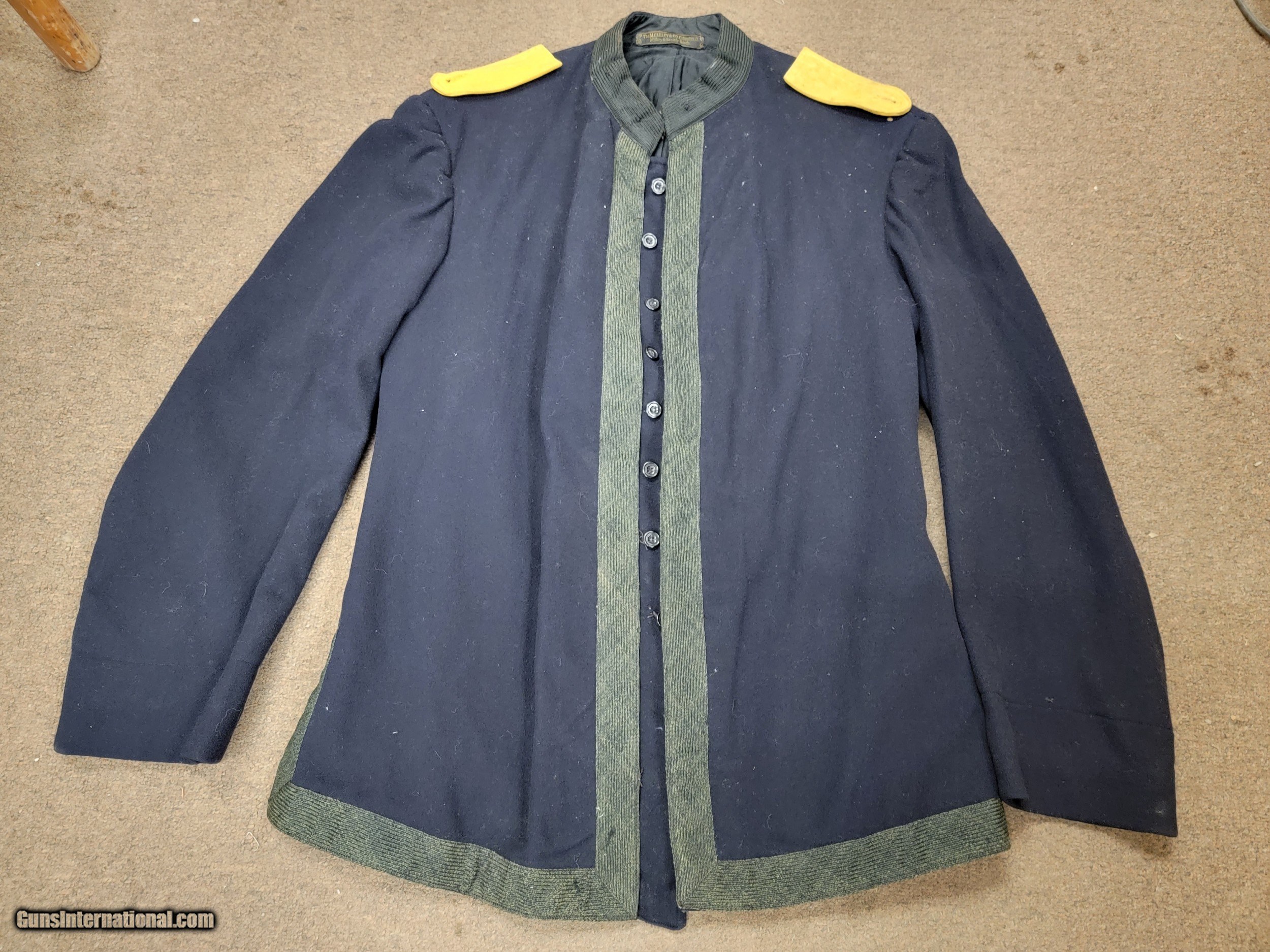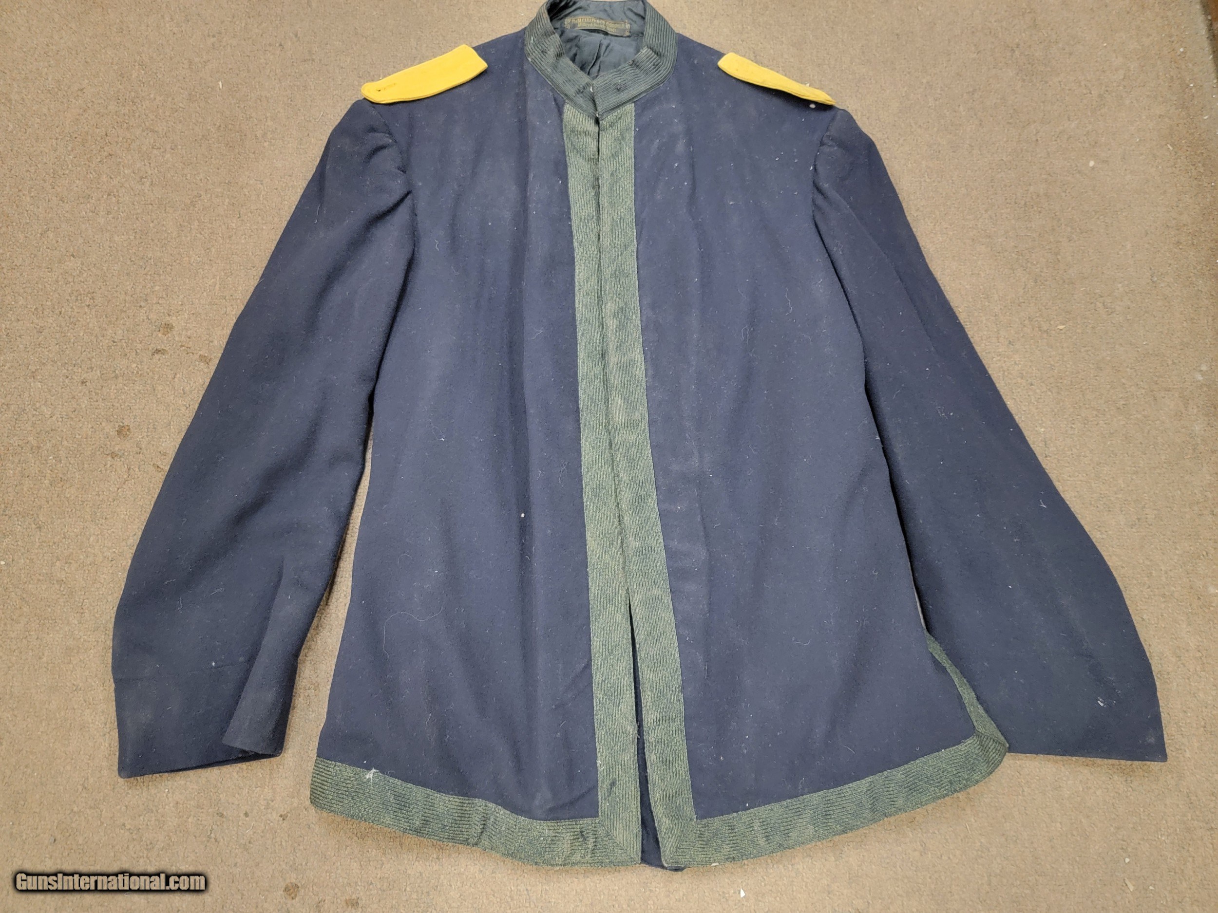 Description: A rare Indian wars era tunic Guaranteed original 1880's / 1890's, U.S. Blue Army / Cavalry tunic. This tunic is in great condition. The Blue and green colors are excellent and vibrant.....not faded much, if at all....a little dusty. No rips or loose stitching, just a couple of moth nips smaller than a pea. This tunic was probably used by a Adjutant(officers personal staff). soldier probably working on his Cavalry promtion / boards.( note no sewing or buttons). The Cavalry boards(found inside a pocket) would make the uniform correct for promotion to Cavalry 2nd leutenant. A rare, rare find that will make a fabulous addition for any Western, Indian wars era display. Offers welcome. Mark 315 214 9548 SOLD |