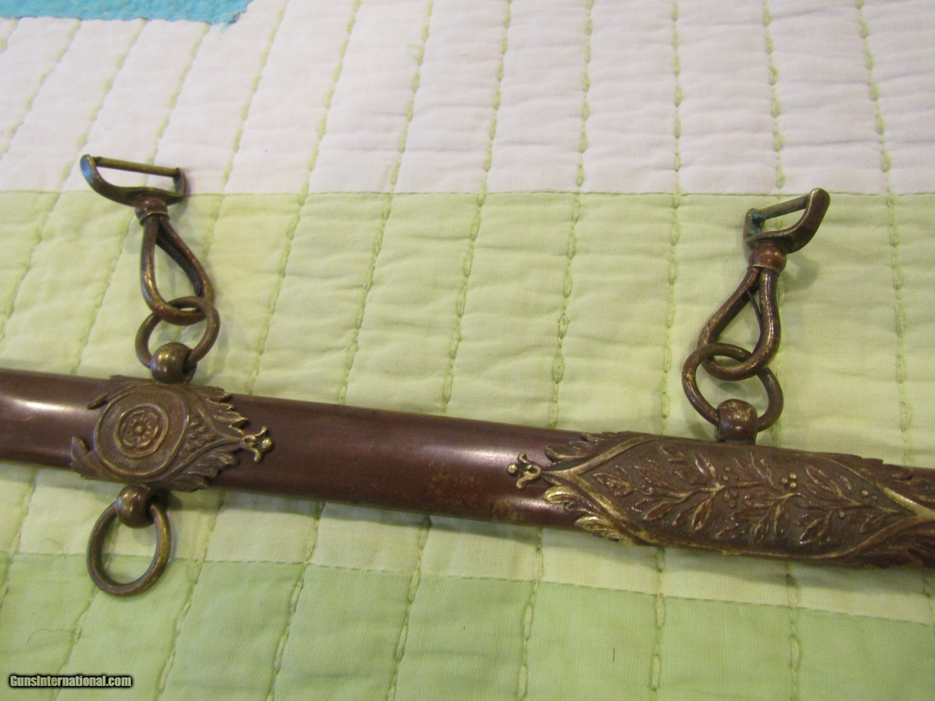 Description: This is a rare model 1840 that has the original rare hanger clips. The sword is one of the rarer makers Klingental , Coulaux & Cie, great patina ,way above good ,still has the red felt ring at the top of the blade. SOLD |